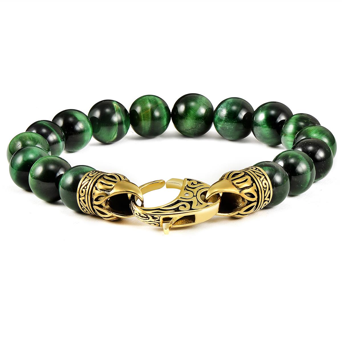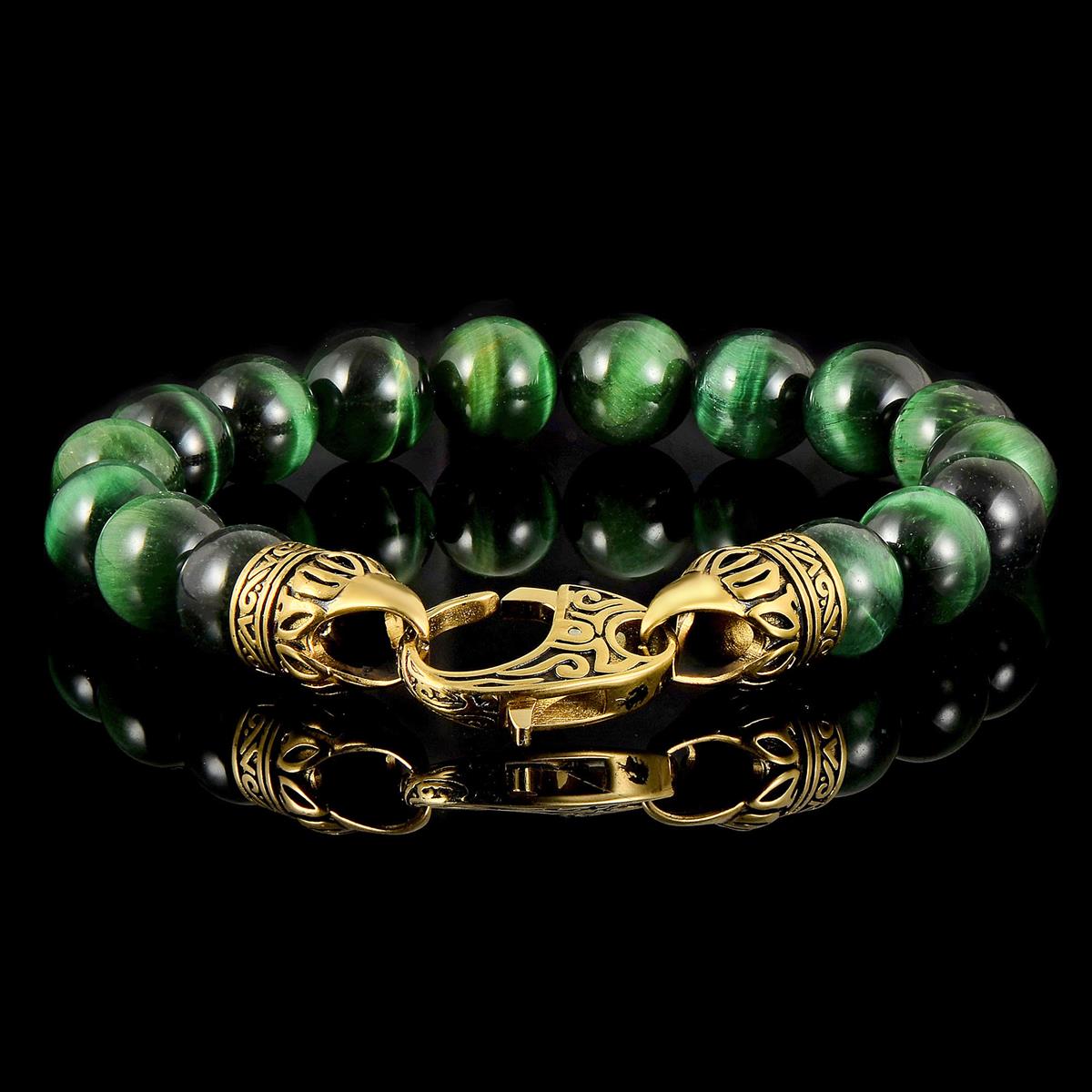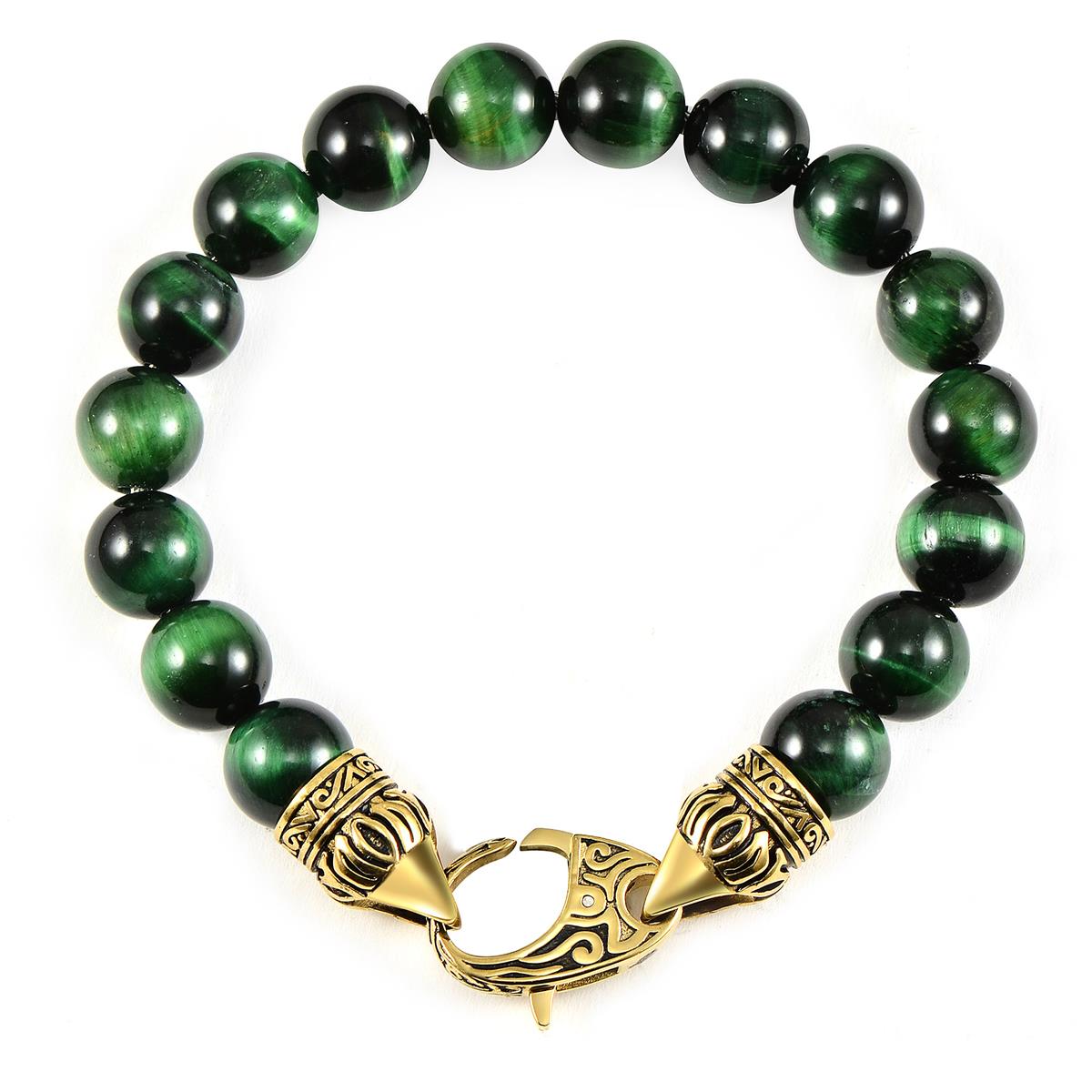 10mm Green Tiger Eye Bead Bracelet with Gold Plated Stainless Steel Antiqued Lobster Clasp
