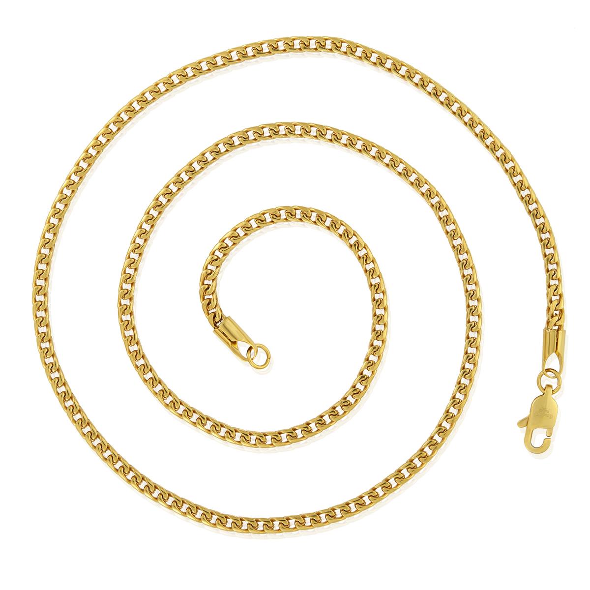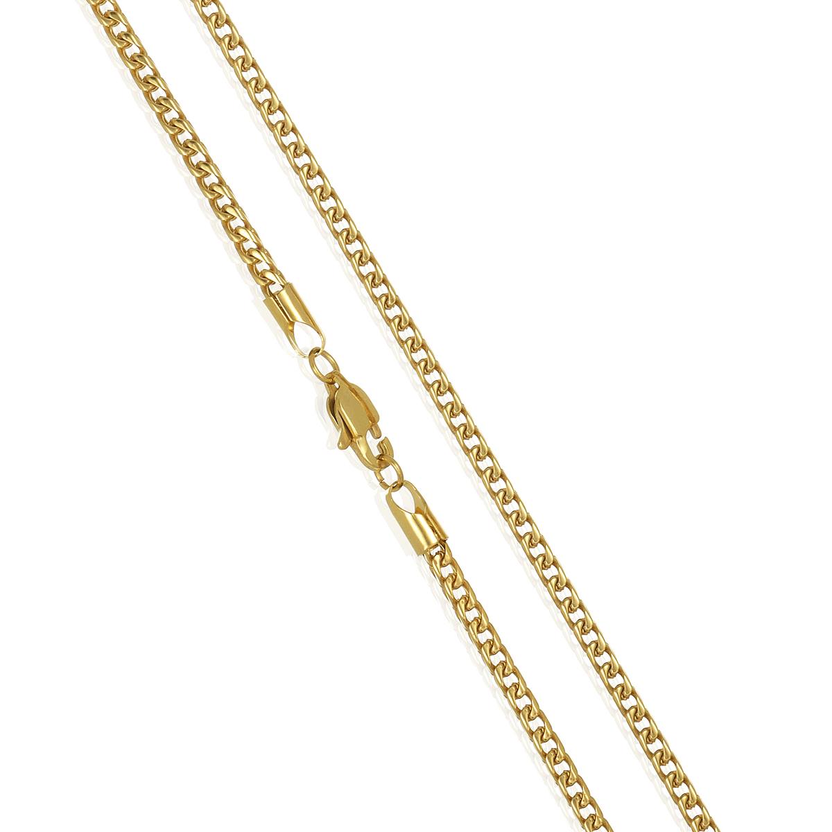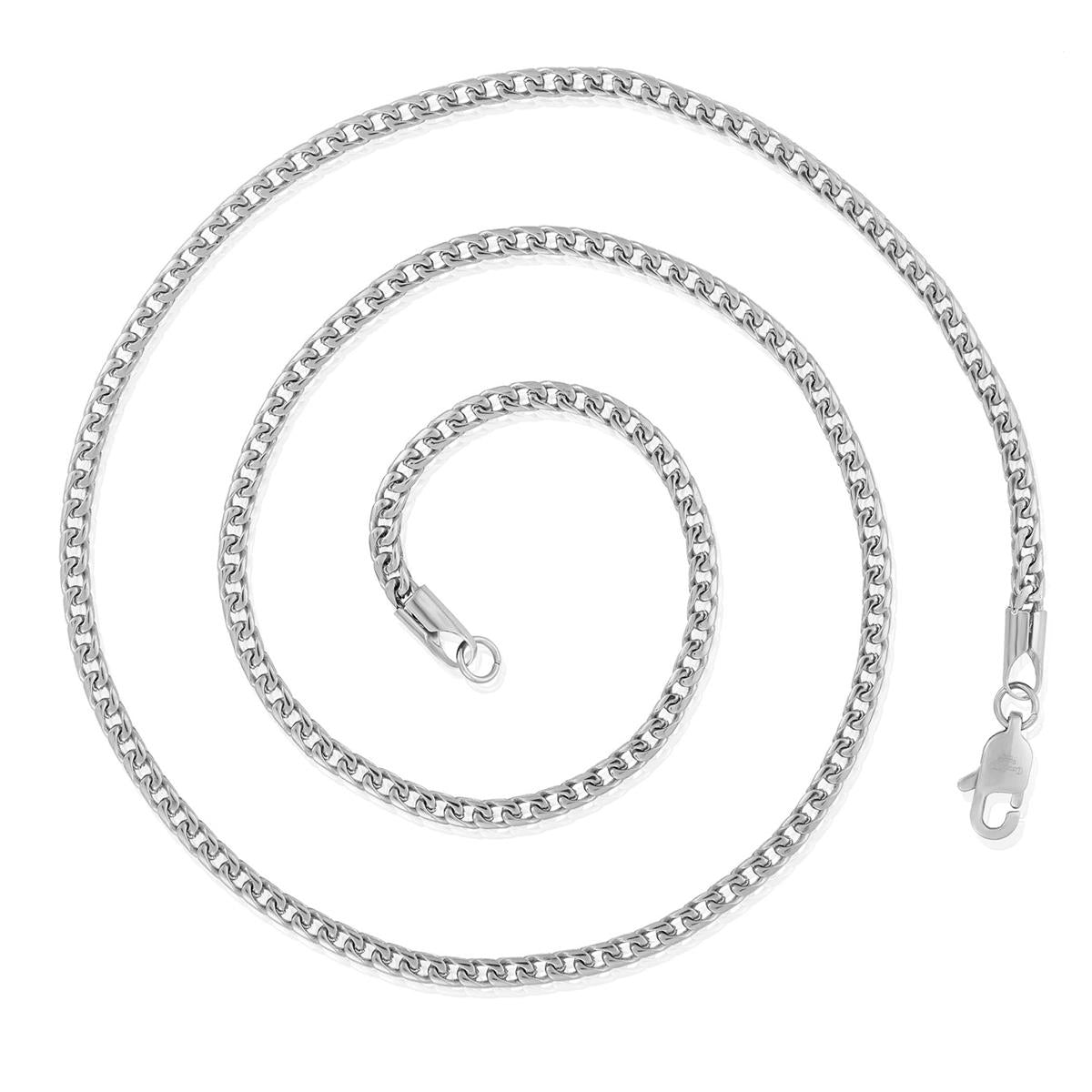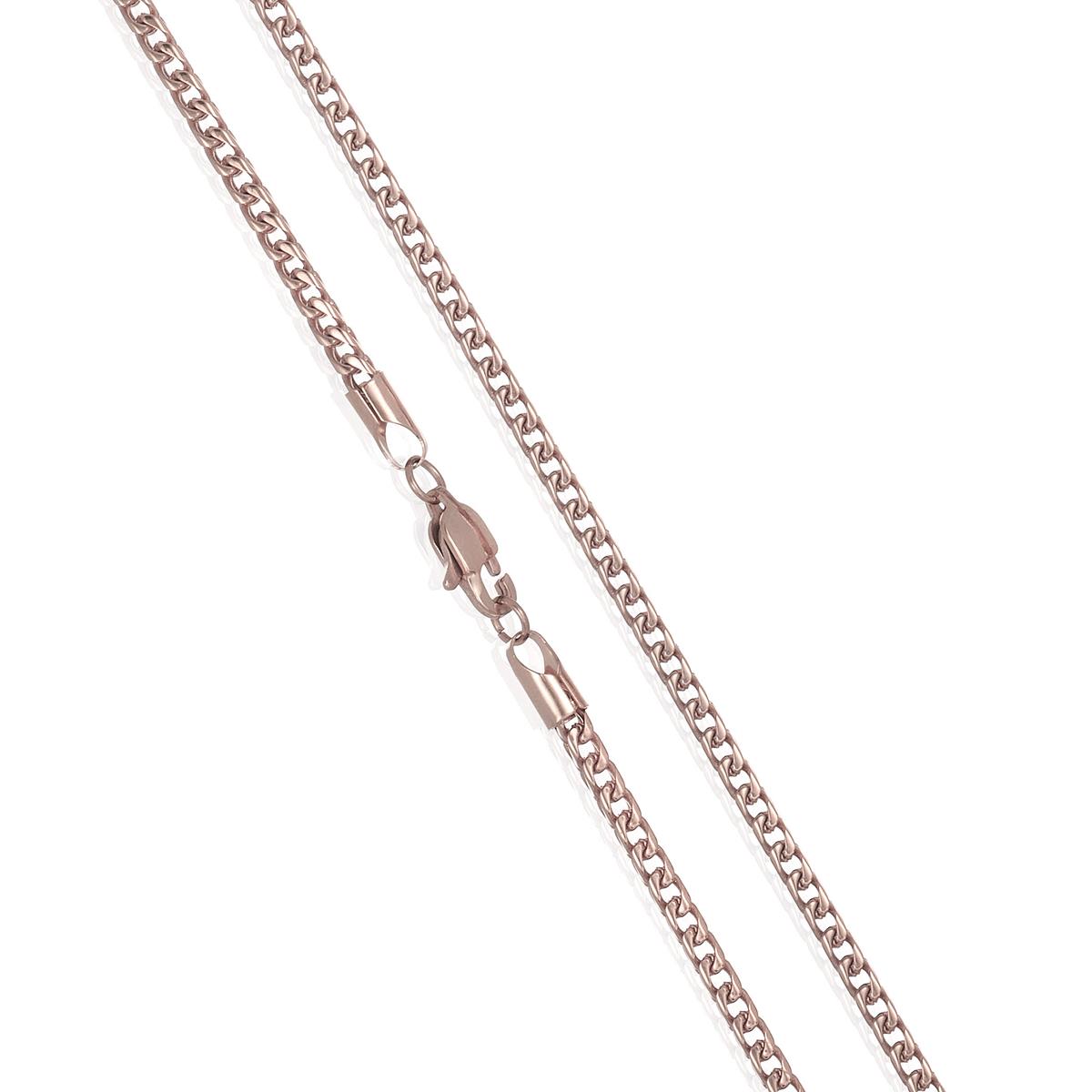 The chain necklace has an end to end length of 22 inches. The width of the necklace is 3 millimeters or 1/8 inches, and the thickness is 3 millimeters or 1/8 inches. The piece stays secure with a lobster clasp.