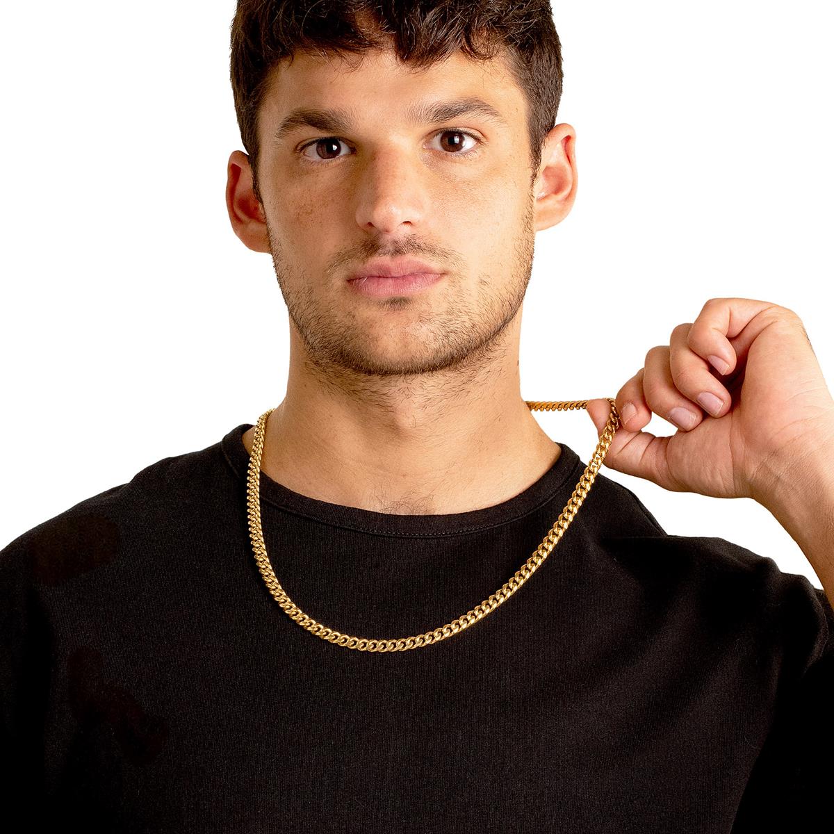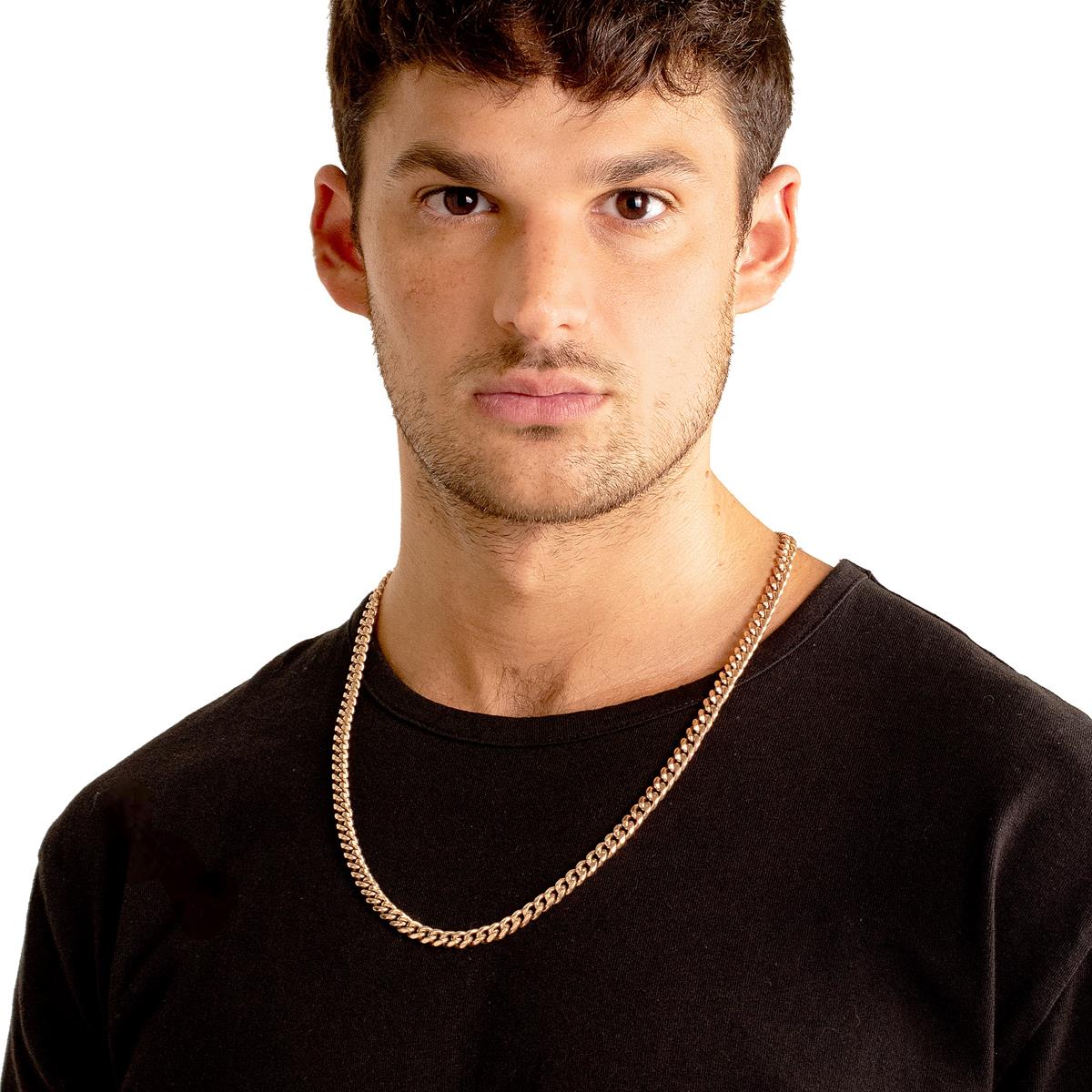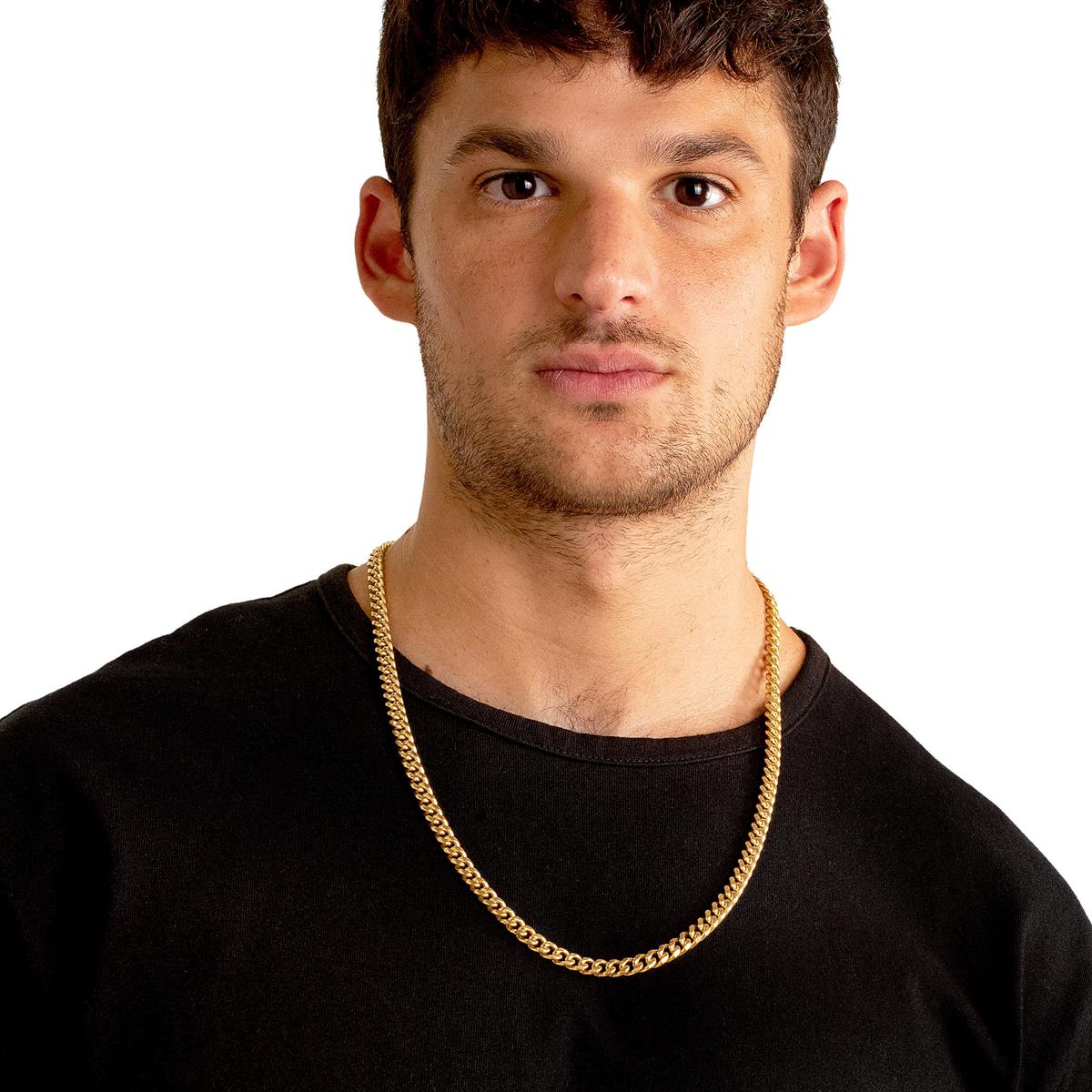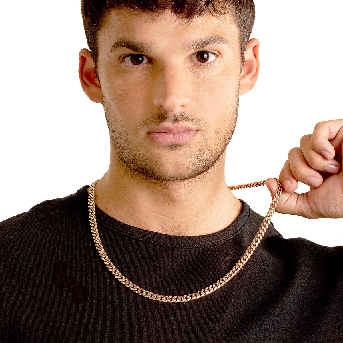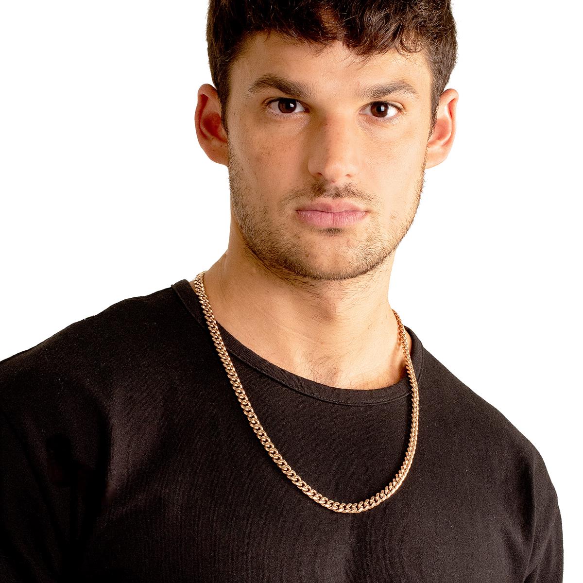 The chain has an end to end length of 26 inches. The width of the necklace is 7 millimeters or 1/4 inches, and the thickness is 3 millimeters or 1/8 inches. The Curb chain stays secure with a lobster claw clasp.