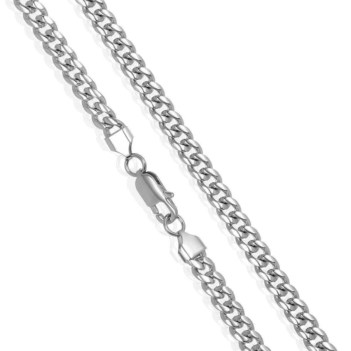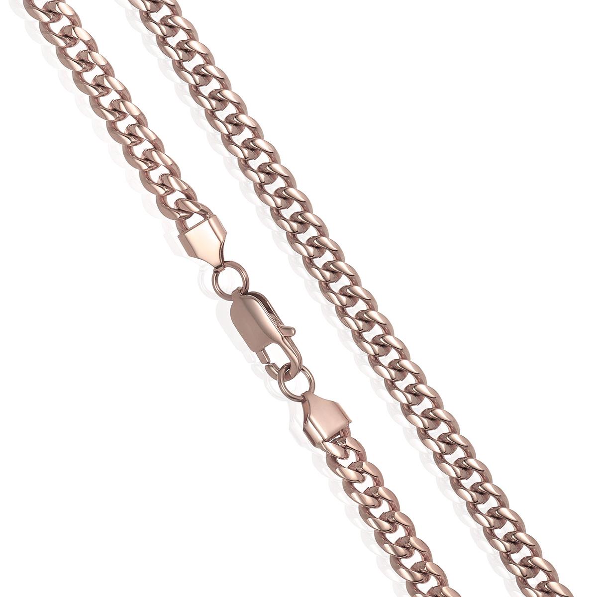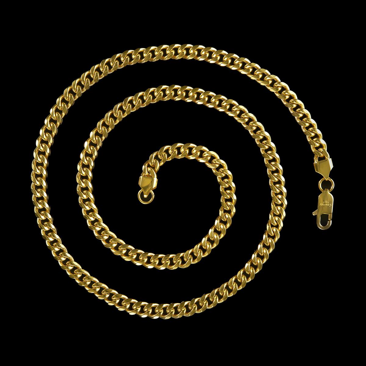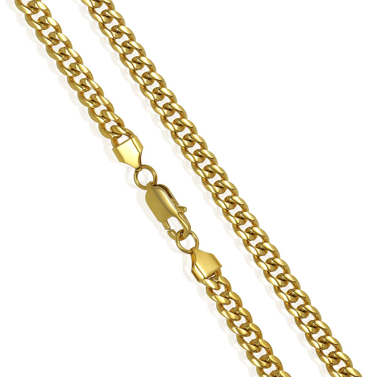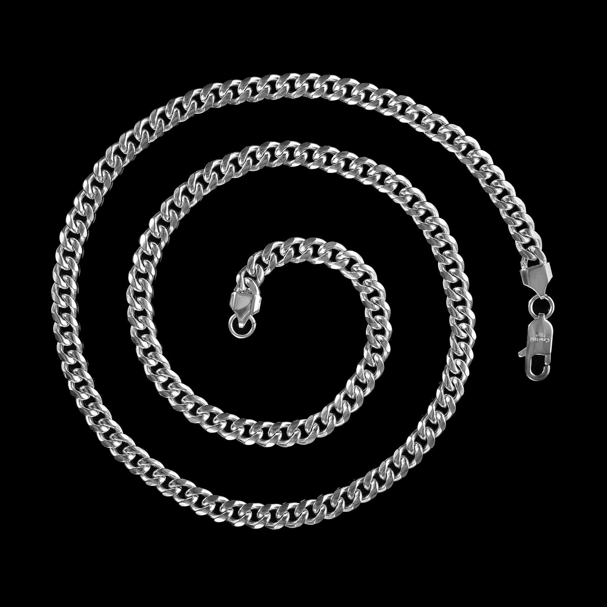 The chain has an end to end length of 26 inches. The width of the necklace is 7 millimeters or 1/4 inches, and the thickness is 3 millimeters or 1/8 inches. The Curb chain stays secure with a lobster claw clasp.