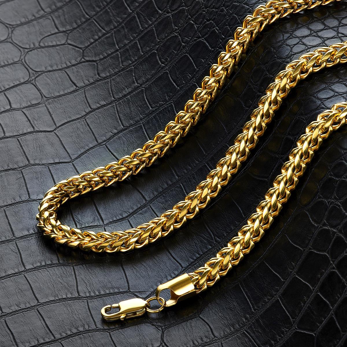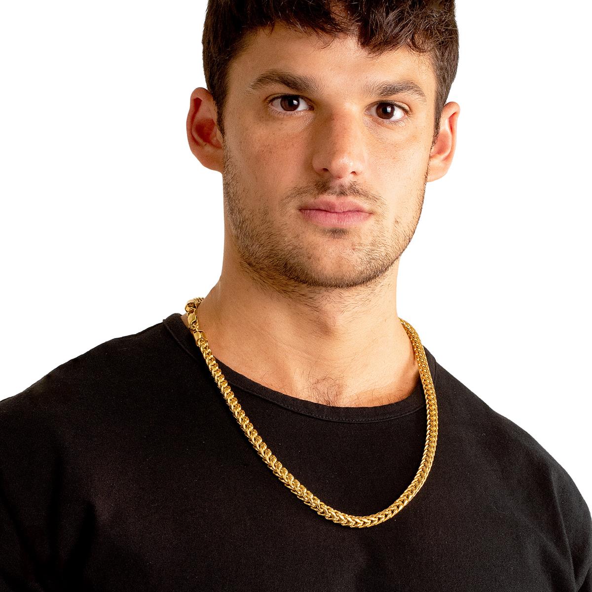The chain has an end to end length of 26 inches. The width of the necklace is 7 millimeters or 1/4 inches, and the thickness is 37 millimeters or 1/4 inches. The Franco chain stays secure with a lobster clasp.