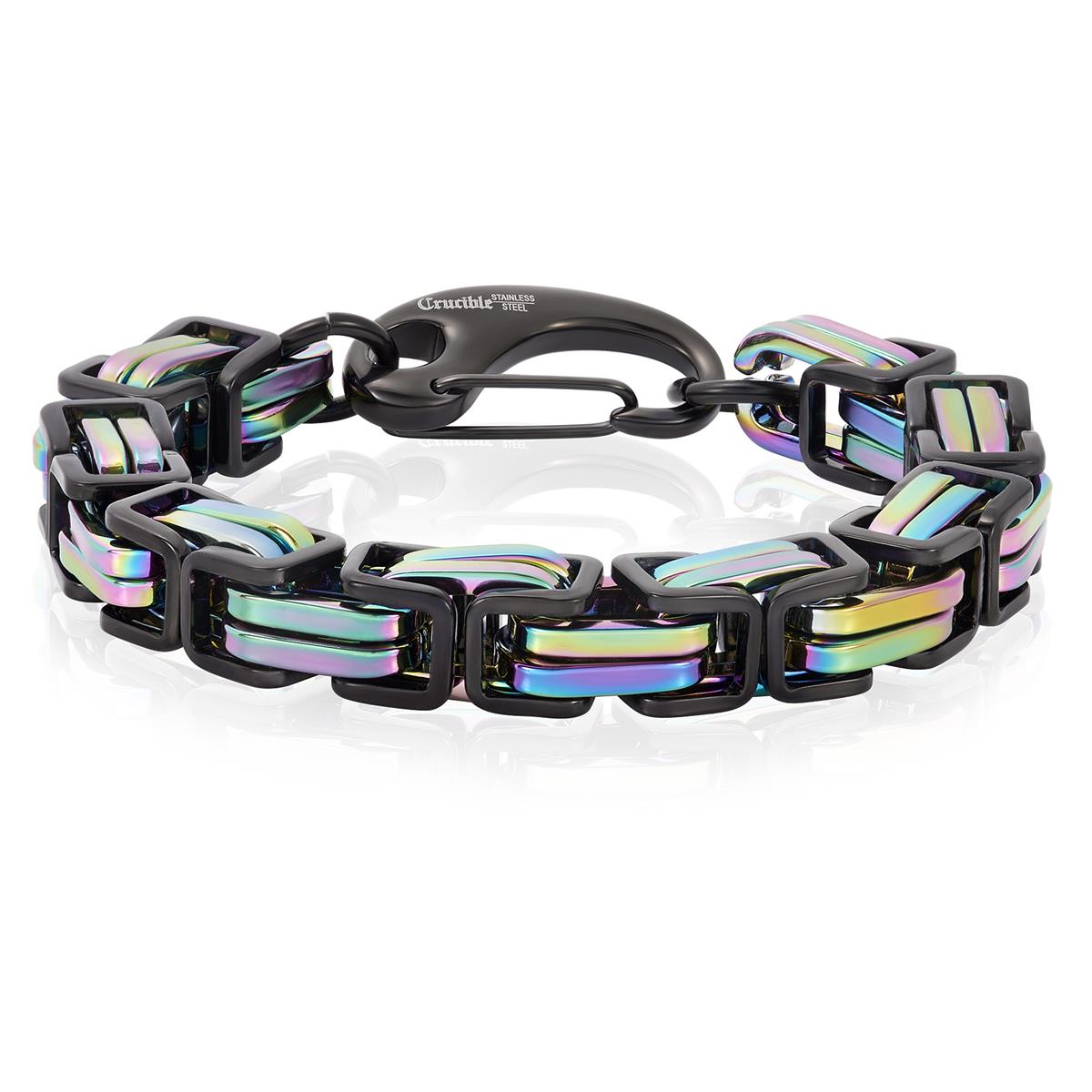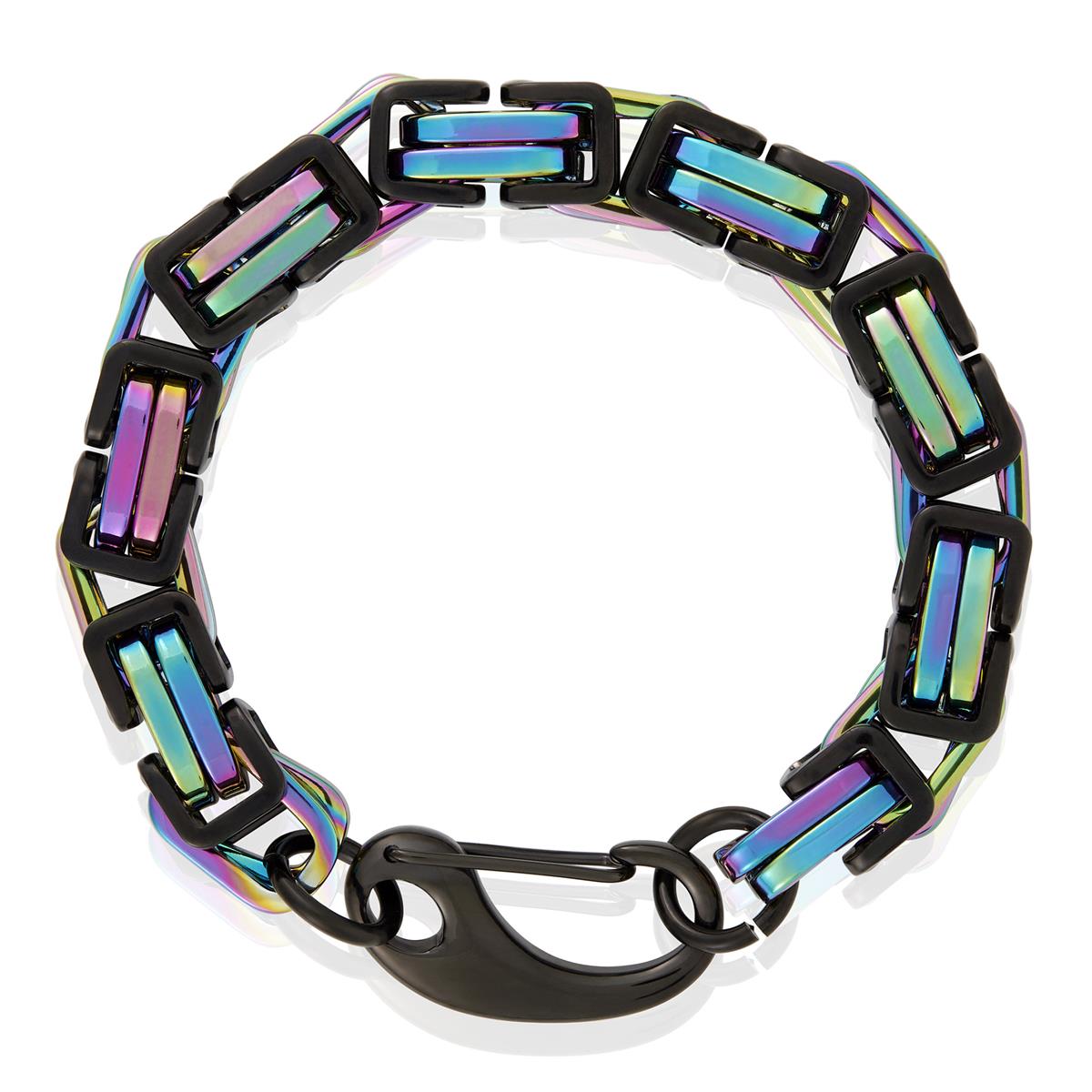 Add this stylish black and iridescent plated stainless steel Byzantine chain bracelet to your choice of daily wear. The byzantine chain offers a classic chain style yet modernized with a two tone design and an oversized clip lobster closure.
