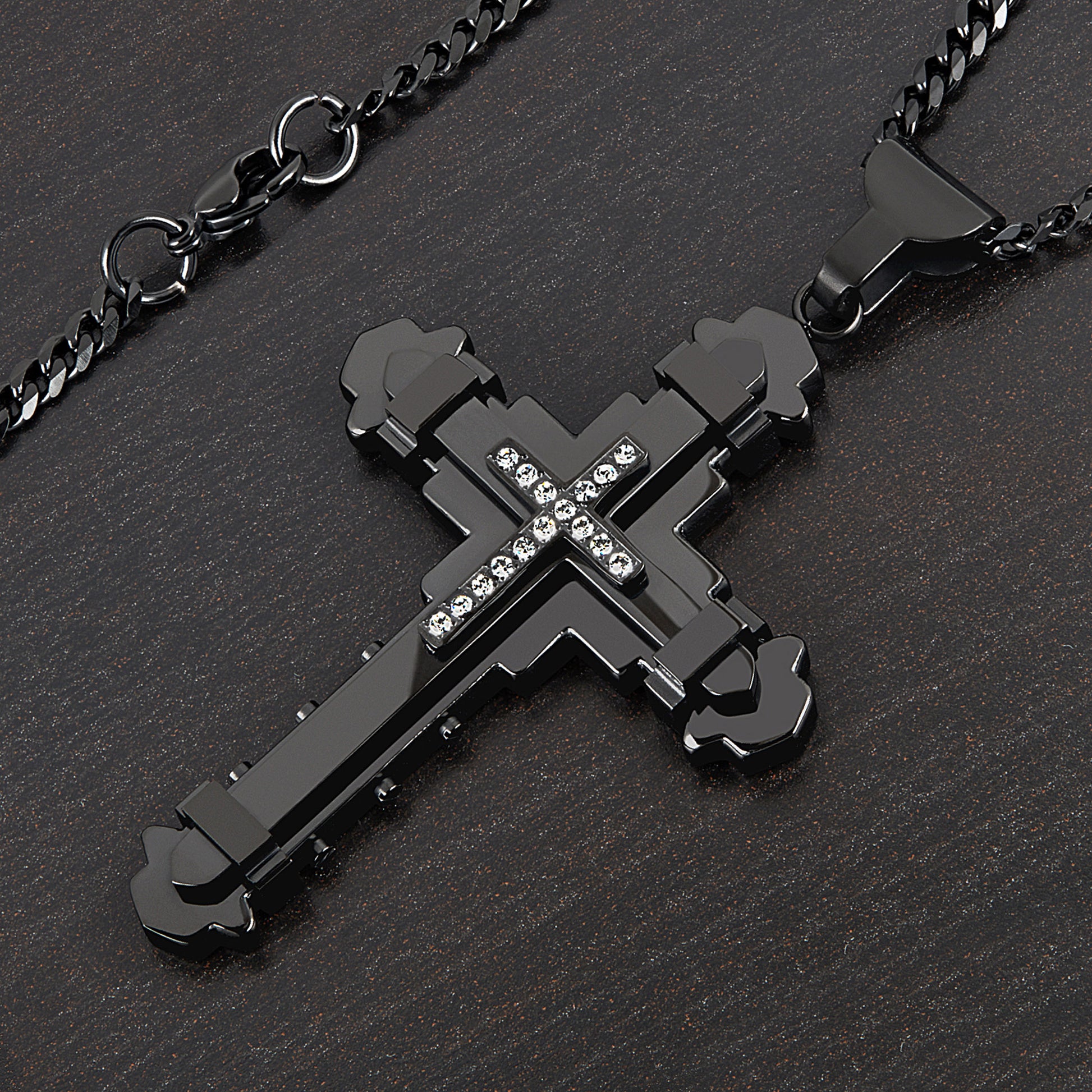 The pendant measures 62 millimeters long by 44 millimeters wide by 8 millimeters thick. Each stone measures 1.5 millimeters wide. Paired with the Cross is a 24 inch chain and secures with a lobster clasp.