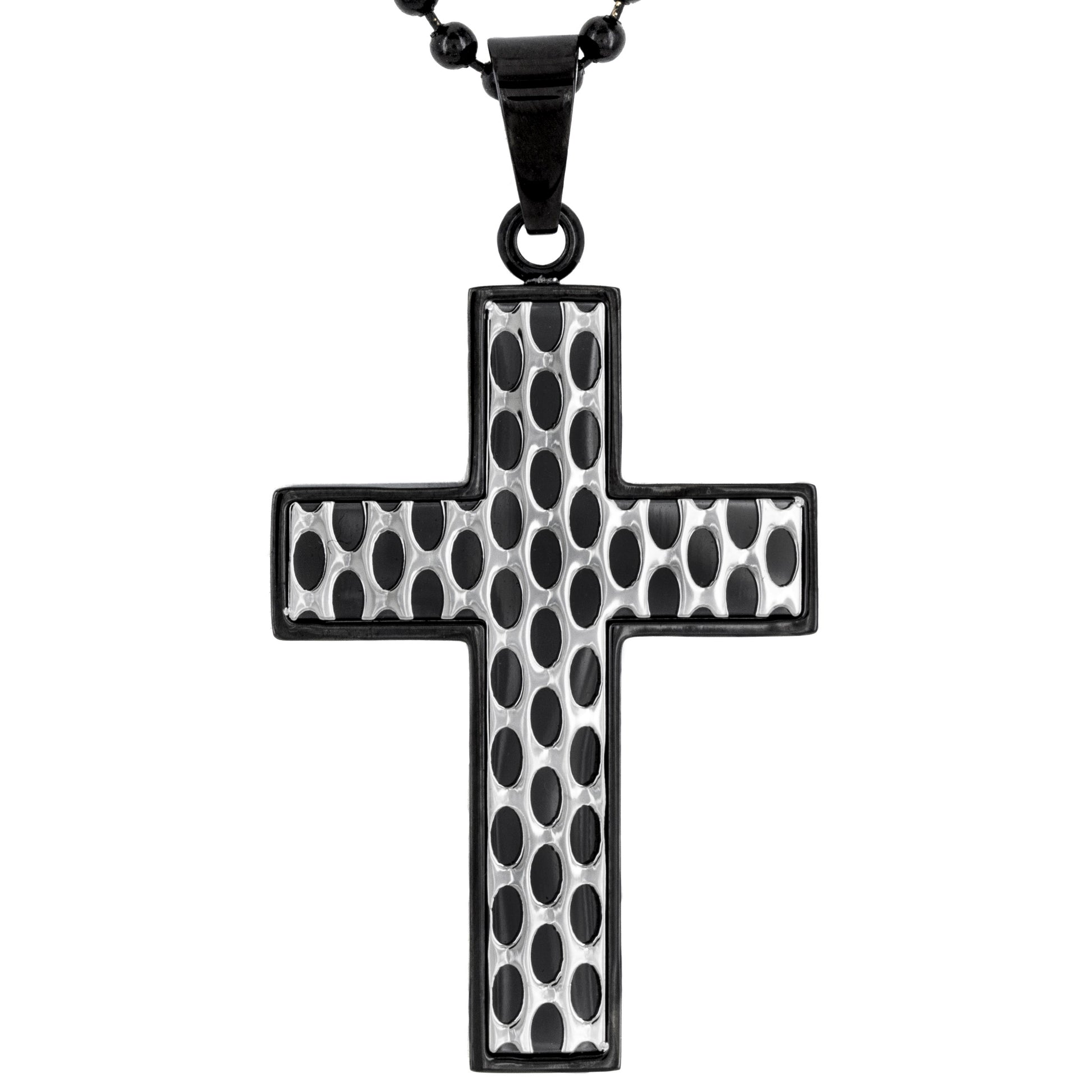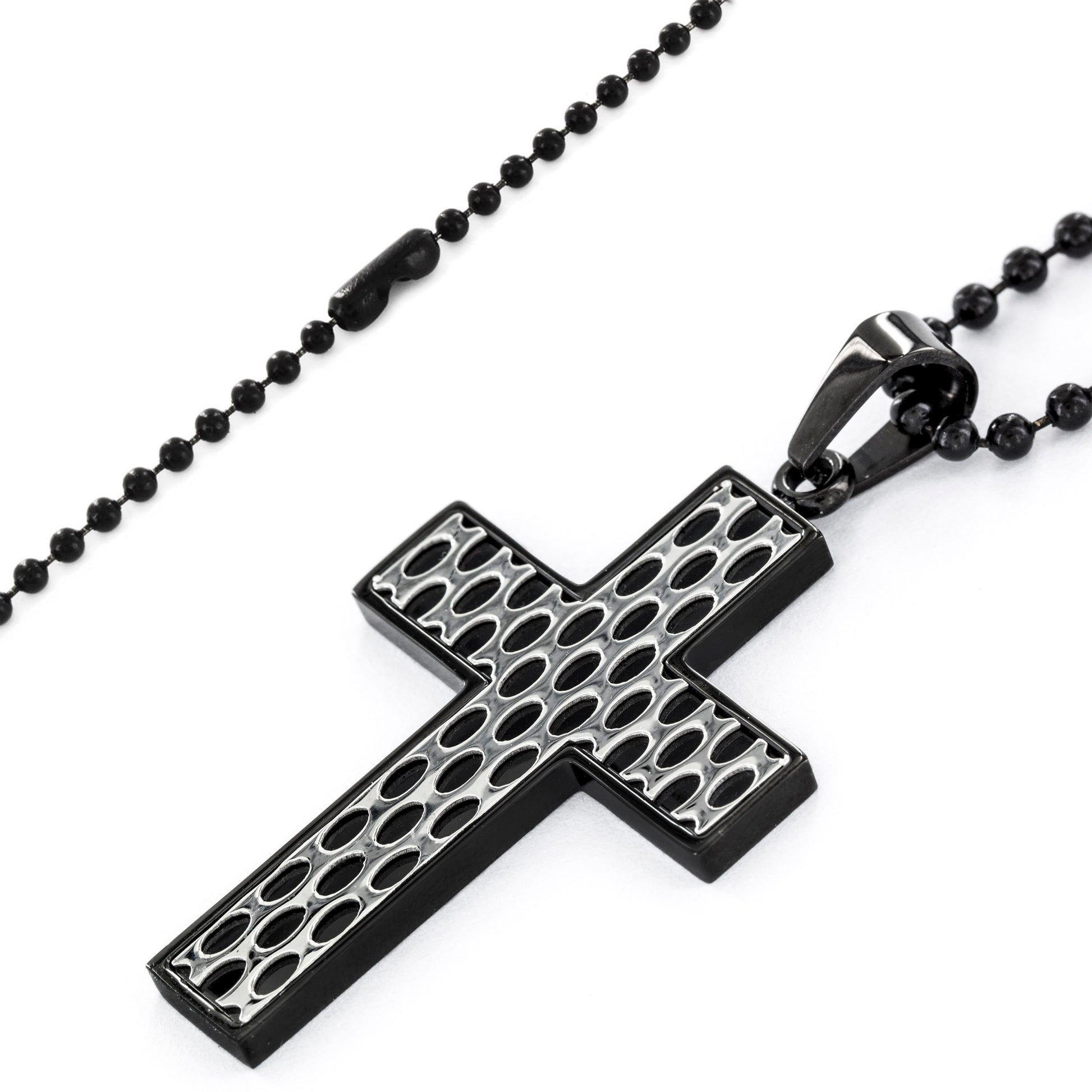 Graphic and modern, this pendant will showcase both your edgy style and your faith. The black plated cross is layered with a polished stainless steel oval pattern adding extra interest. Comes complete with a 24 inch black ball chain.