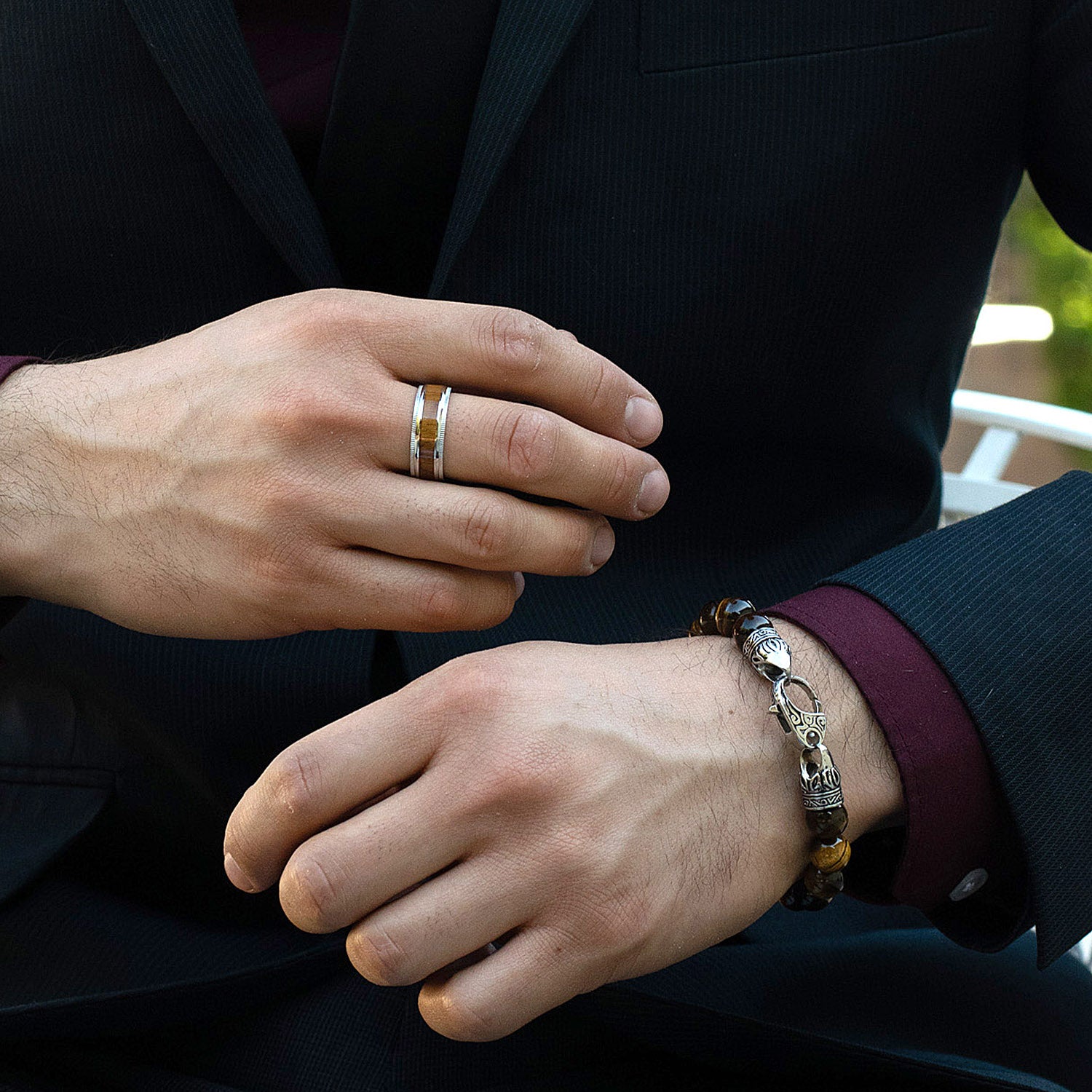 Stainless steel frames a beautiful wooden inlay for a distinct look. Complete with a comfort fit band, this ring is the perfect addition to your choice of daily wear.