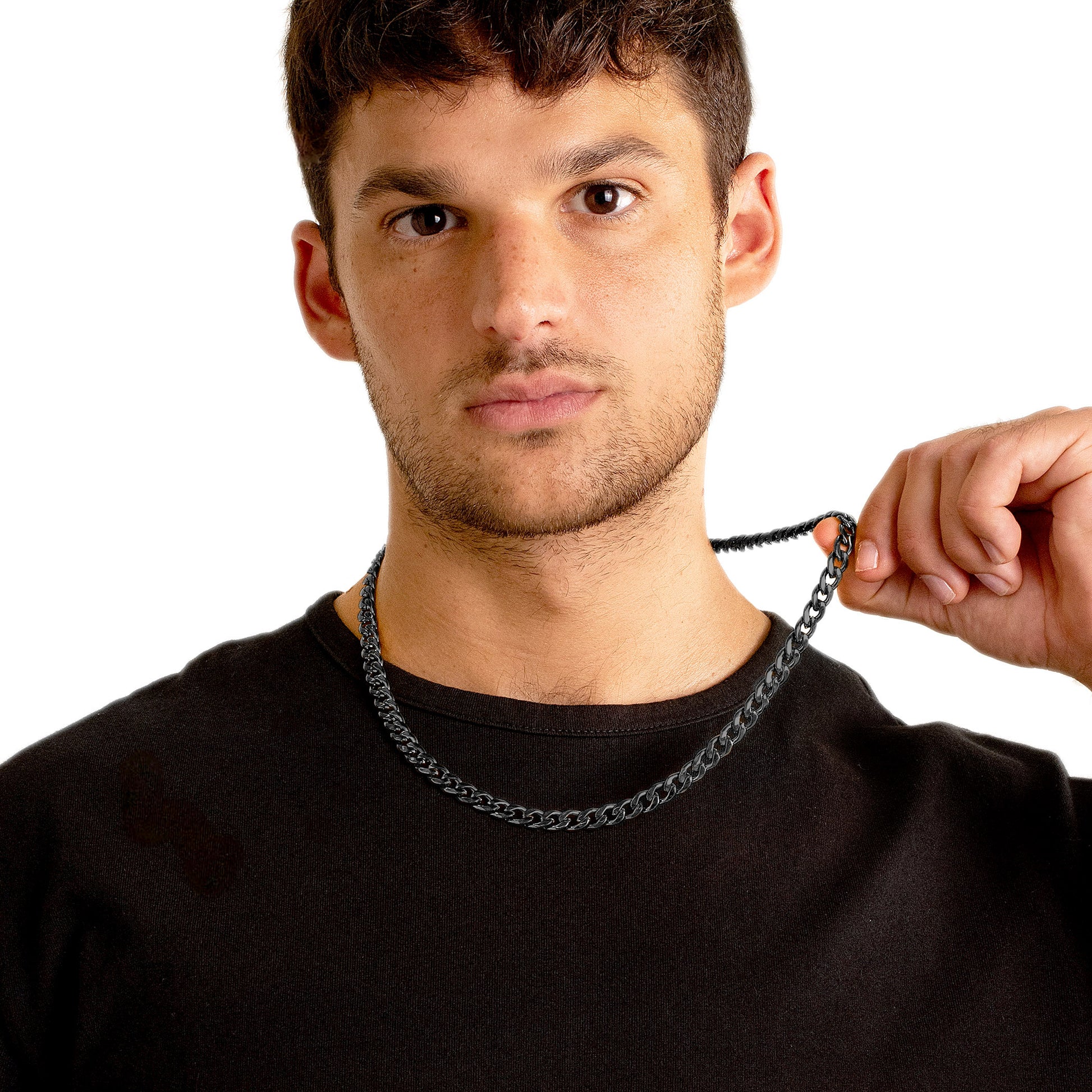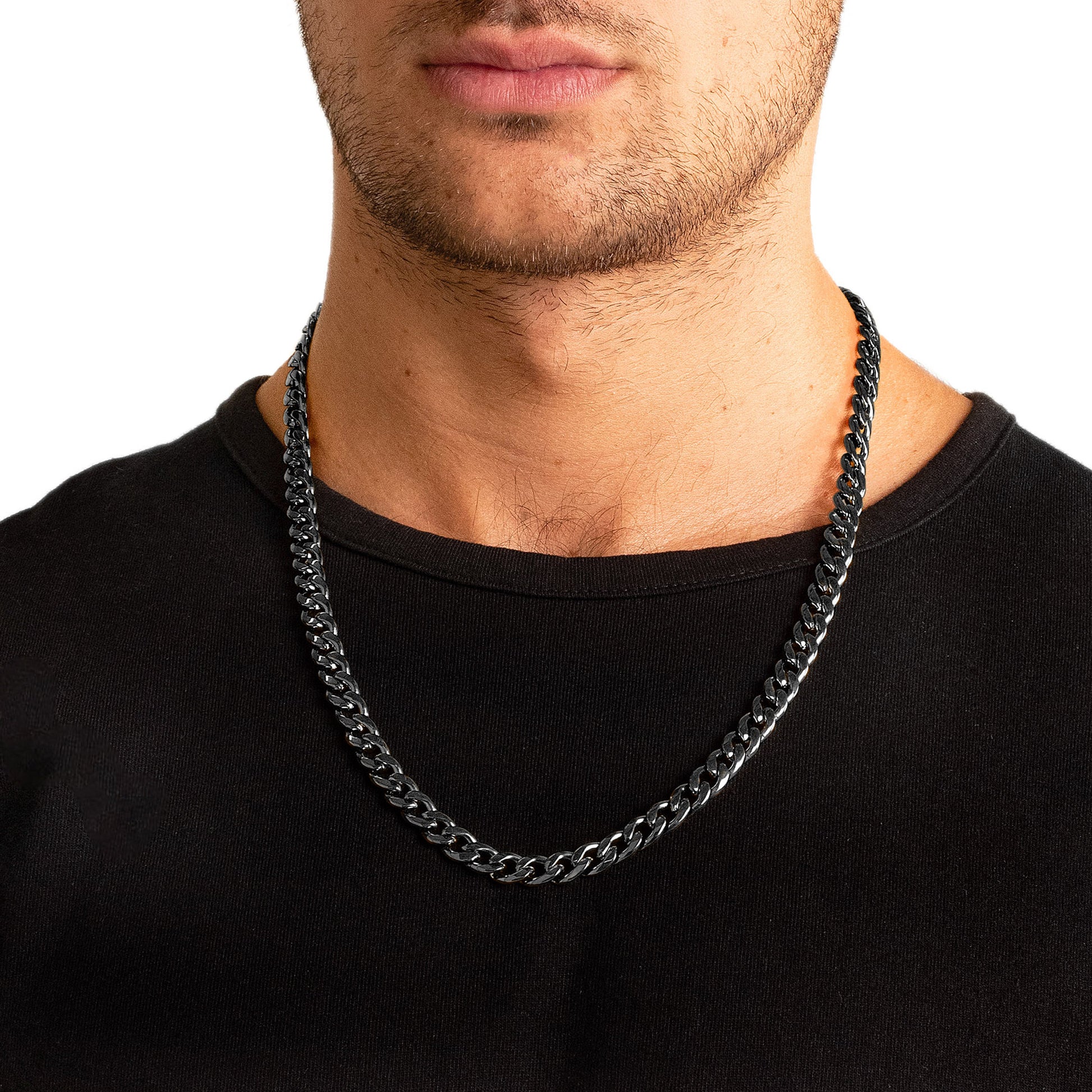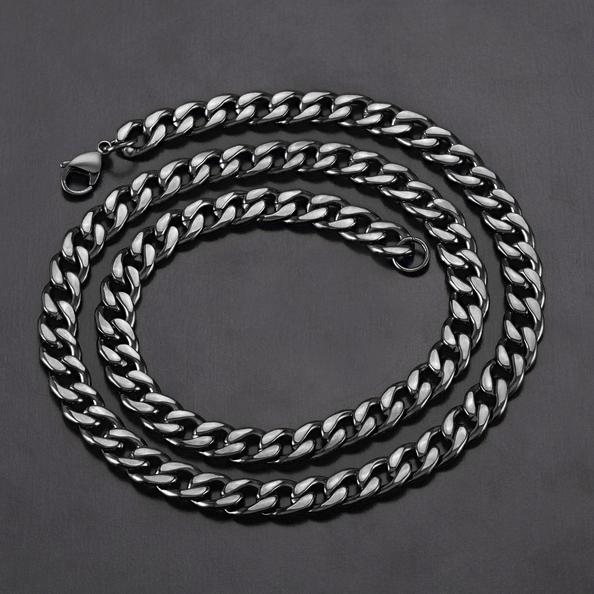 The chain necklace is crafted with durable stainless steel and has a high polished finish. The necklace has an end to end length of 24 inches. The width of the necklace is 9 millimeters. The piece stays secure with a lobster clasp.
