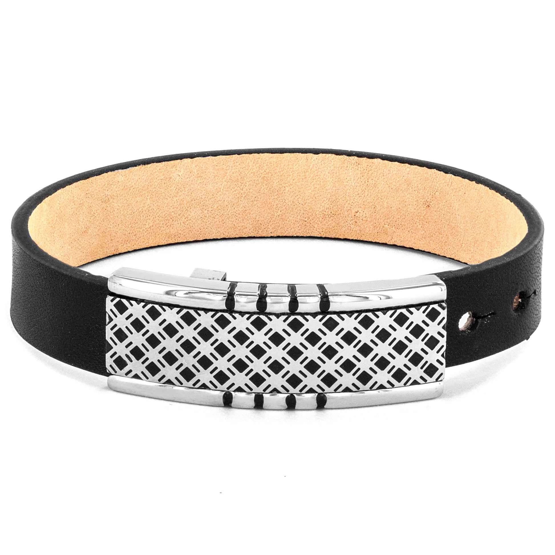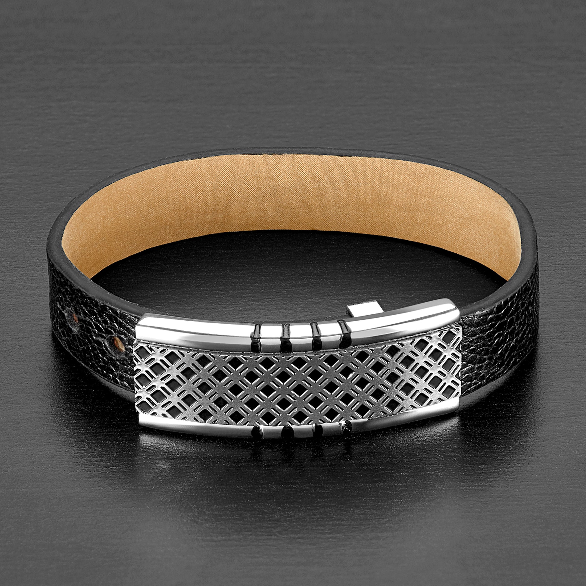 Men's Stainless Steel Lattice Buckle Black Leather Bracelet (14mm)
