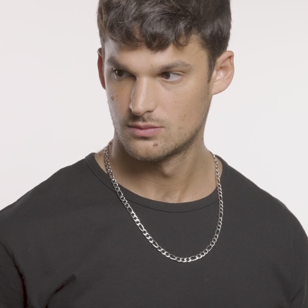 The chain is crafted with durable stainless steel and is complete with a polished finish. The Figaro chain is designed with an alternating pattern consisting of one oval link followed by 3 round links.