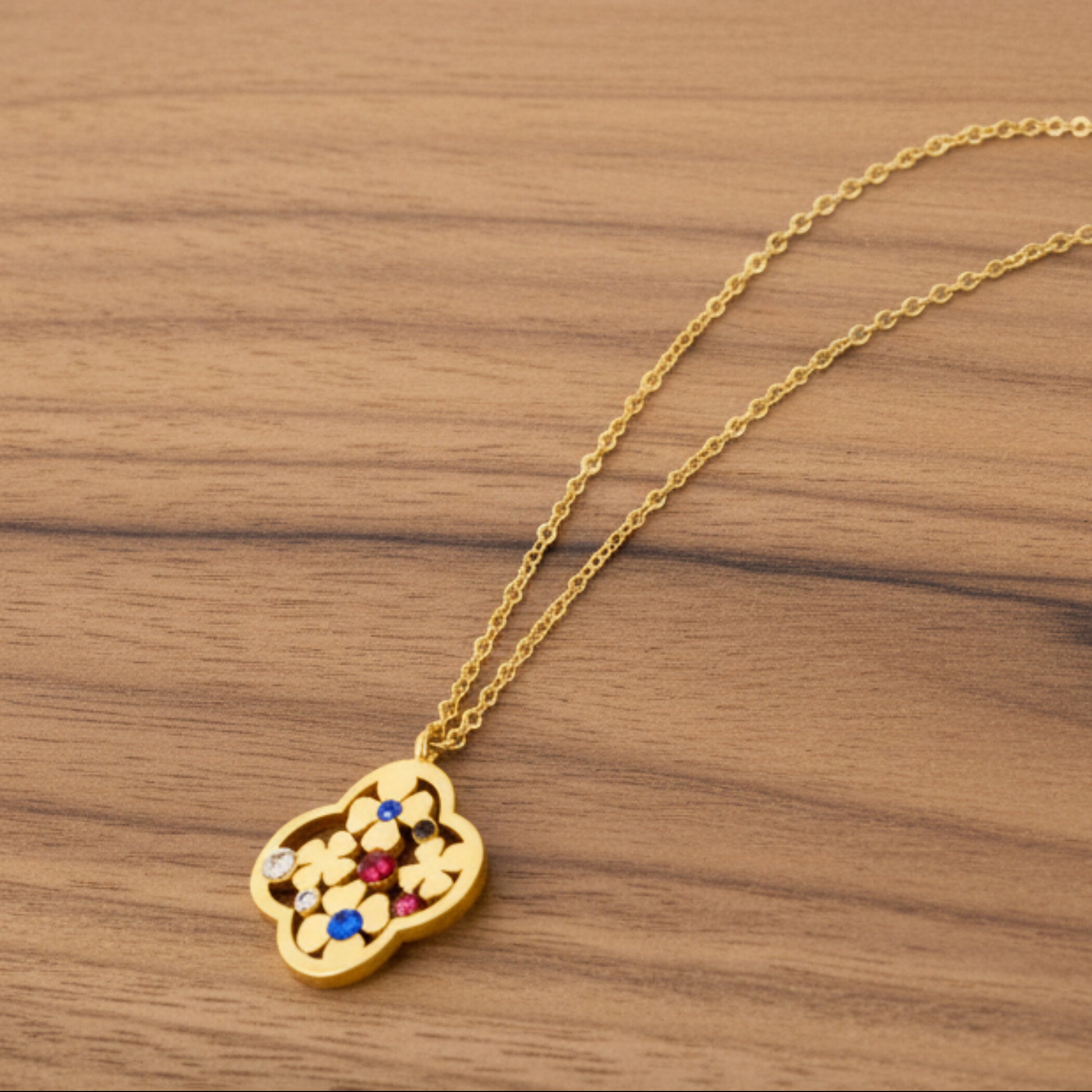 The design of the pendant has four floral flowers enhancing seven crystal stones. The colored crystal stones vary in size and color. The necklace is crafted with gold plated stainless steel.