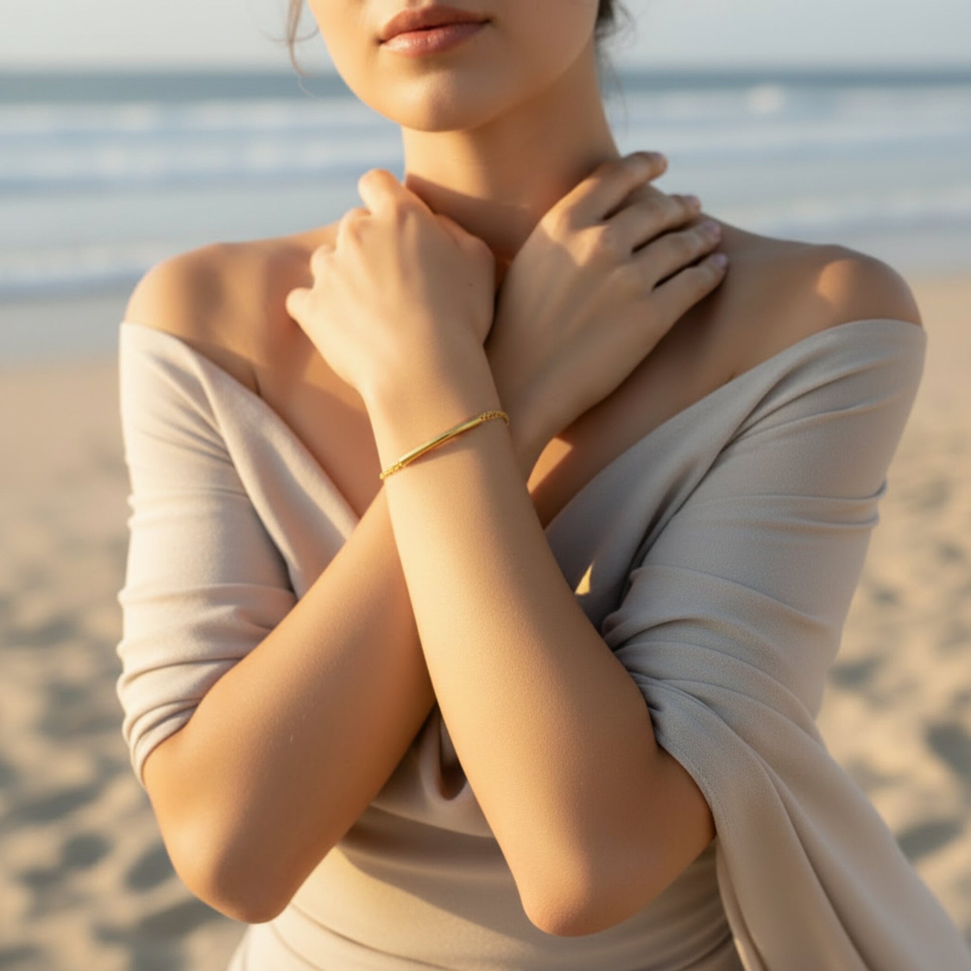 Add this women's chain bracelet to your choice of accessories. The chain has two cable chains twisted together to create a dainty yet stylish piece. The center of the bracelet has a gold plated curved cylindrical tube that easily slides across the bracelet. The piece is crafted with stainless steel. This dainty bracelet has a length of 7 inches. The width of the tube is 4mm. The gold plated chain secures with a Lobster Claw clasp.
