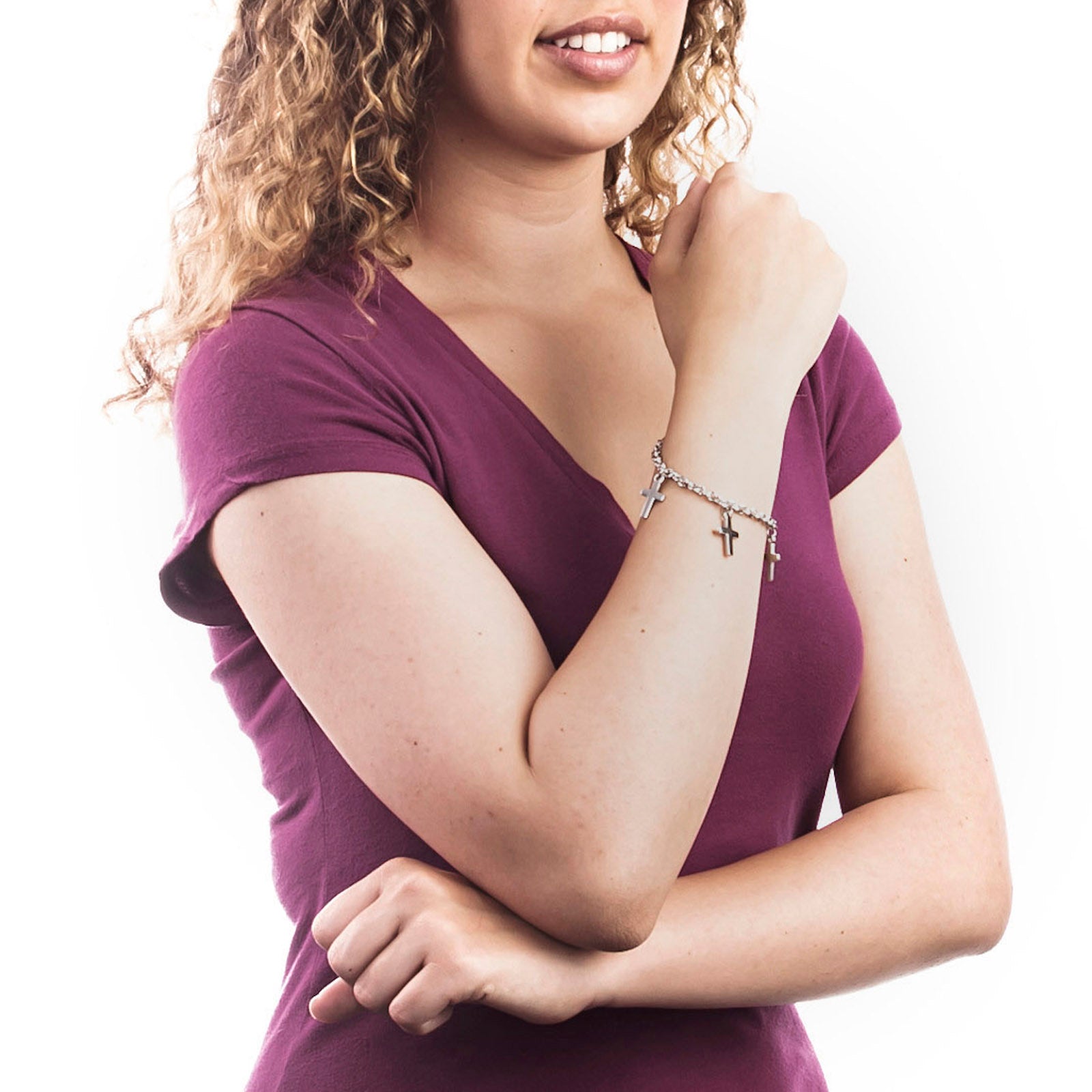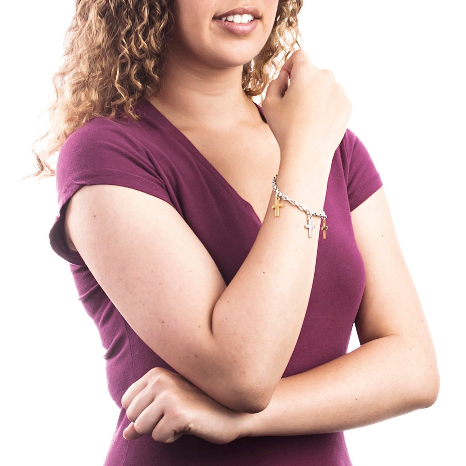 The bracelet has a wearable length of 7.5 inches with a chain width of 2 millimeters. The piece fastens with a lobster clasp. The cross charms dangle on a cable chain. Each dangling cross has a length of 23 millimeters.