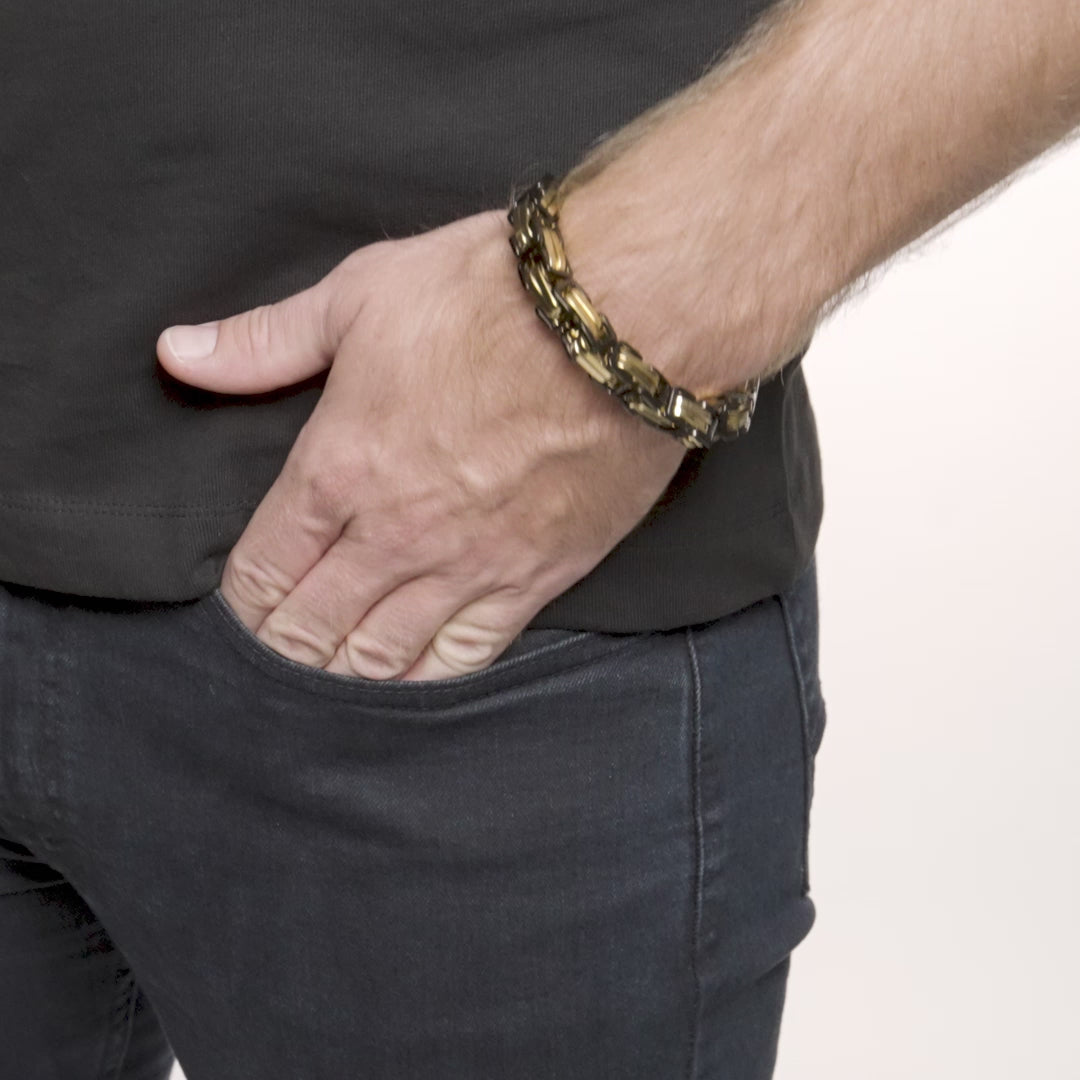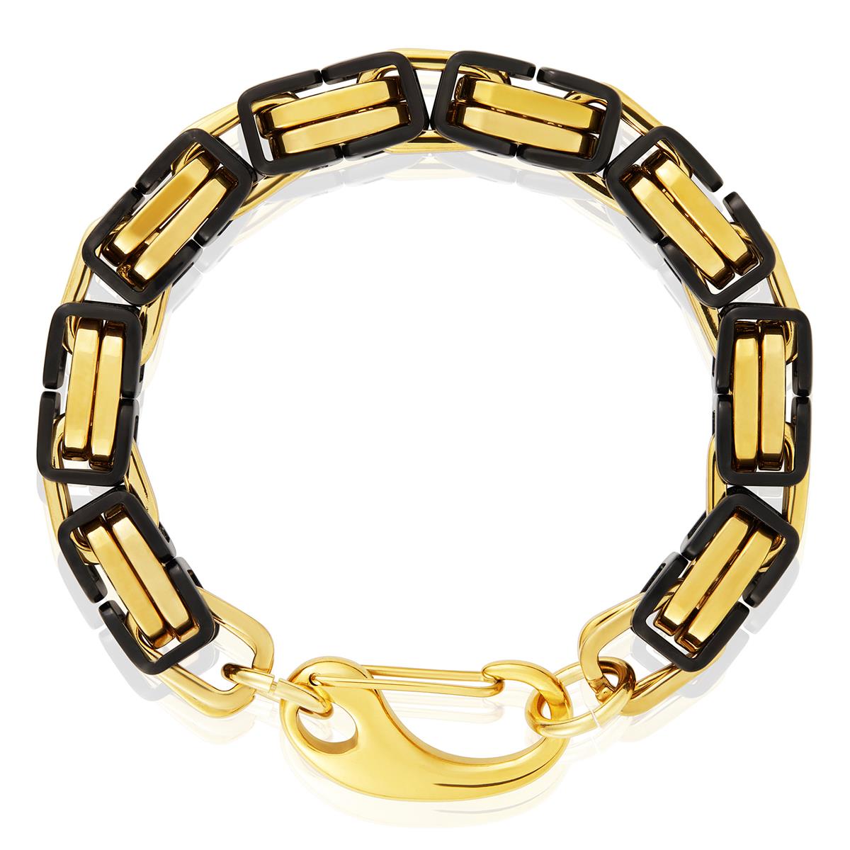 Add this stylish black and gold plated stainless steel Byzantine chain bracelet to your choice of daily wear. The byzantine chain offers a classic chain style yet modernized with a two tone design and an oversized clip lobster closure.