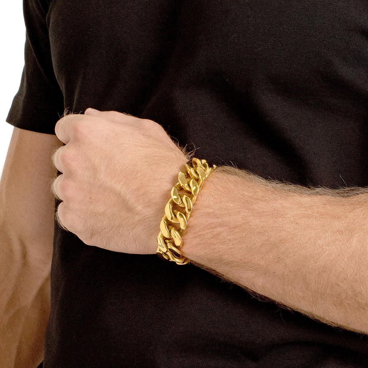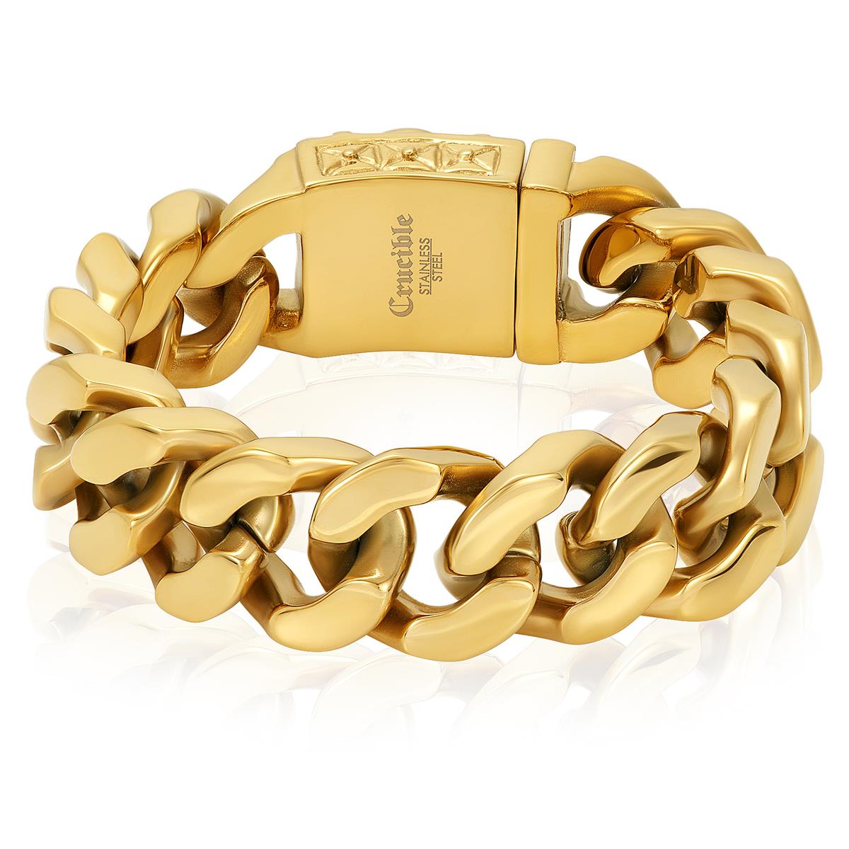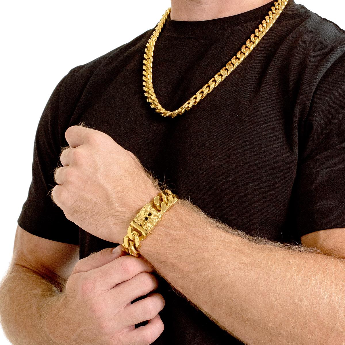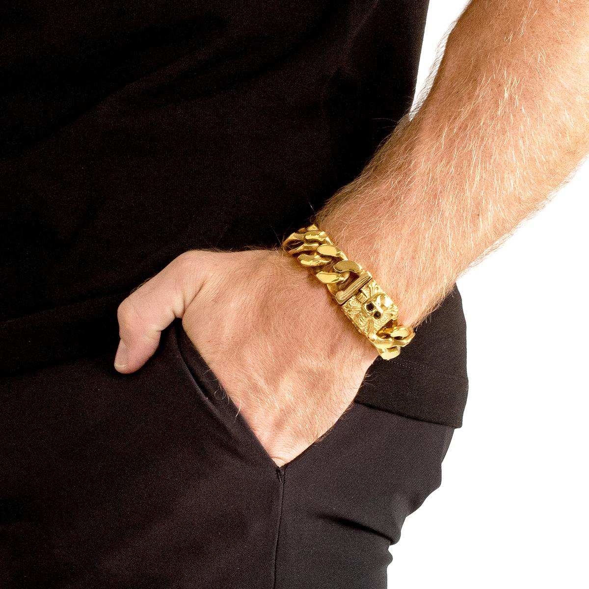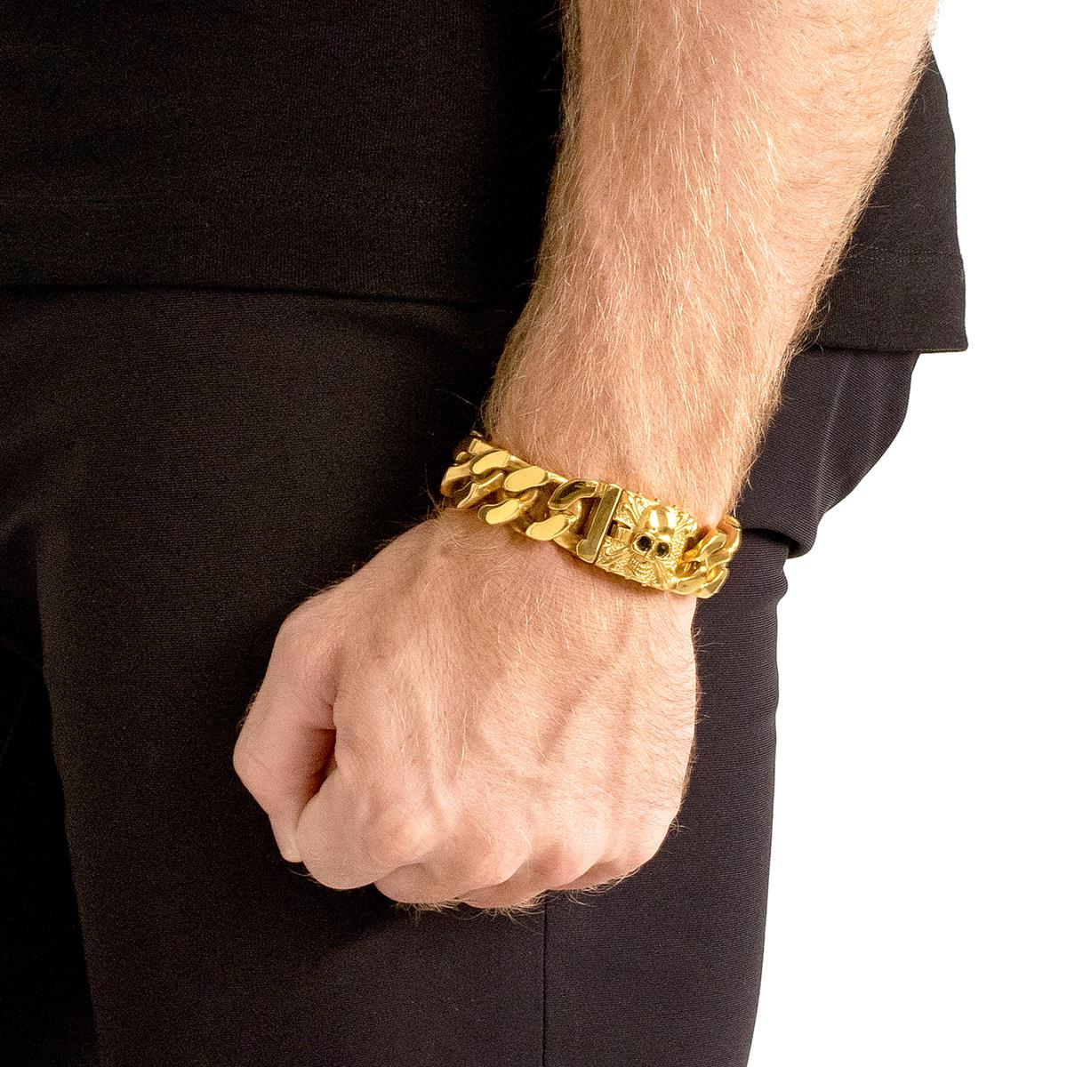 Wear this gold plated stainless steel skull curb link bracelet with any style. The bracelet has a skull clasp paired with curb links that will give your wrist a tough look.