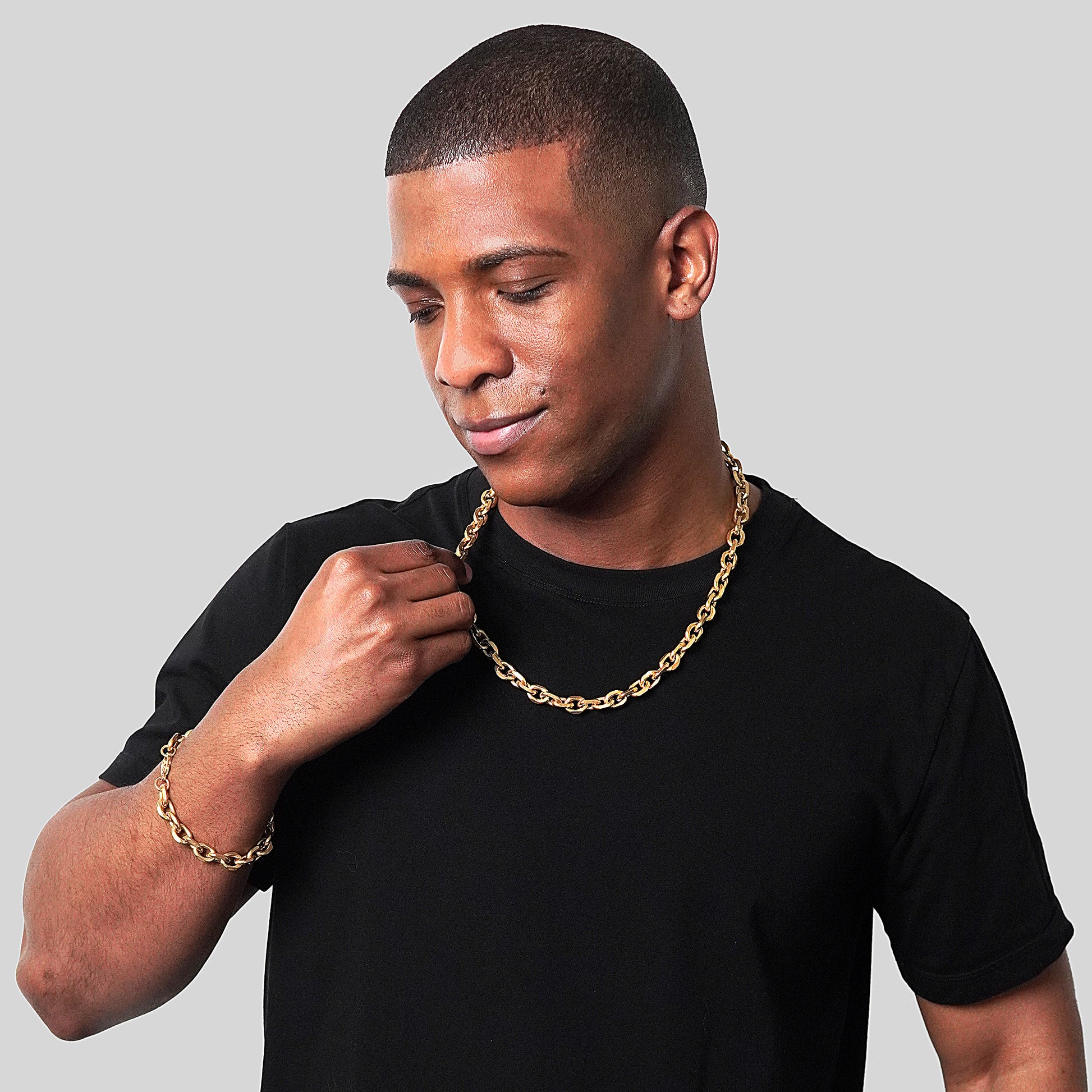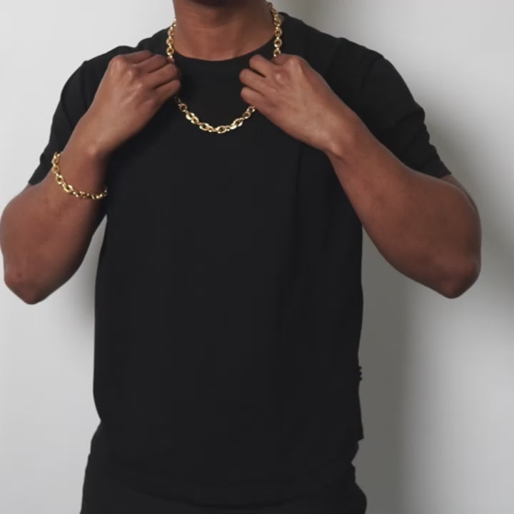 Men's Knife Edge Oval Links Gold Plated Stainless Steel Bracelet and Necklace Chain Set (10.6mm)