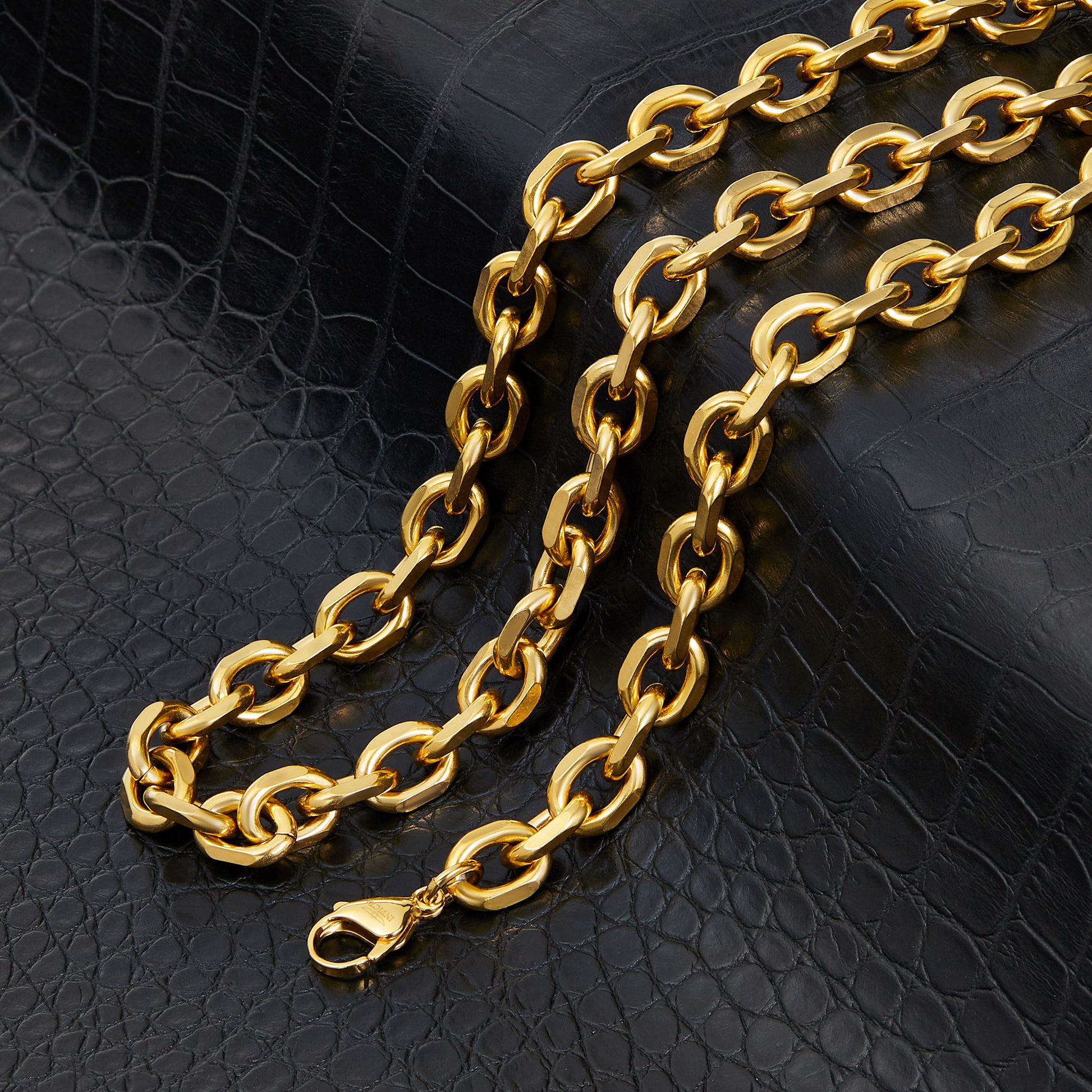 Complete your stylish look when wearing this unique chain set. The chains are crafted with durable stainless steel and feature oval shaped links. The polished finish with the knife cut edges create an eye catching design that'll pair perfectly with your favorite accessories.