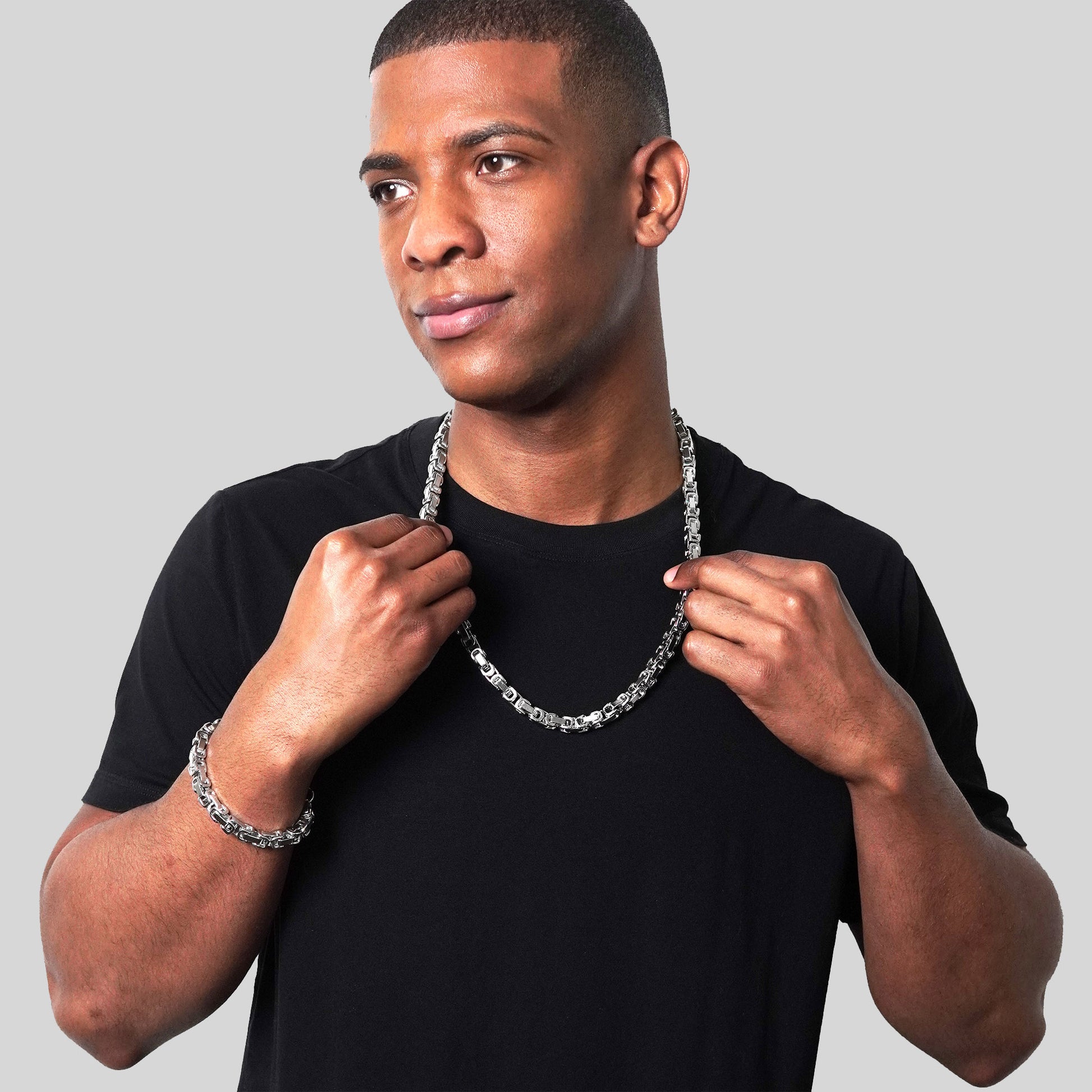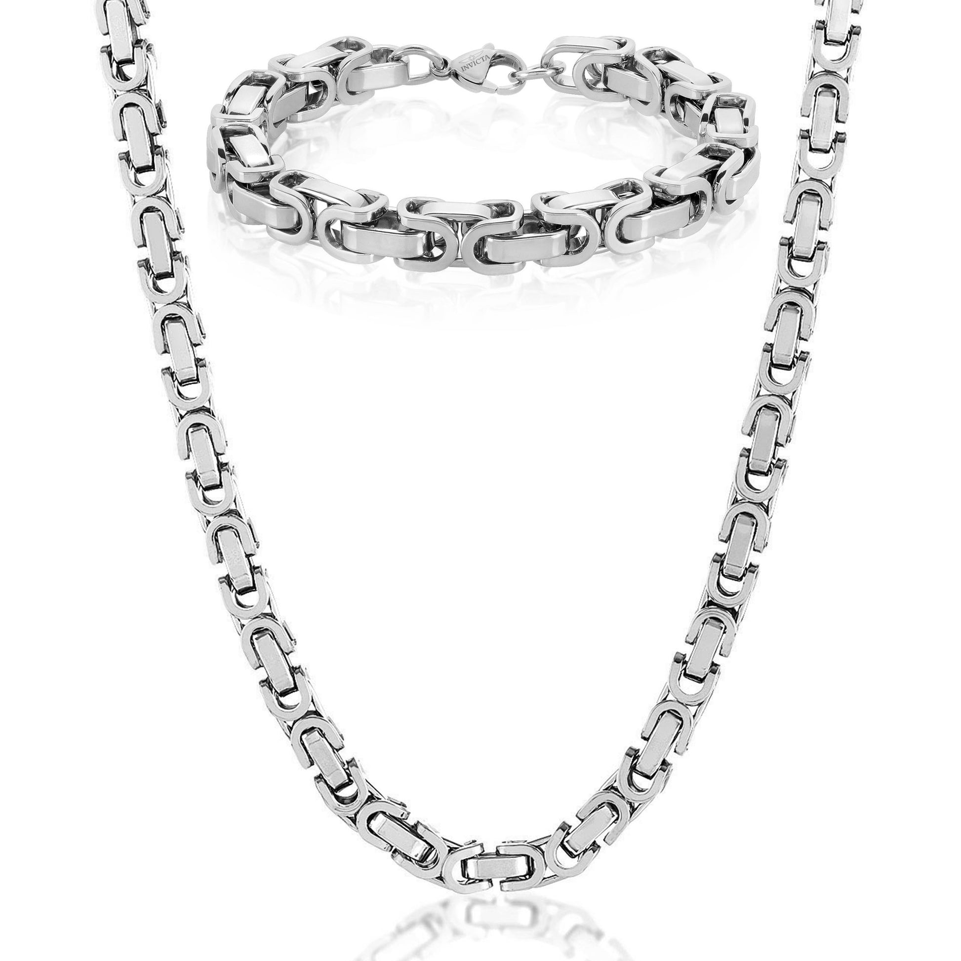Grab this chain jewelry set and elevate your style. Expertly crafted with stainless steel, this men's byzantine set boasts a sleek and polished design. The intricate chain link design exudes sophistication, making it the perfect accessories to wear for any casual or professional look. The polished set comes together with the alternating two-tone links.