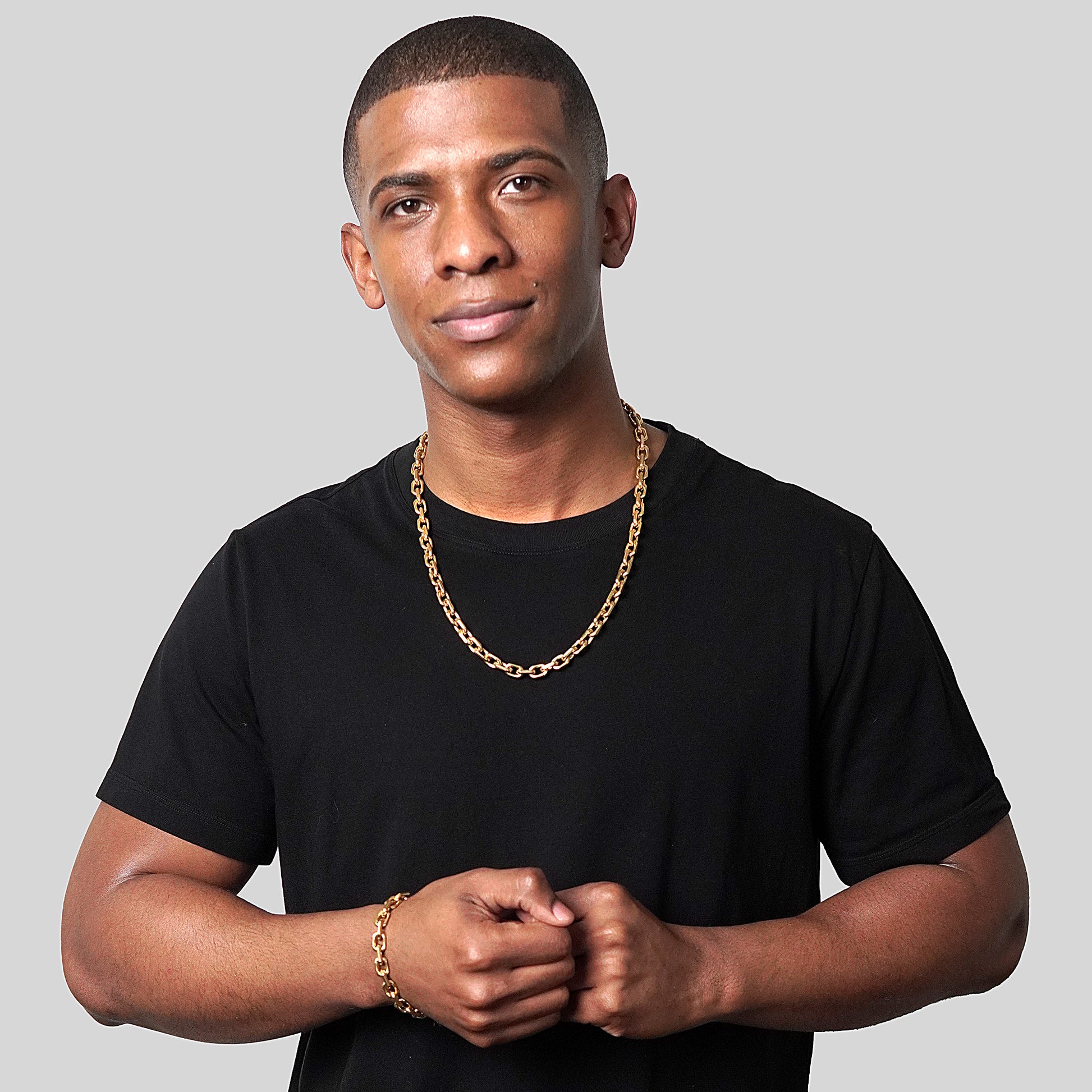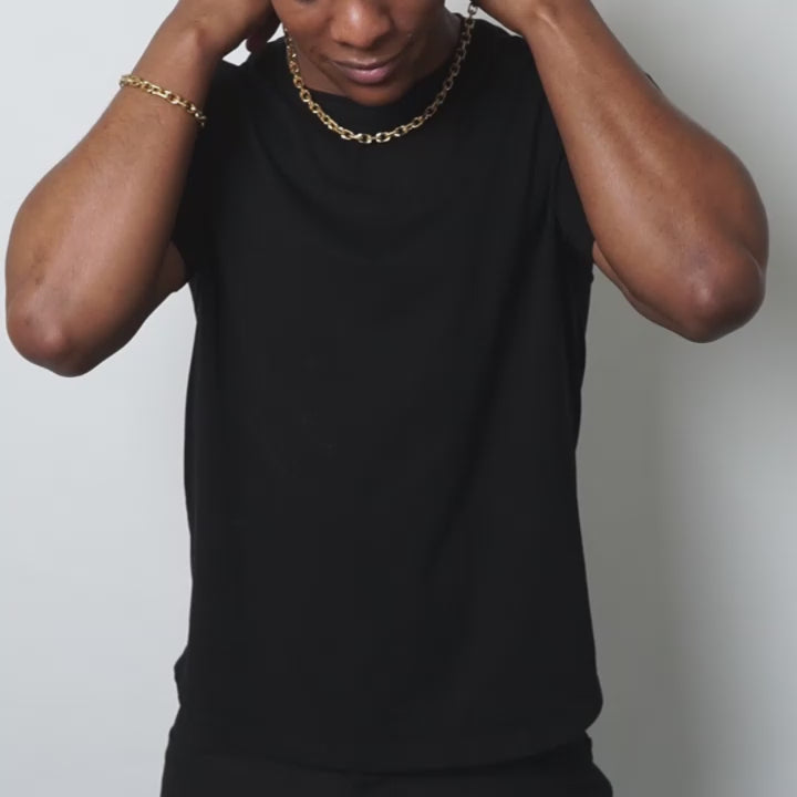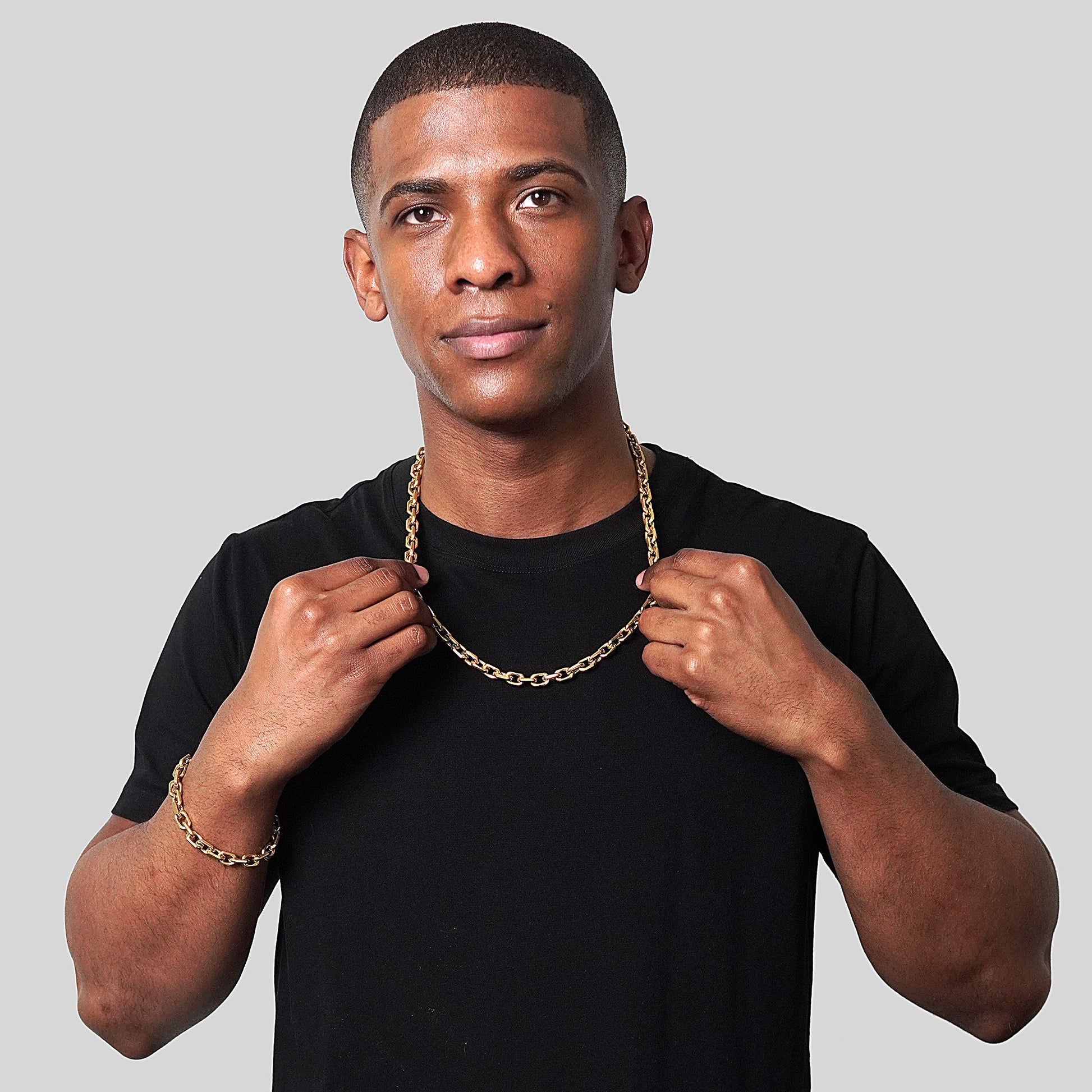 Men's Matte Finish Beveled Edge Rectangular Links Gold Plated Stainless Steel Chain Bracelet and Necklace Set (8.5mm)