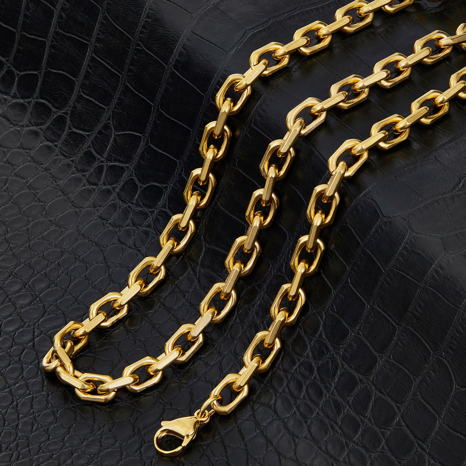 Complete your stylish look when wearing this unique link chain set. The set is crafted with durable stainless steel and features rectangular oval shaped links. The matte finish with the beveled edges creates an eye catching design that'll pair perfectly with your favorite accessories.