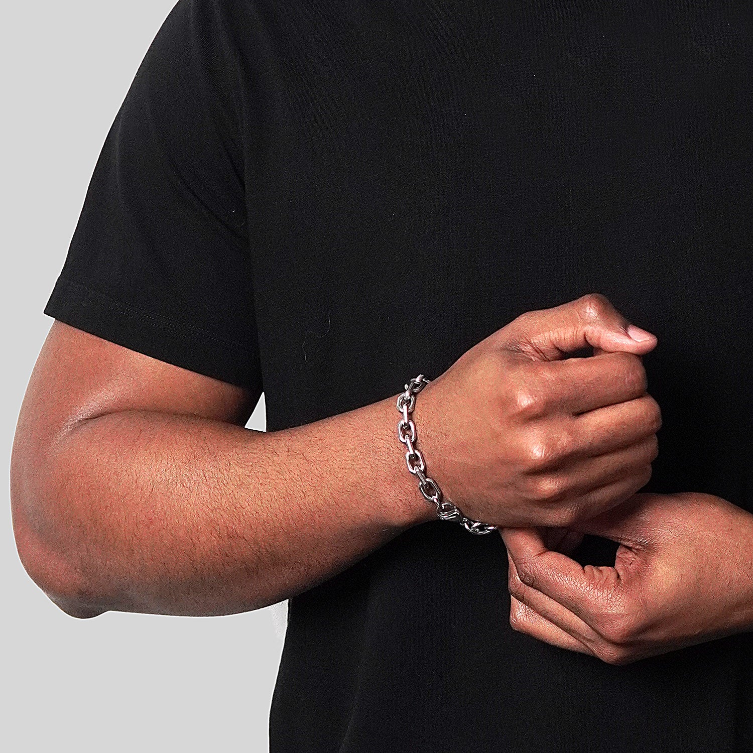 Complete your stylish look when wearing this unique link chain bracelet. The bracelet is crafted with durable stainless steel and features rectangular shaped links. The bracelet has a wearable length of 8.75 inches, a width of 8.5 millimeters and fastens with a lobster claw clasp. The matte finish with the beveled edges creates an eye catching design that'll pair perfectly with favorite accessories. Grab the matching chain necklace and complete the look!
