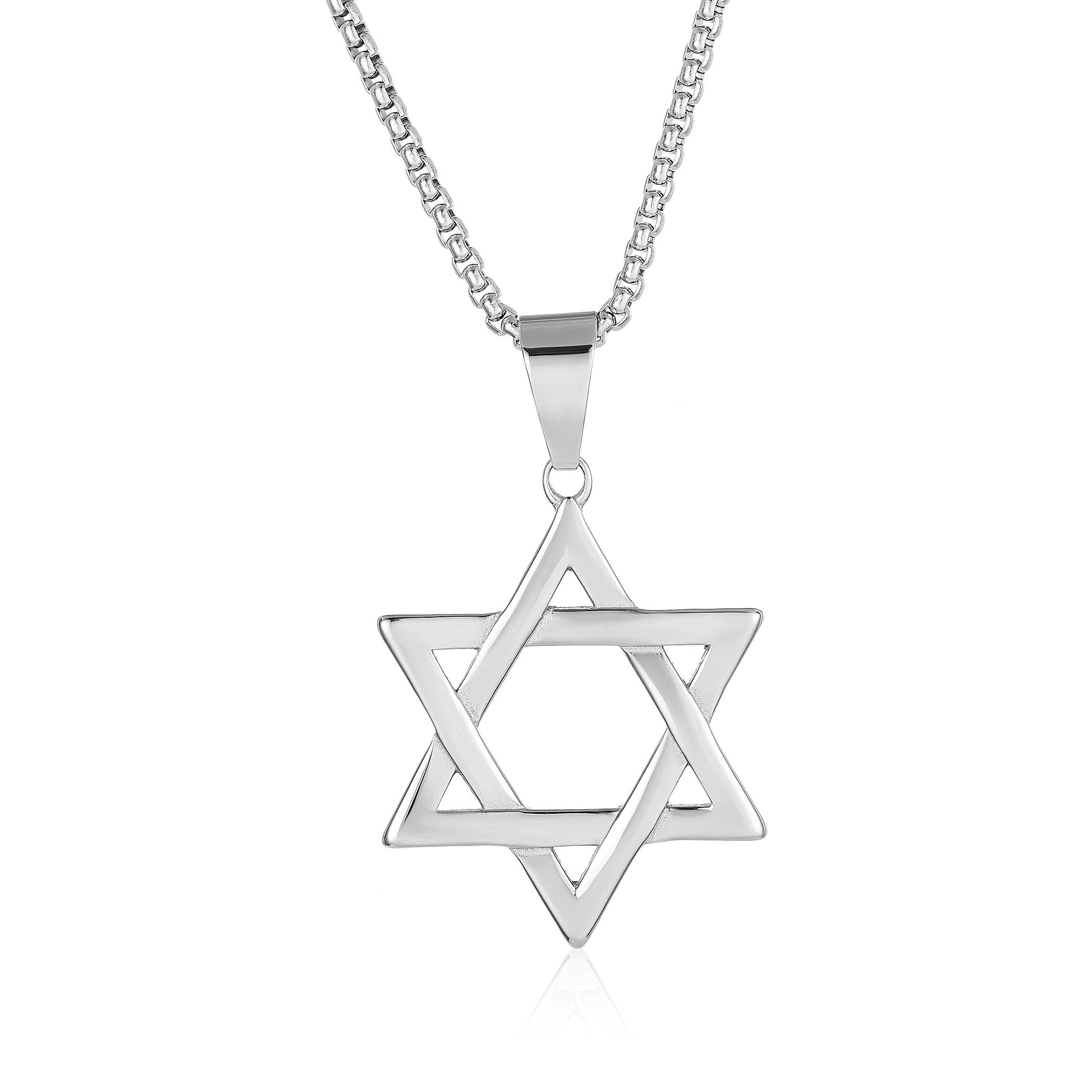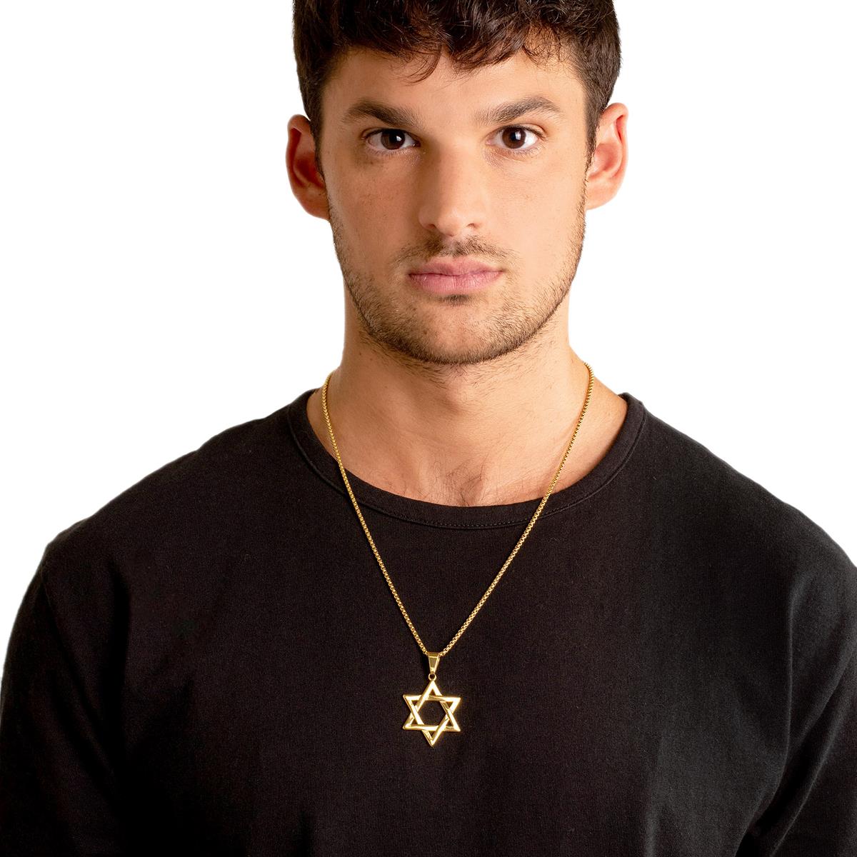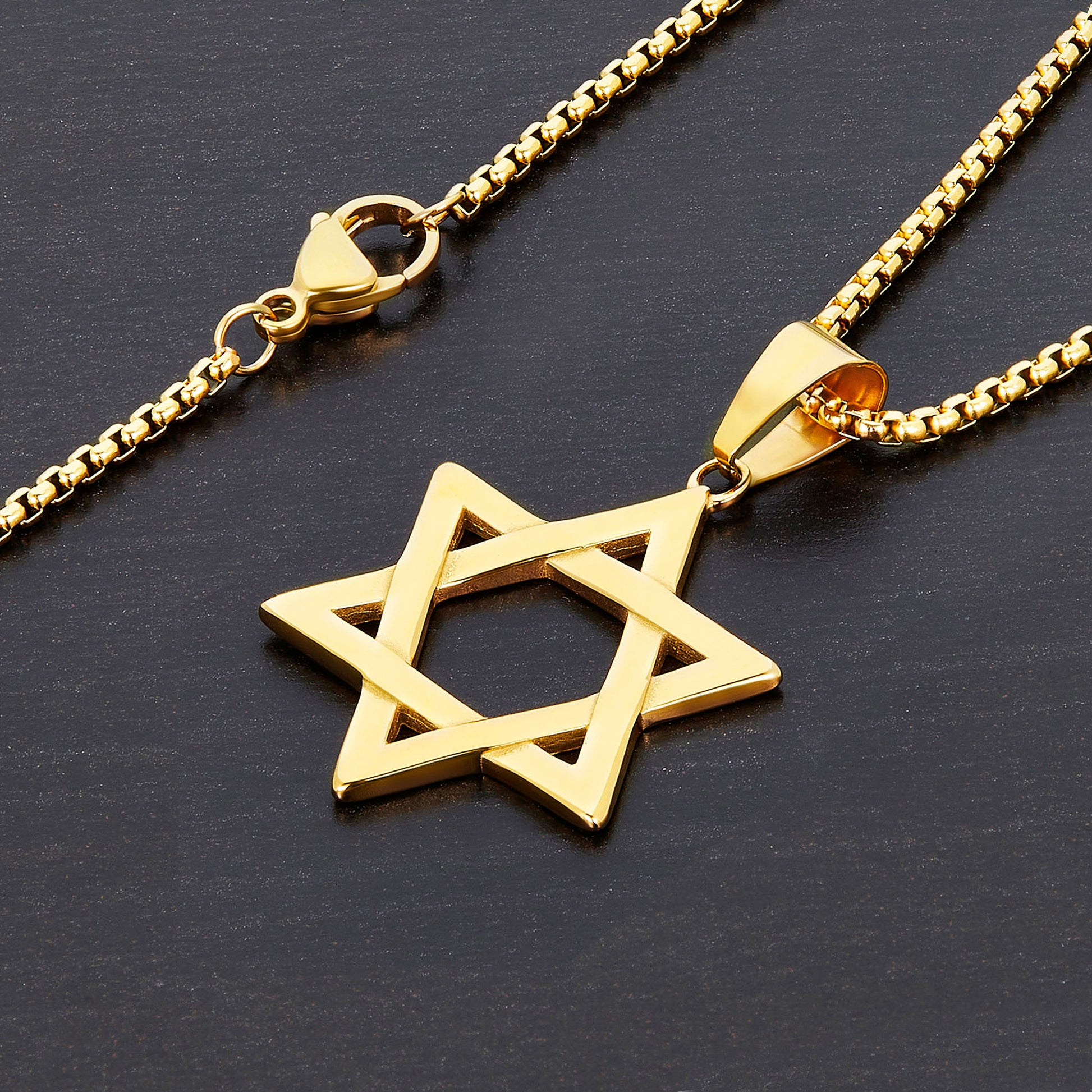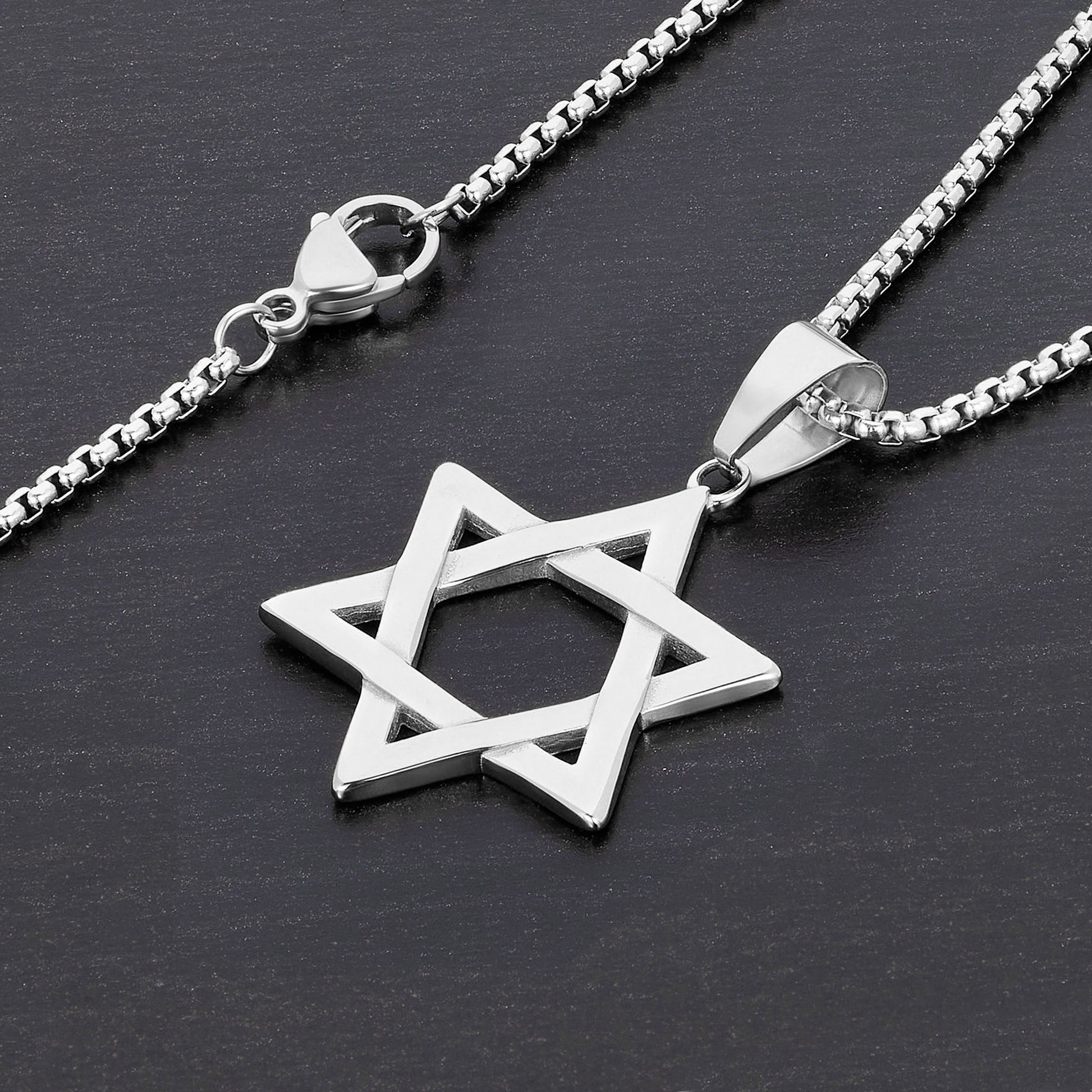 The 'Star of David' pendant is paired with a 24 inch box chain and fastens with a lobster claw clasp.