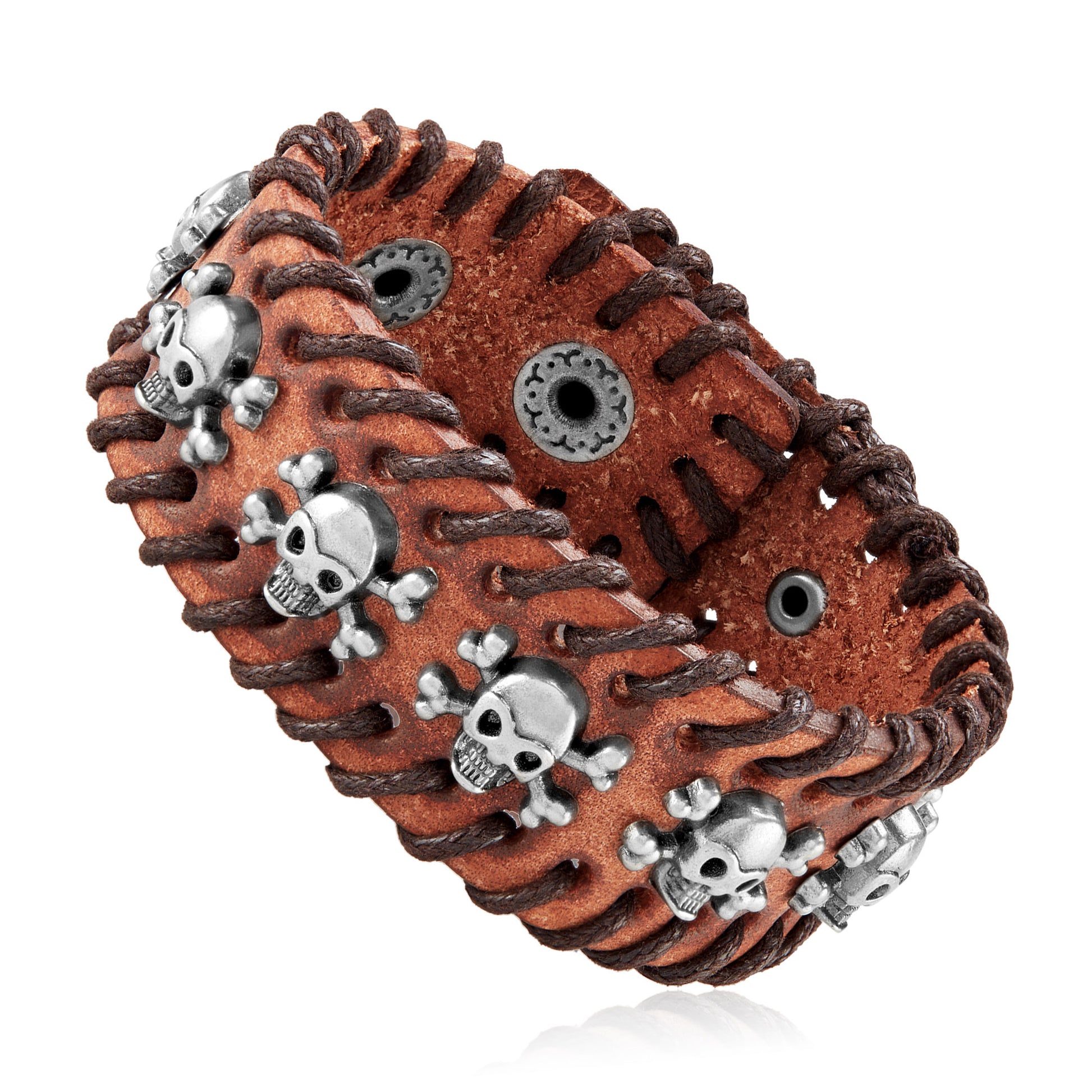 Keep yourself fashionable and in style with this handsome leather bracelet. This jewelry item features a leather strap with stitched borders and antiqued skull metal studs. The skull studs contrast with the leather strap to create a true stylish and fashionable accessory. The leather bracelet is flexible and contours well onto the shape of your wrist for a comfortable wear. The snap clasp closure on this bracelet allows you to size the length at 7 or 7.75 inches. The width of the piece is 29 millimeters and has a thickness of 7 millimeters.