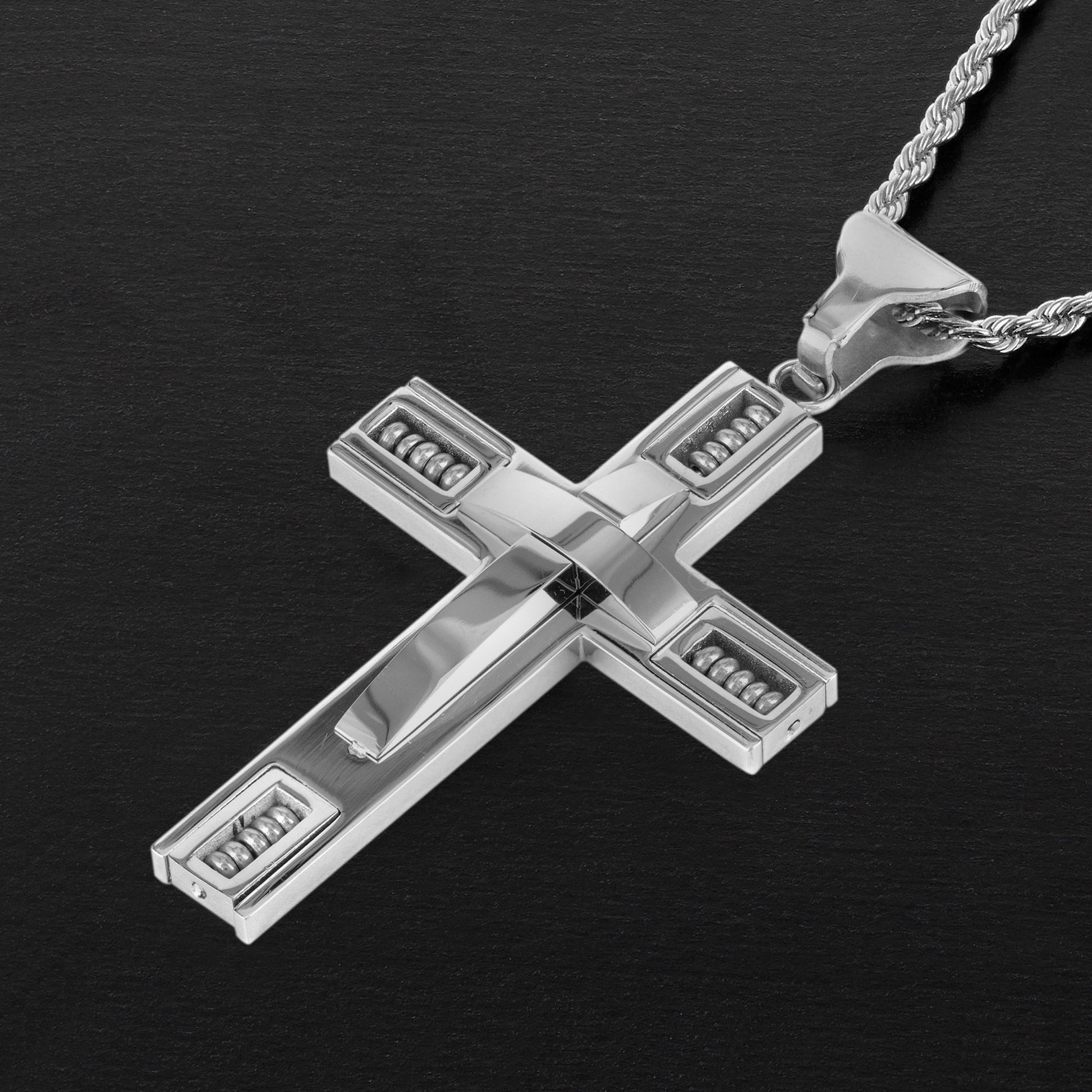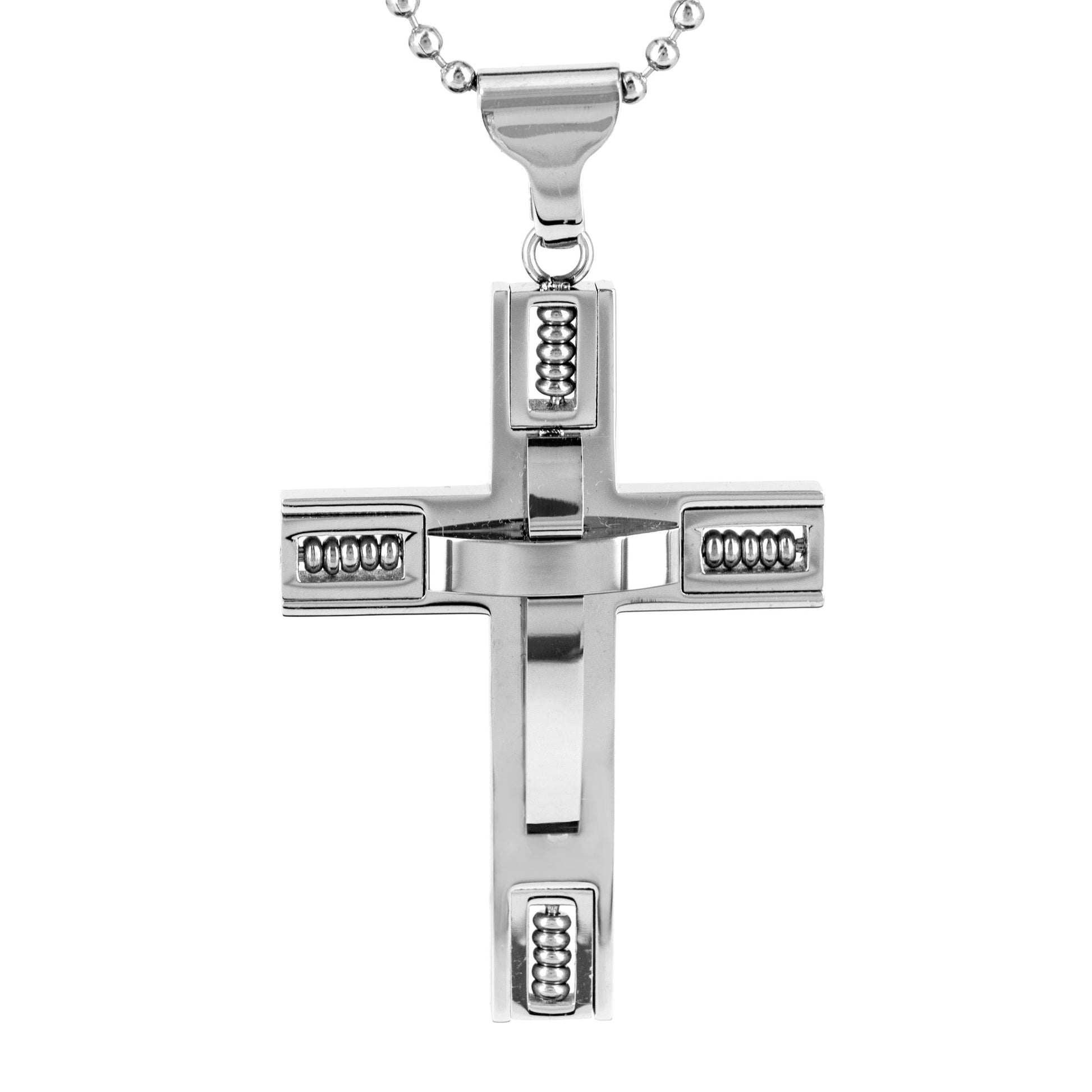 Keep your faith close when wearing this large beaded layered Cross. The pendant is crafted with durable stainless steel and features a small polished cross layered on top of another cross. The edges of the cross each have five small steel discs.