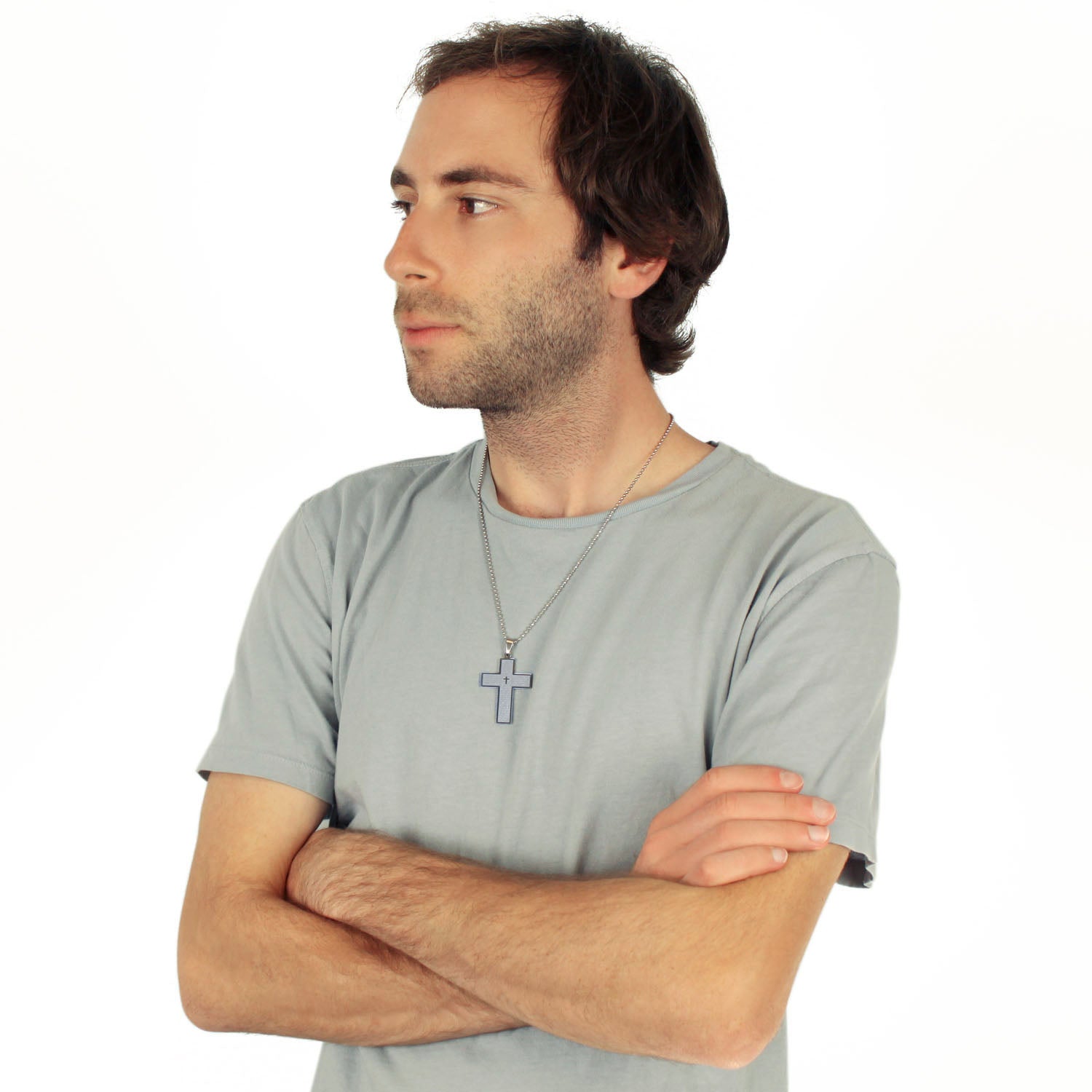 Crafted with durable stainless steel the cross has a polished finish that will enhance any look. The Cross measures 40 millimeters long by 30 millimeters wide by 2 millimeters thick. The piece is paired with a 24 inch chain and stays secure with a lobster clasp.
