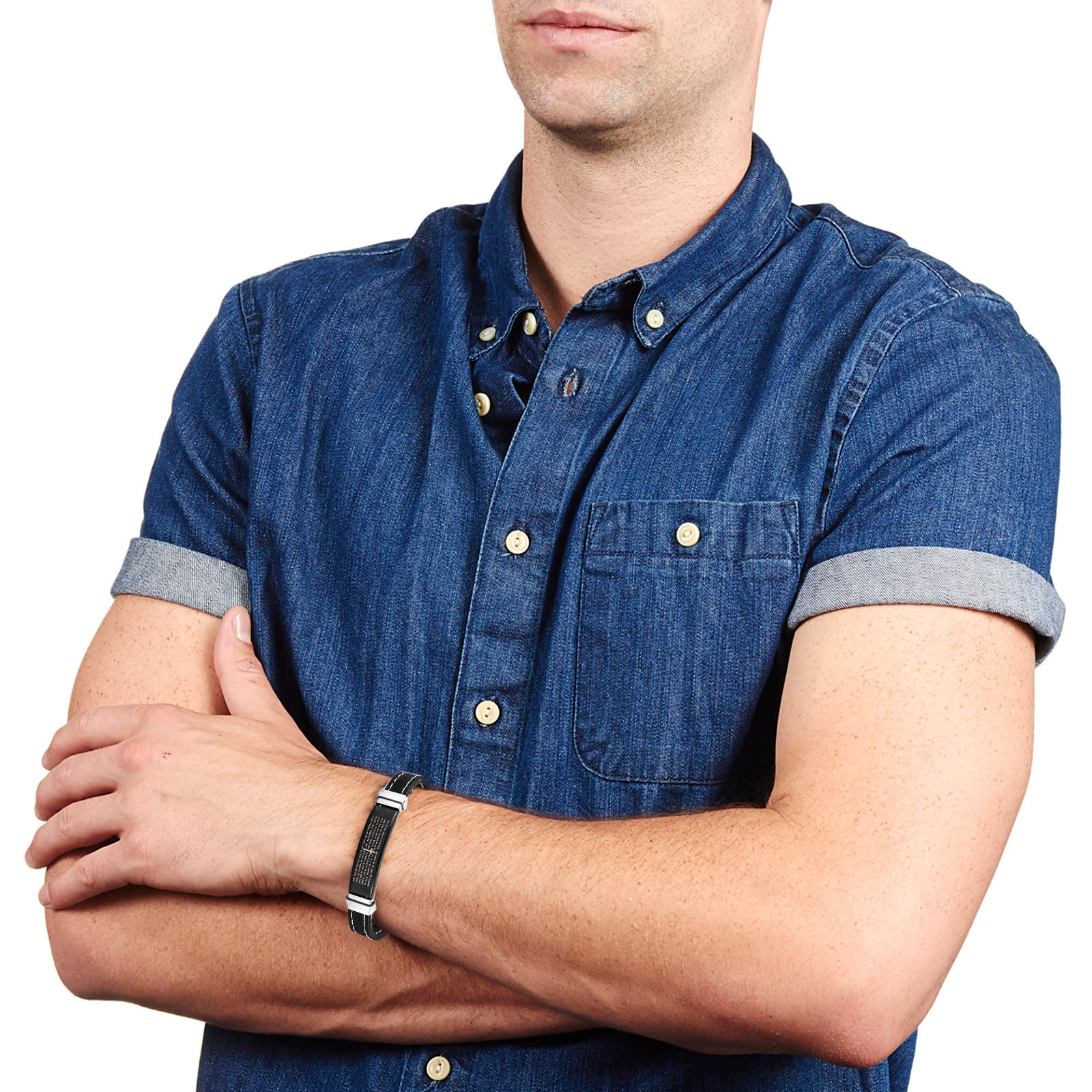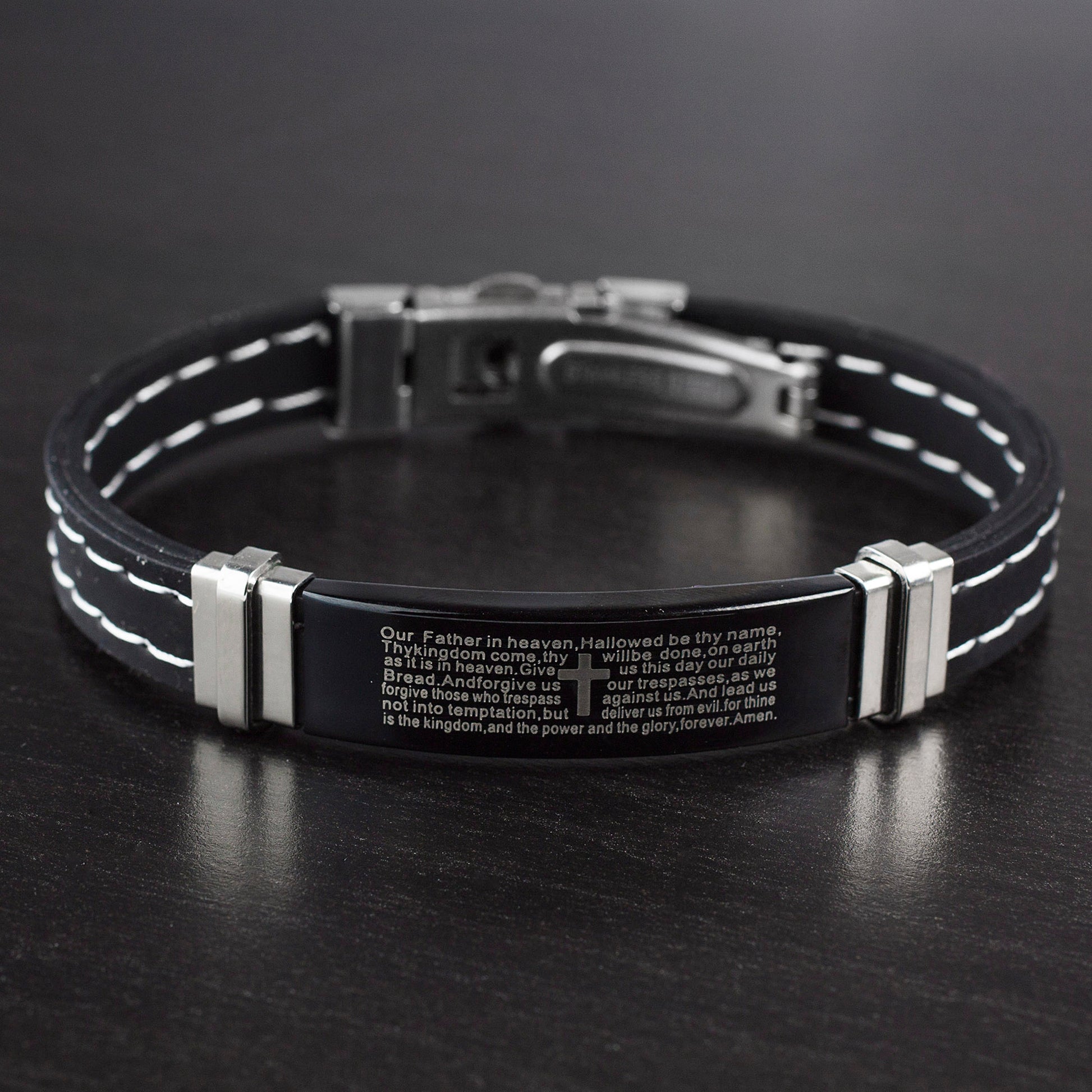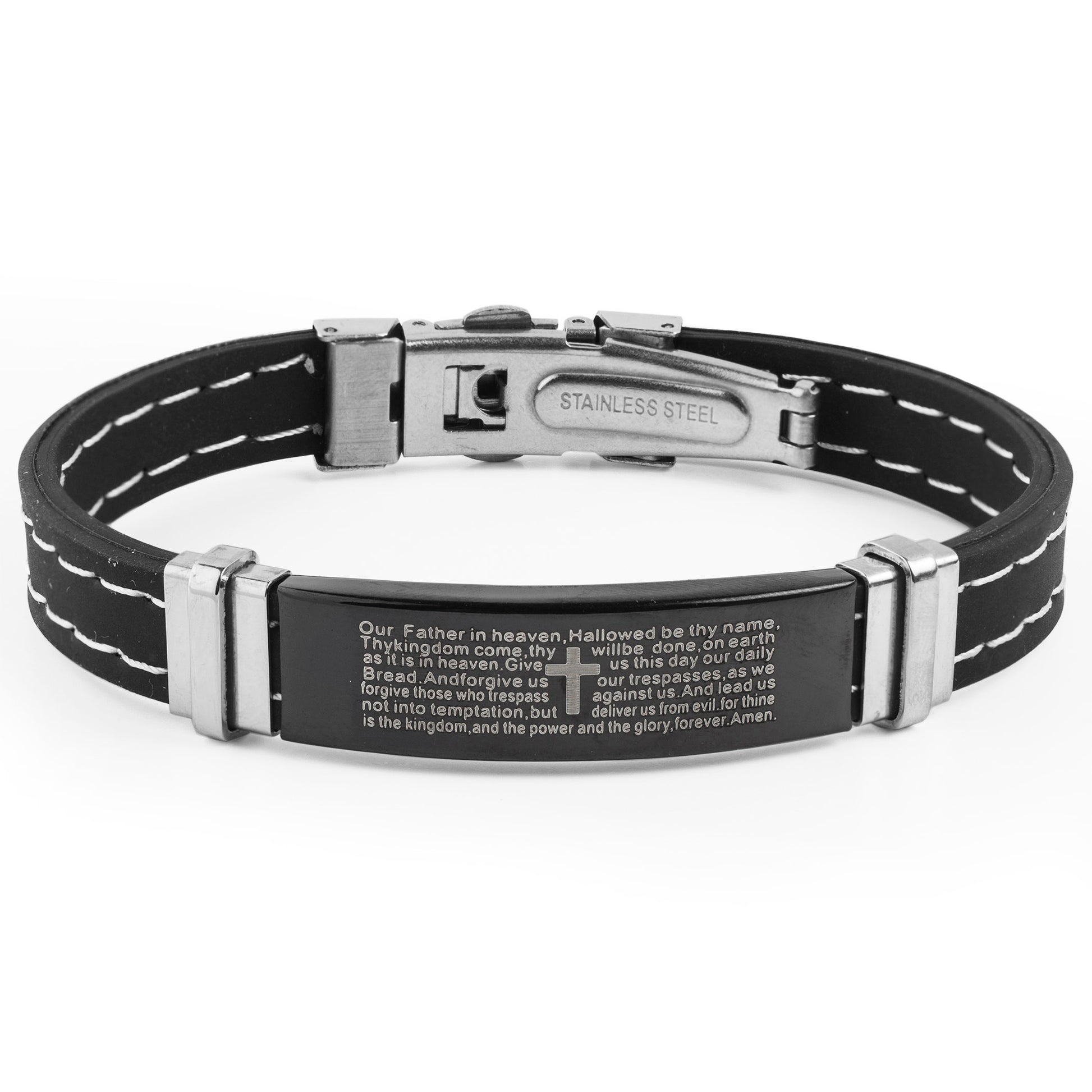 Showcase your faith and style when wearing this Lord's Prayer bracelet. The piece has a unique ID style by having the prayer laser engraved on a black plated steel plate. The identification plate is held by rubber straps on each end.