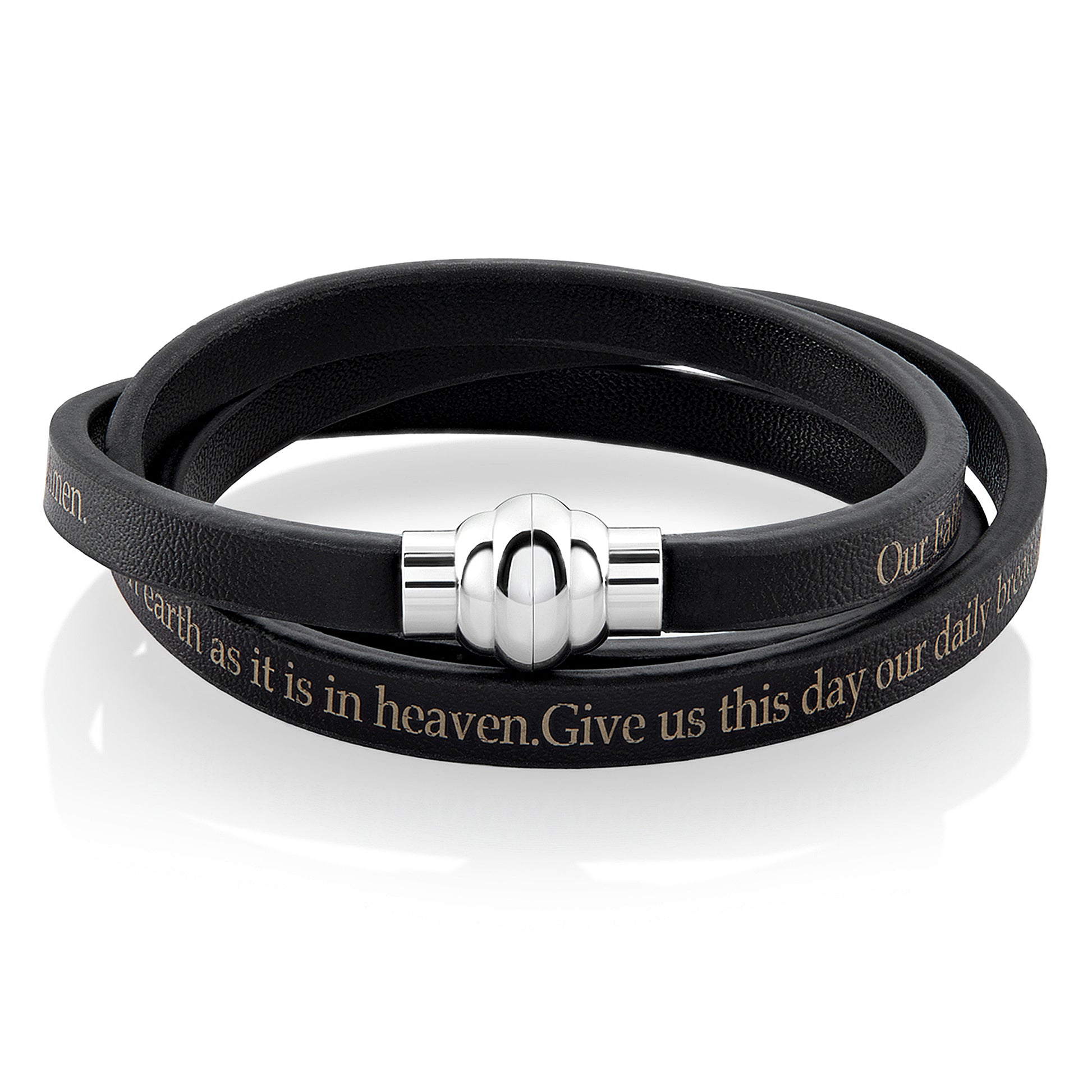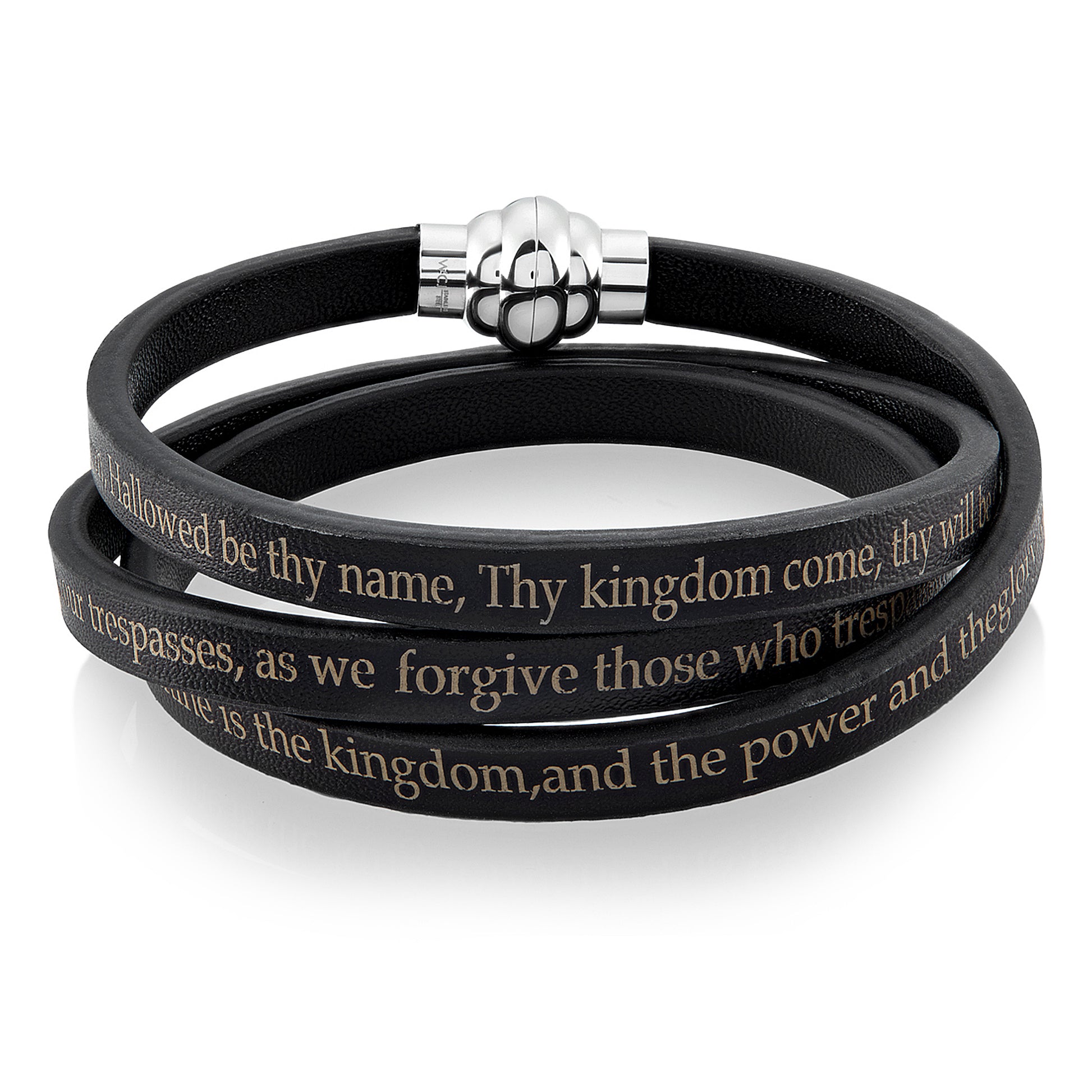 The wrap bracelet consists of a genuine black leather construction that is stamped with the Lord's Prayer wrapping around the piece, and stays secure with a polished stainless steel clasp.
