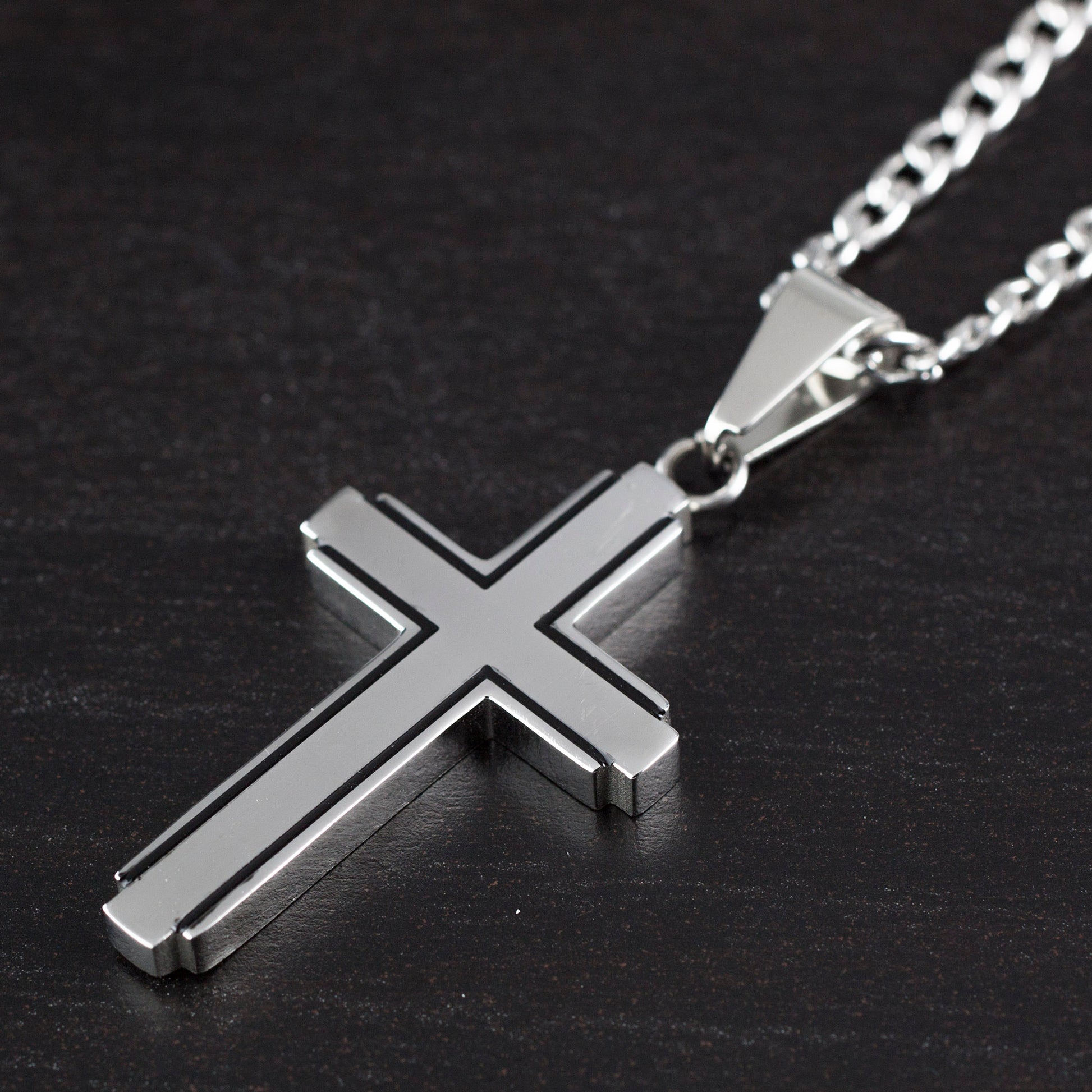 Measuring from the top of the bail to the bottom of the pendant, the cross measures 48 millimeters or 1-7/8 inches long by 20 millimeters or 13/16 inches wide. The stainless steel pendant is paired with a 24 inch chain and fastens with a lobster clasp.
