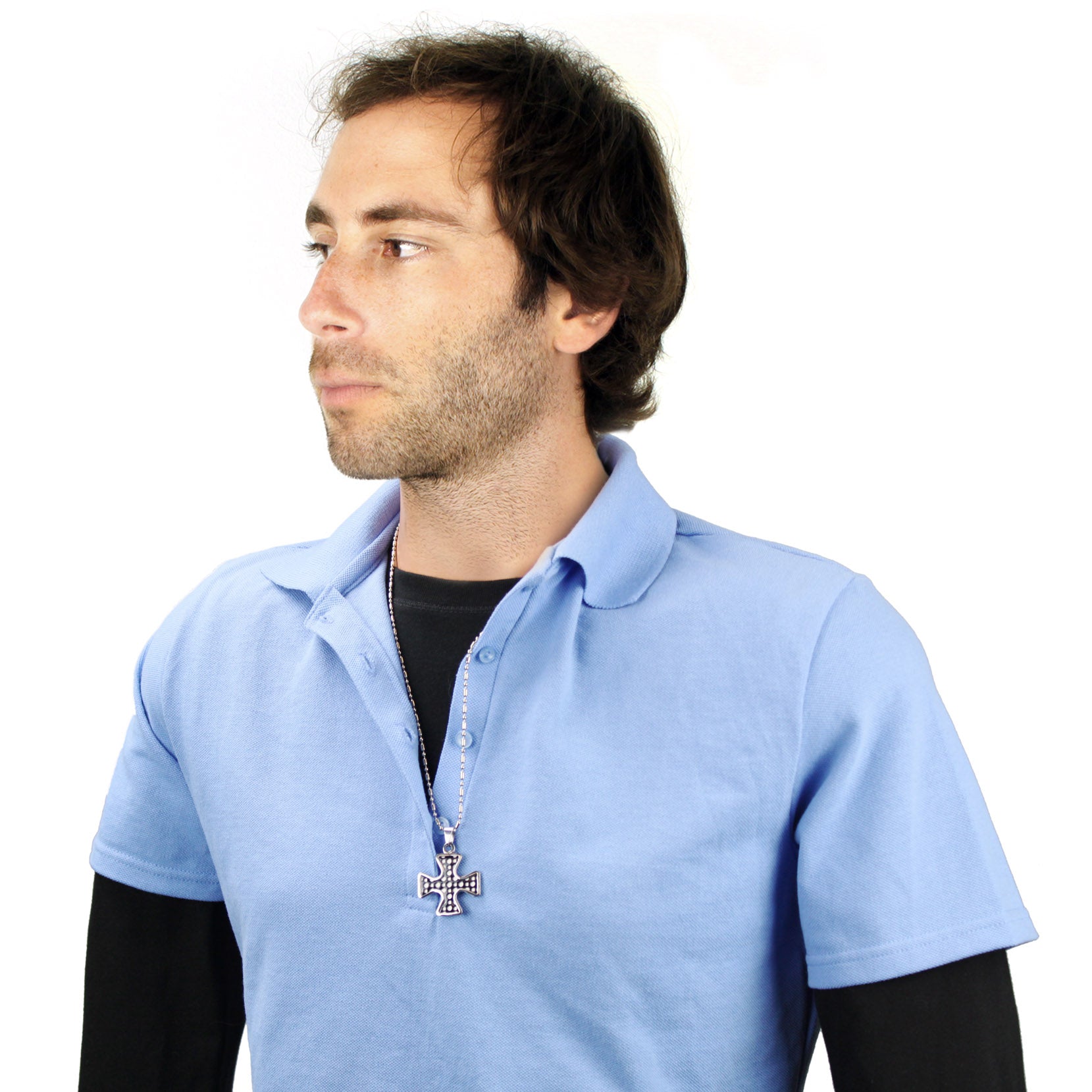 The cross necklace measures 38 millimeters long by 32 millimeters wide by 4 millimeters thick. The piece is paired with a 24 inch ball chain and fastens with a ball connector clasp. The chain pictured with the pendant is not the chain the pendant will be shipped with.