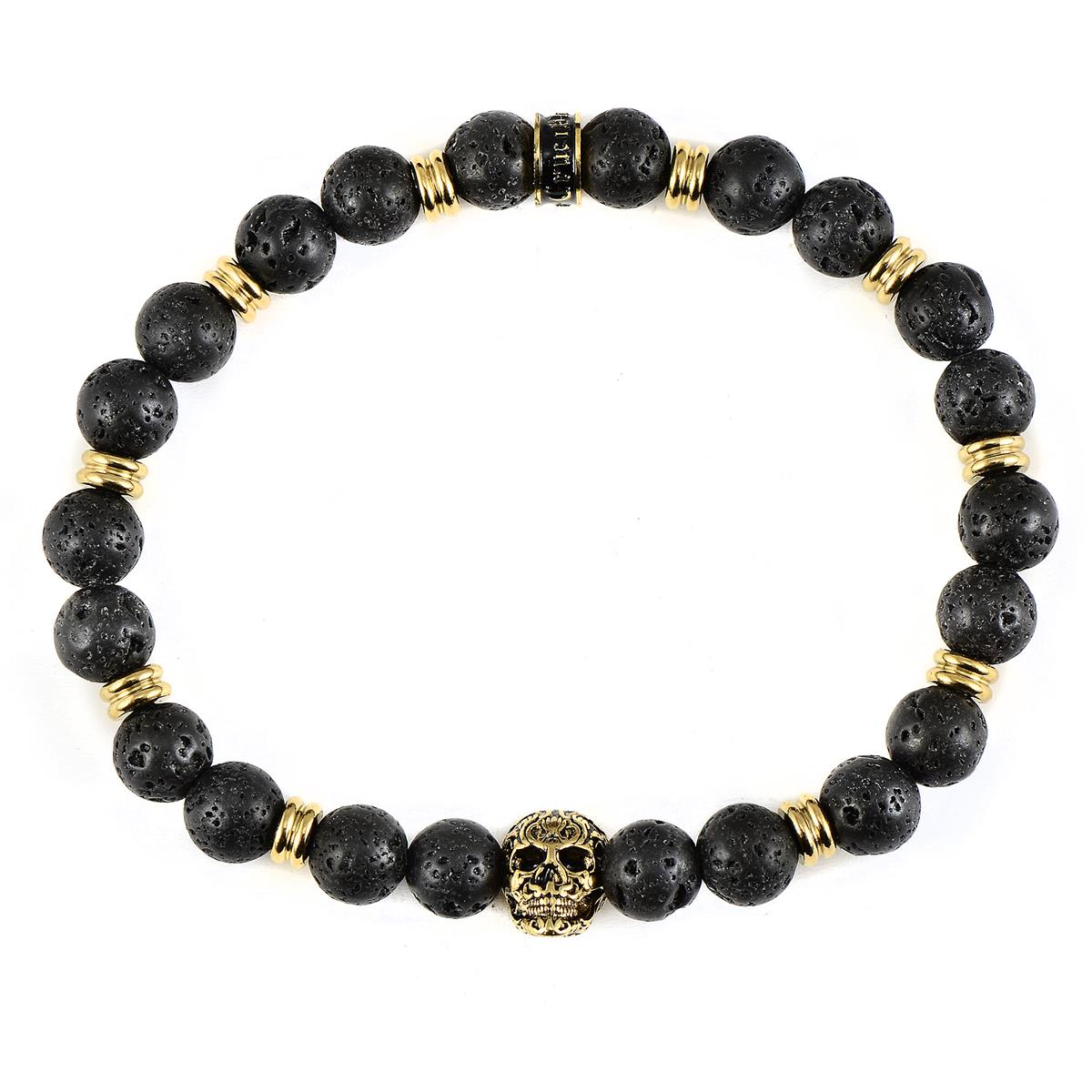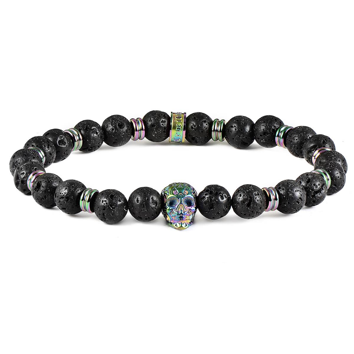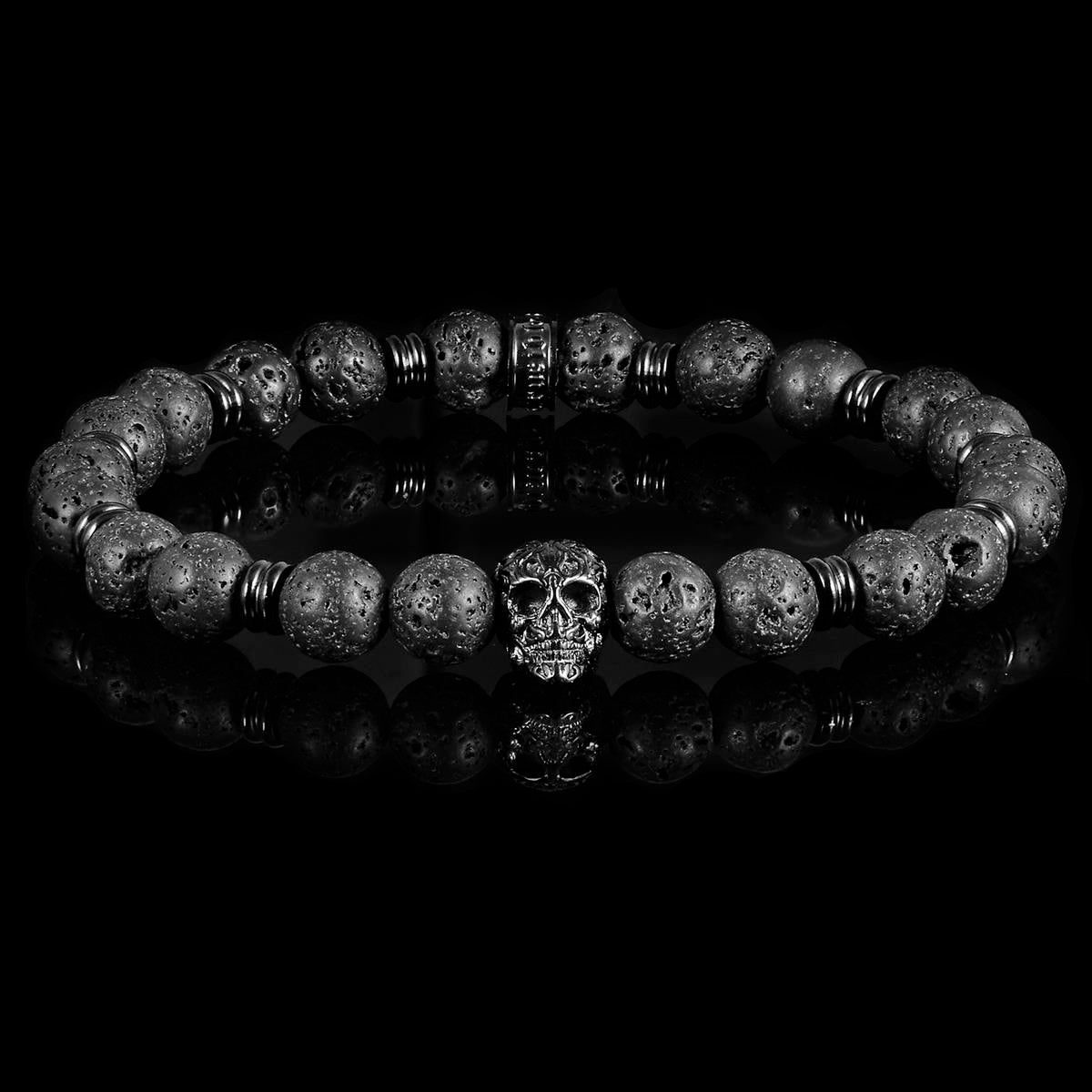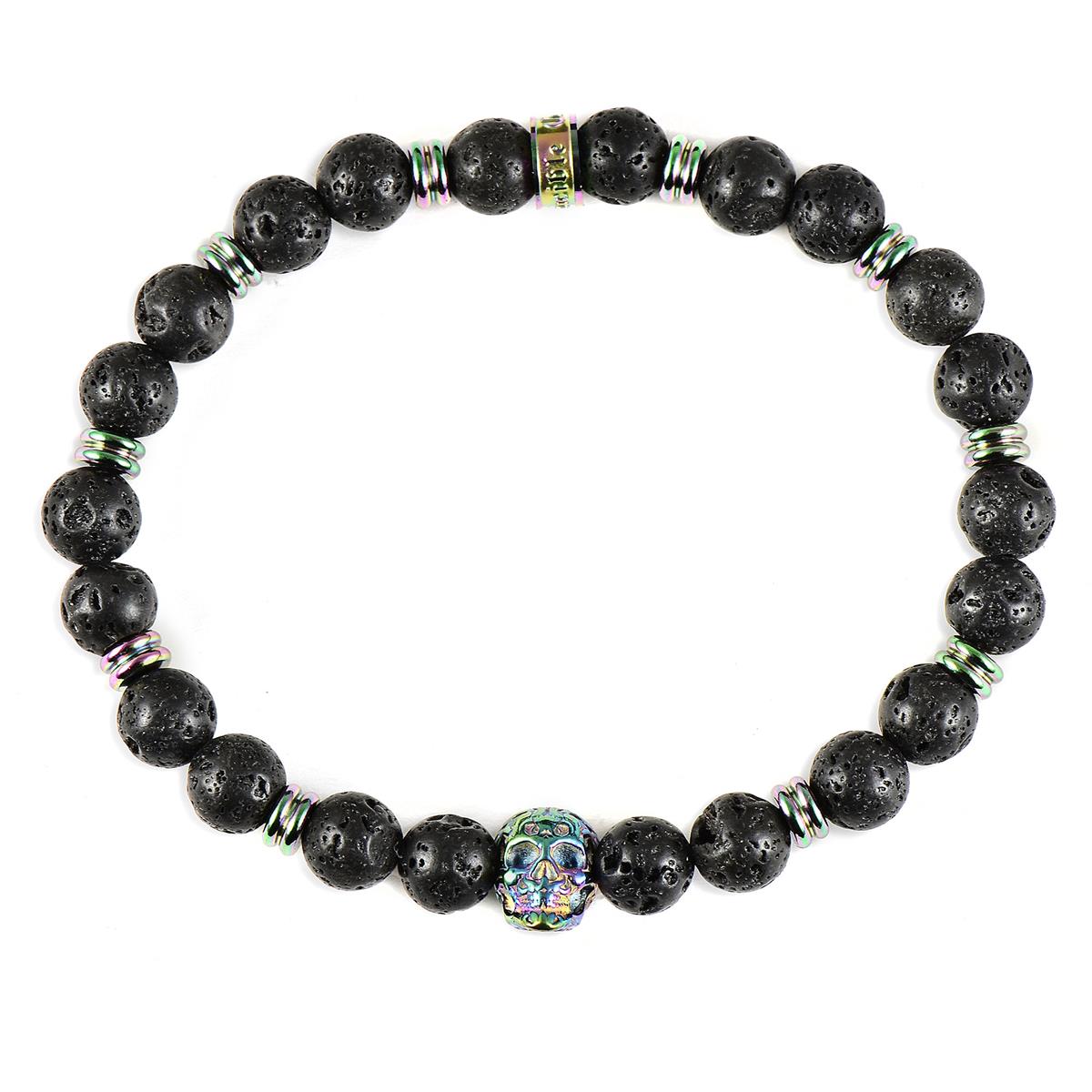 Wear this bold stone stretch bracelet and easily pair it with every look. The bracelet has 20 Lava stones contrasted by 10 steel spacer beads. The center of the bracelet has 1 skull bead and 1 steel bead spacer bead on the opposite end.
