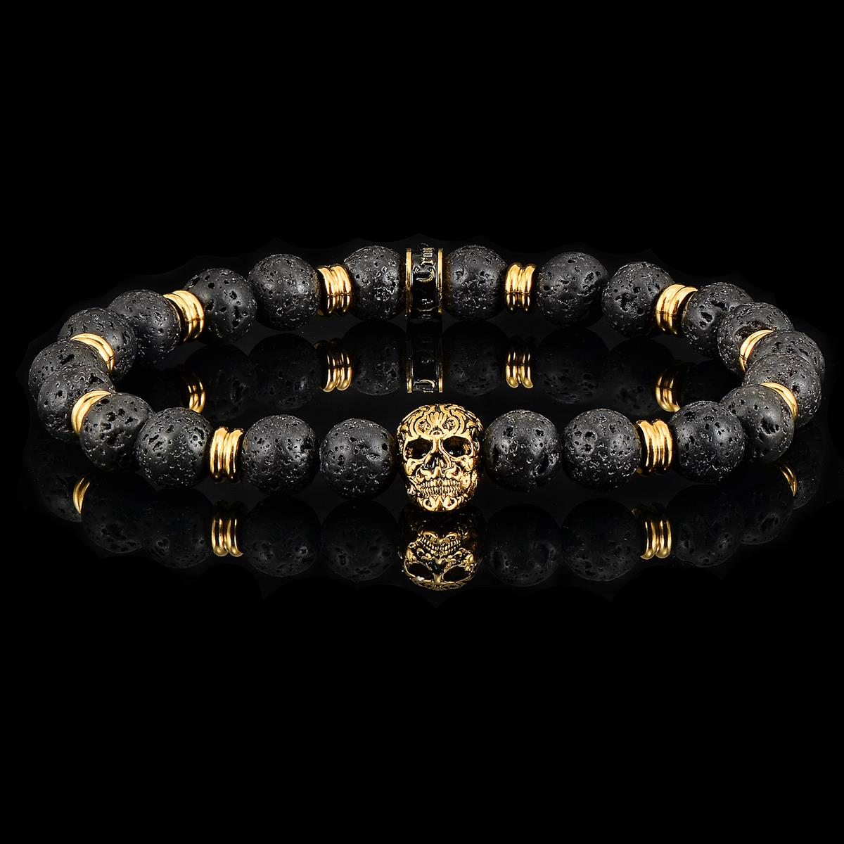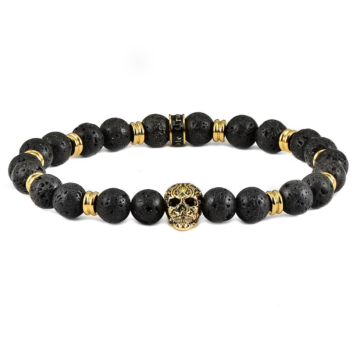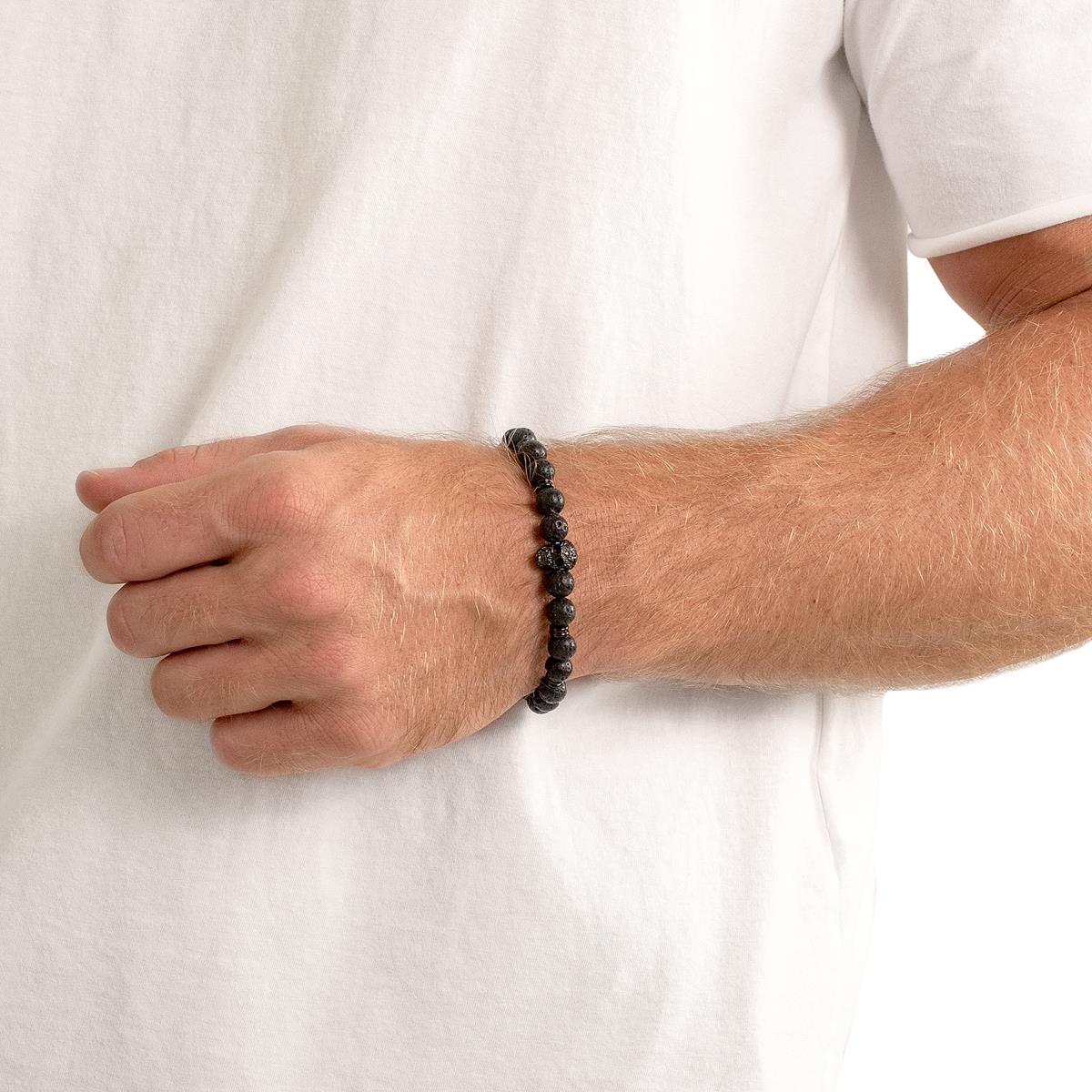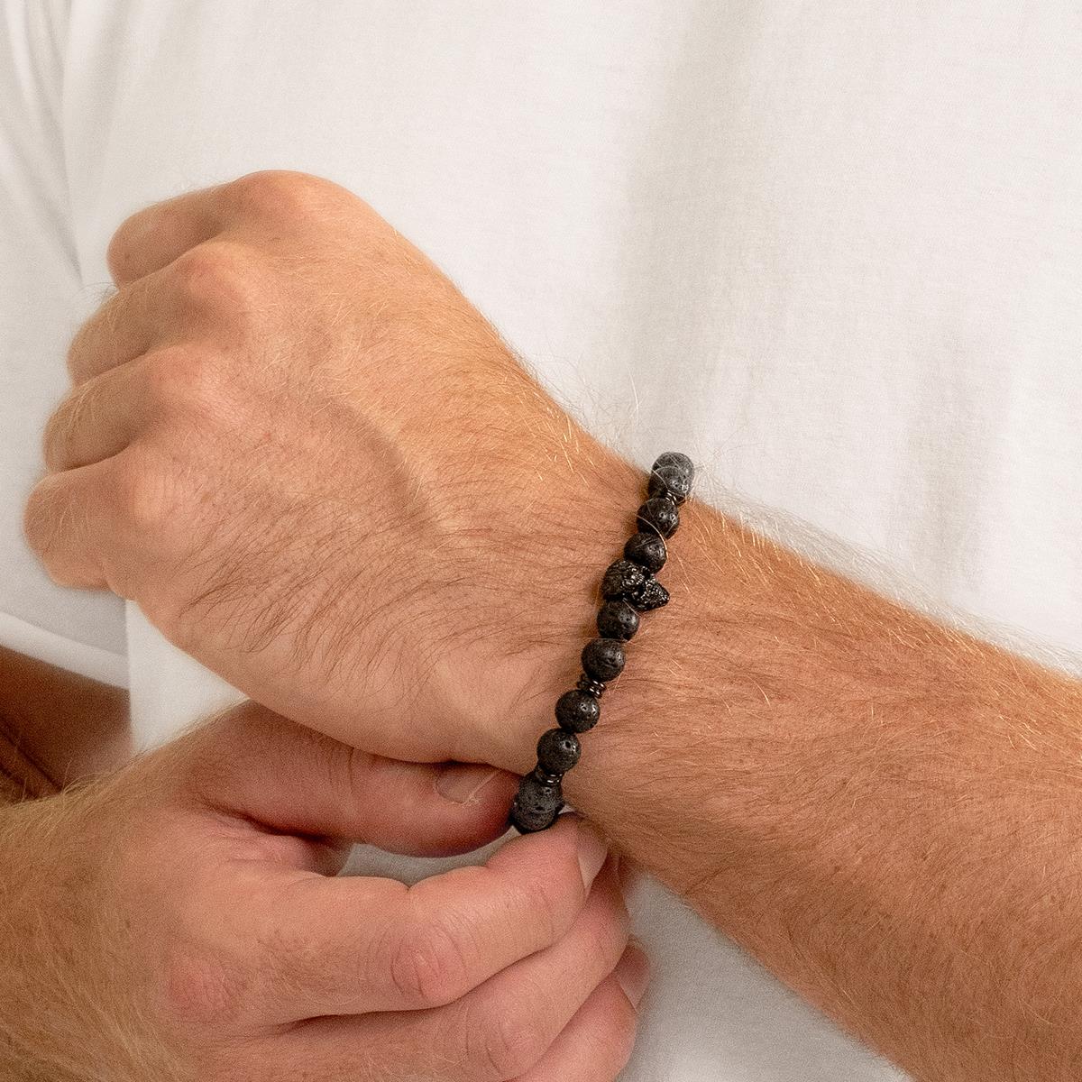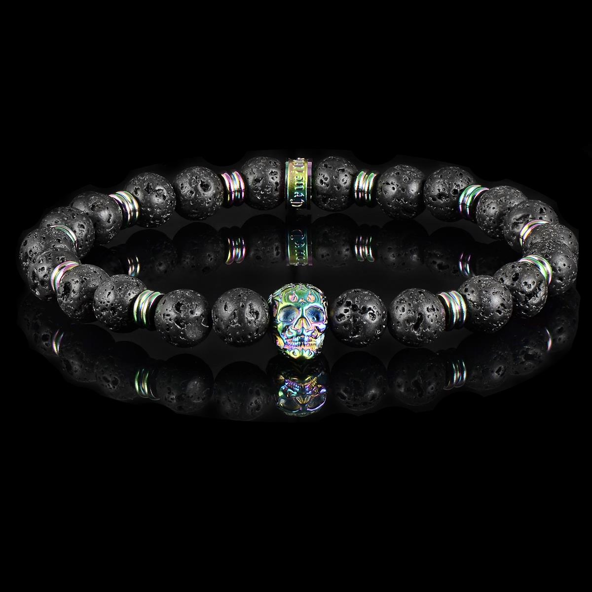Wear this bold stone stretch bracelet and easily pair it with every look. The bracelet has 20 Lava stones contrasted by 10 steel spacer beads. The center of the bracelet has 1 skull bead and 1 steel bead spacer bead on the opposite end.