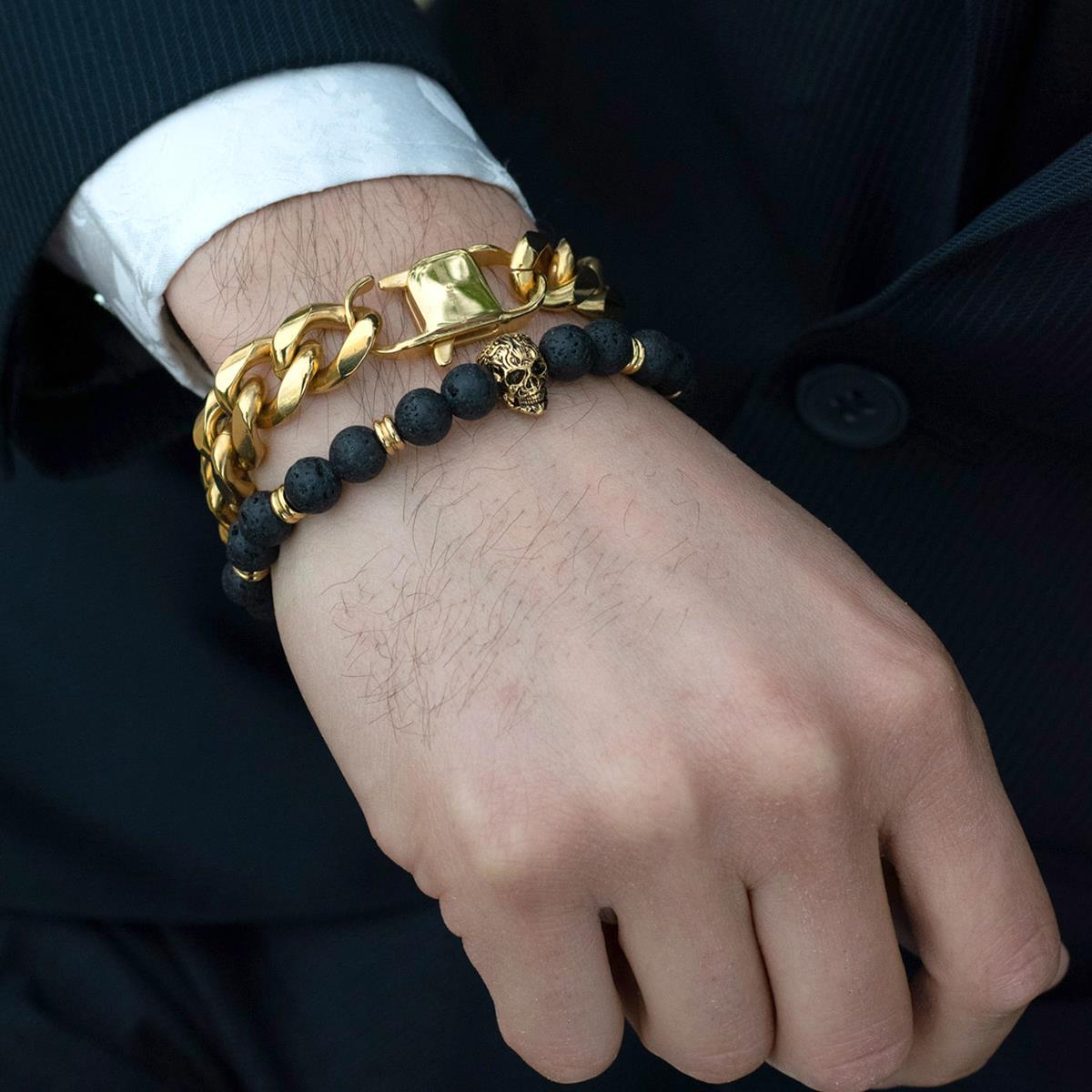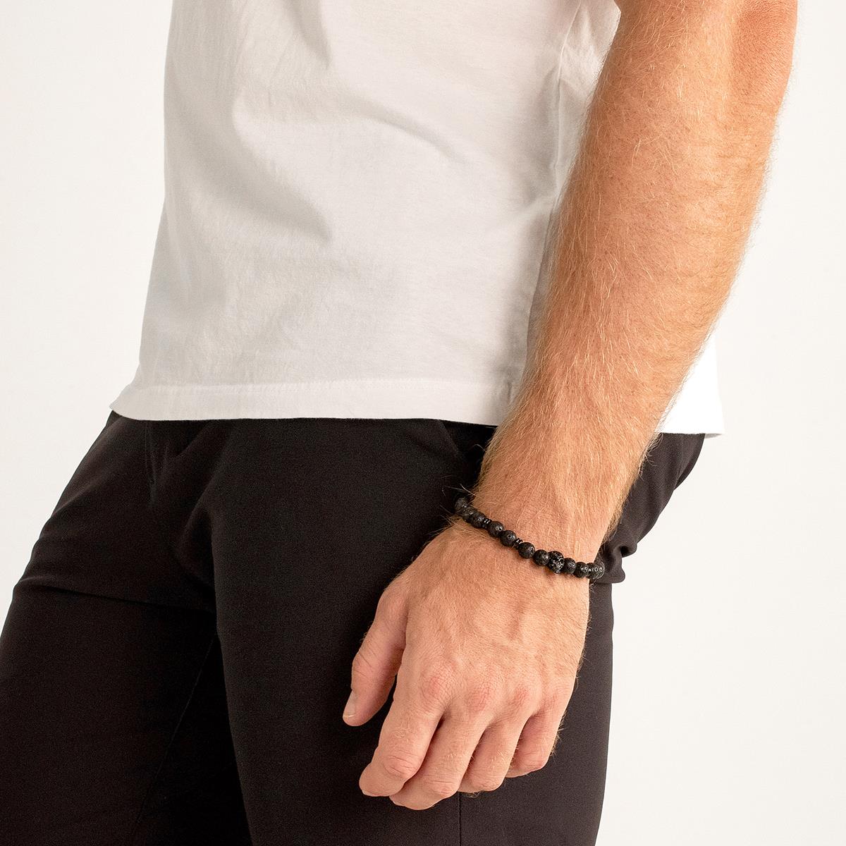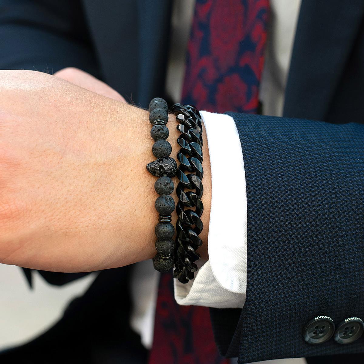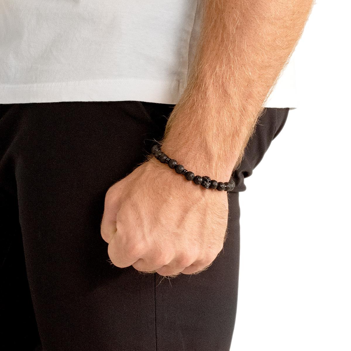 Wear this bold stone stretch bracelet and easily pair it with every look. The bracelet has 20 Lava stones contrasted by 10 steel spacer beads. The center of the bracelet has 1 skull bead and 1 steel bead spacer bead on the opposite end.