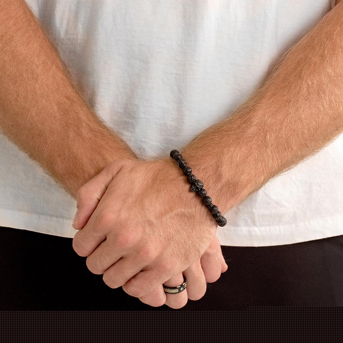 Men's Polished Steel Skull and Black Lava Stone Bead Stretch Bracelet (8mm)