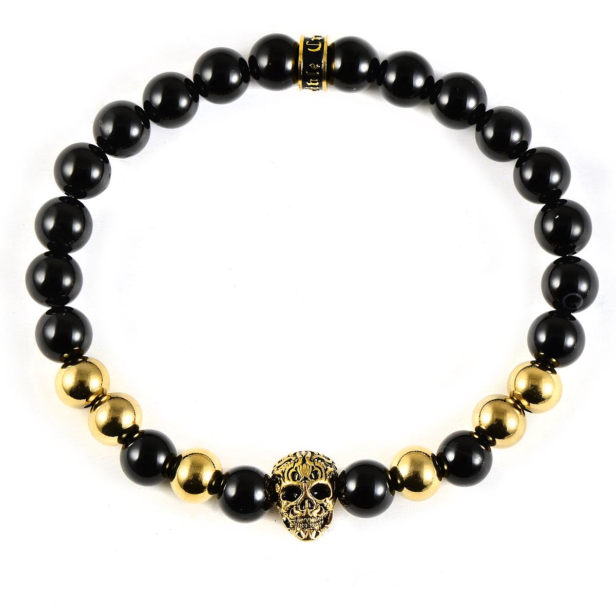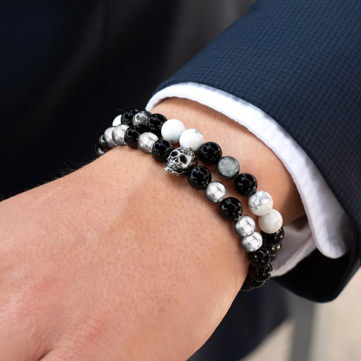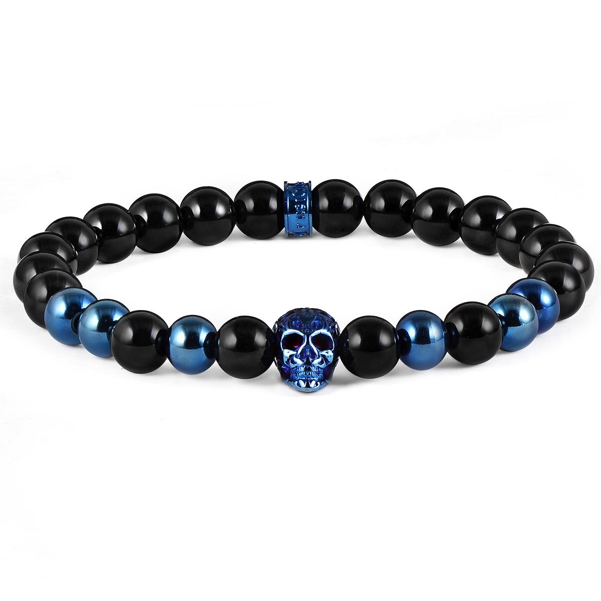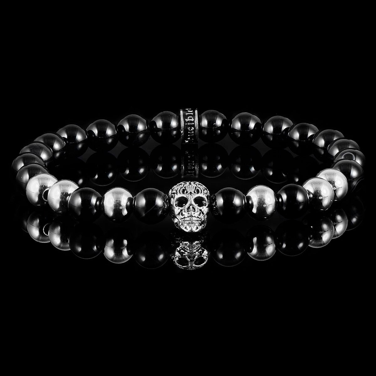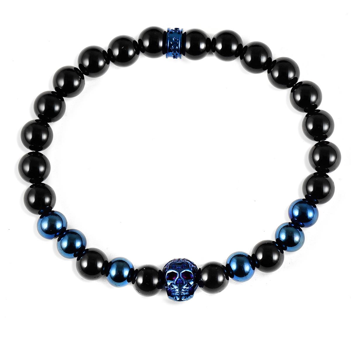 Wear this bold stone stretch bracelet and easily pair it with every look. The bracelet has 20 Onyx stones contrasted by 6 round steel beads. The center of the bracelet has 1 skull bead and 1 steel bead spacer bead on the opposite end.