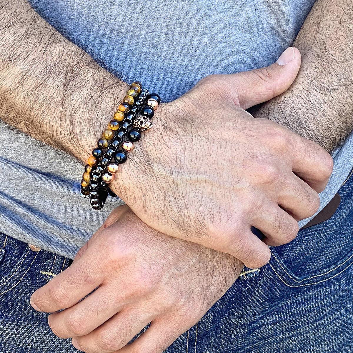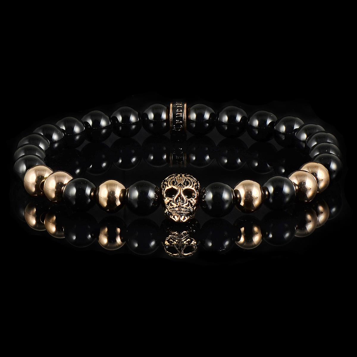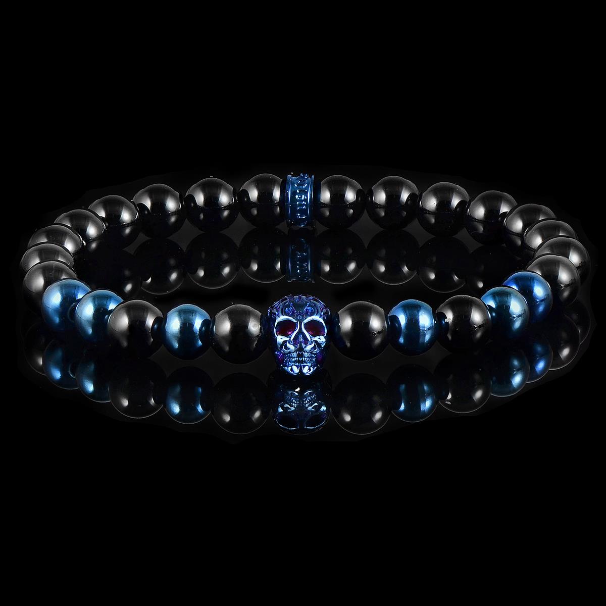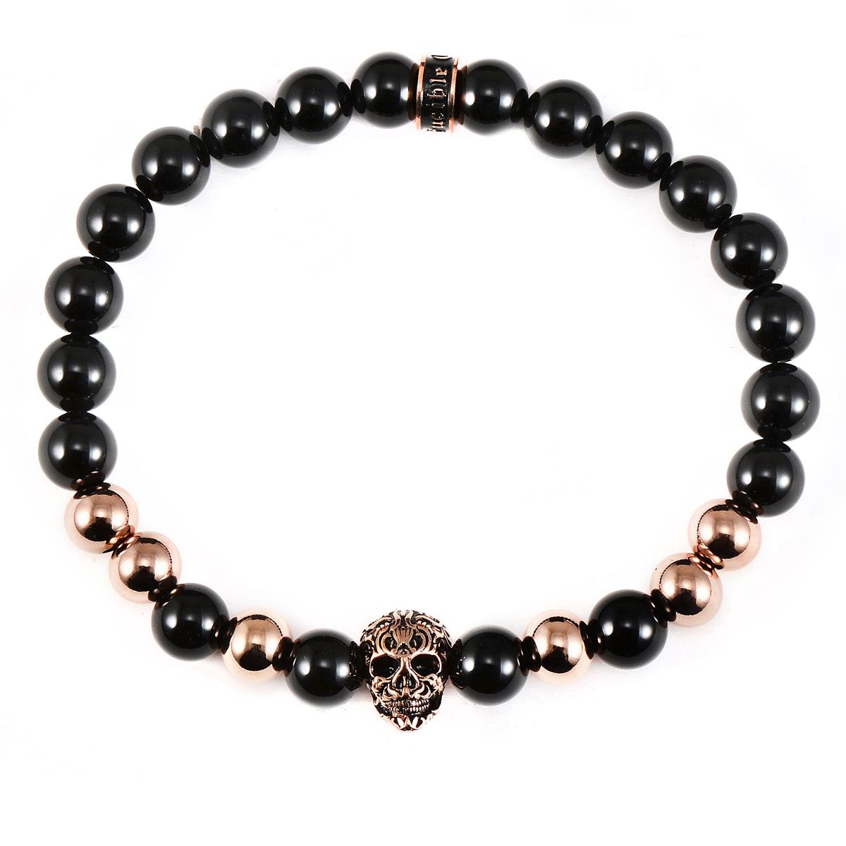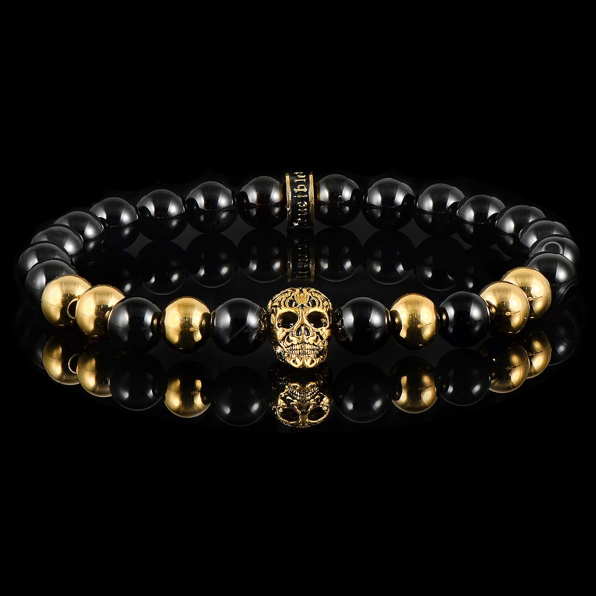 Wear this bold stone stretch bracelet and easily pair it with every look. The bracelet has 20 Onyx stones contrasted by 6 round steel beads. The center of the bracelet has 1 skull bead and 1 steel bead spacer bead on the opposite end.