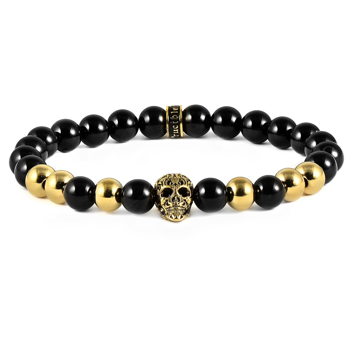 The skull bead, disc spacer and polished plated beads are crafted with durable stainless steel. The bracelet has a wearable length of 8 inches with an inner circumference of 7 inches. The stones have a width of 8 millimeters or 5/16 inches.