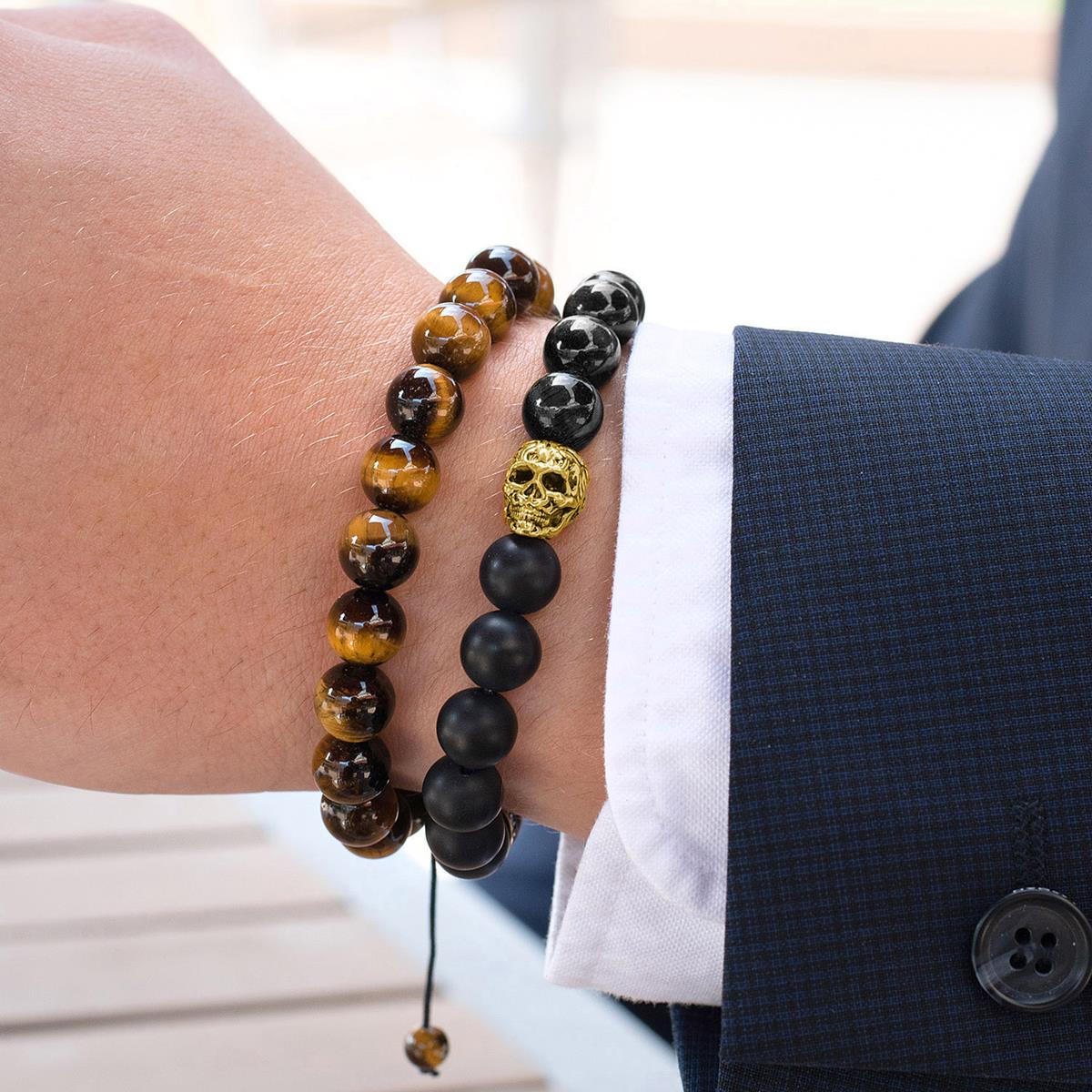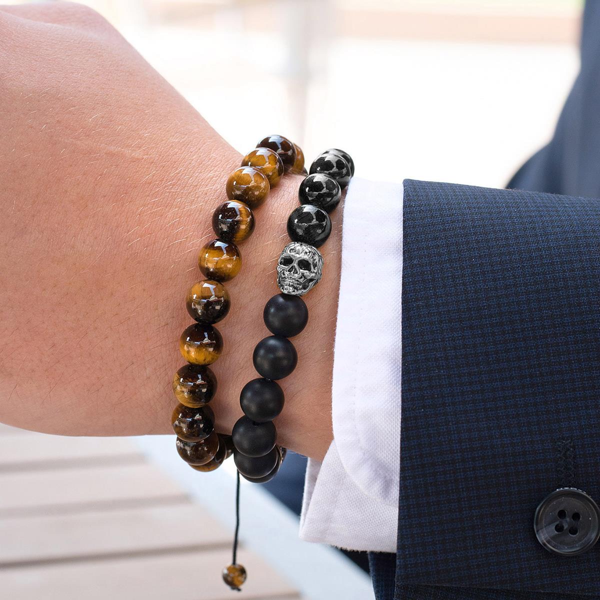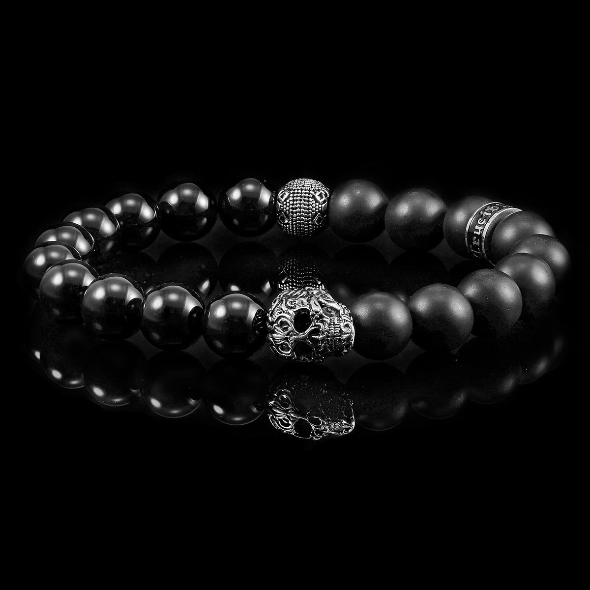 Men's Skull with Matte and Polished Onyx Stone Beads Stretch Bracelet