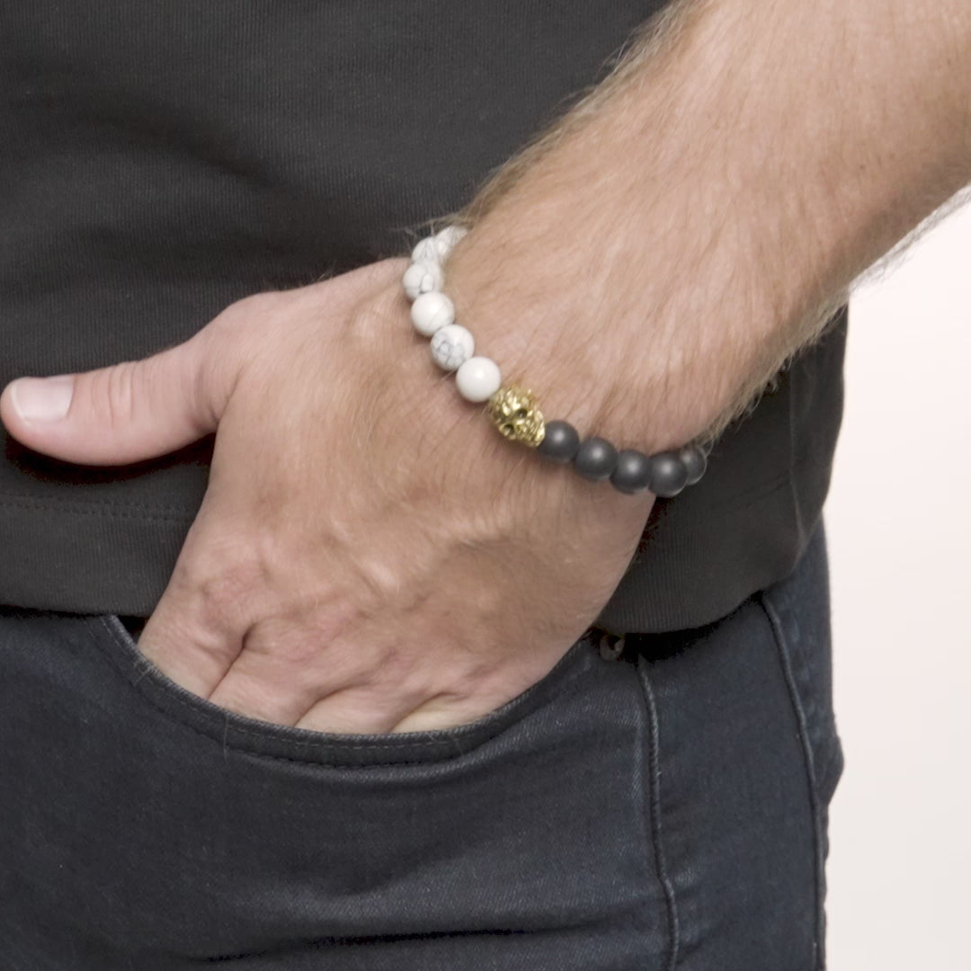 The bracelet has 9 matte Onyx stones contrasted by 9 polished Howlite stones. The center of the bracelet has 1 skull bead and 1 steel bead spacer bead on the opposite end. The skull bead, disc spacer and polished ball beads are crafted with durable stainless steel.