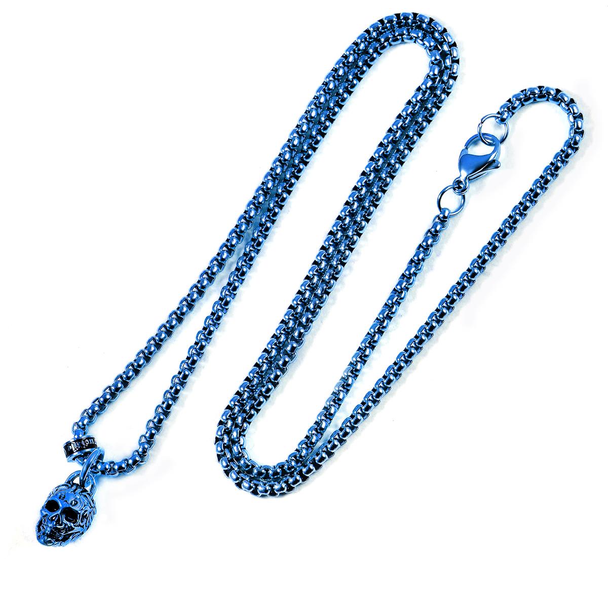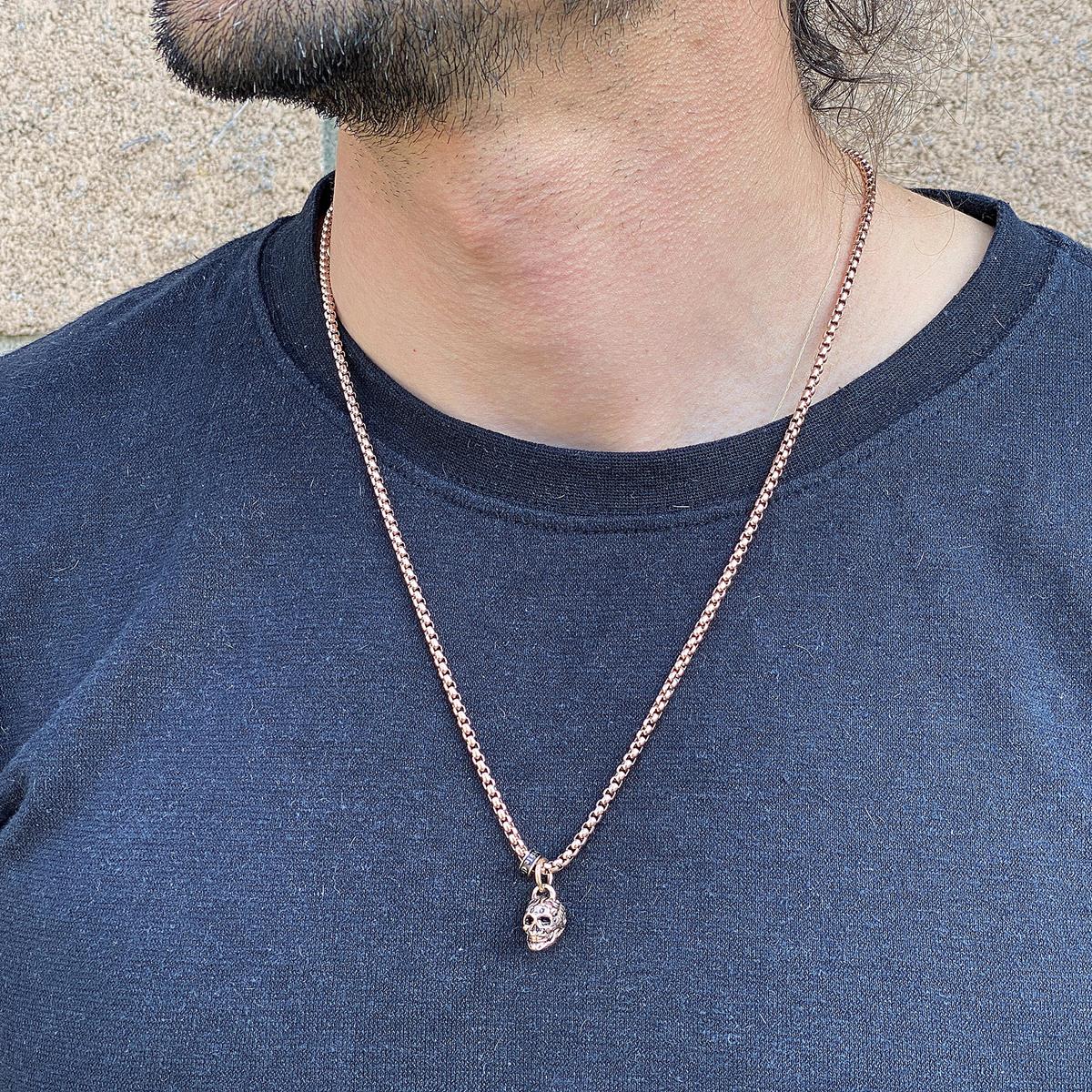 Measuring from the top of the jump ring to the bottom of the skull pendant, the length is 21mm or 13/16 inches. The length of the solid skull itself is 12mm or 1/2 inches. The width of the skull is 8mm or 5/16 inches. The pendant is paired with a 24 inch box chain that has a width of 3mm or 1/8 inches and fastens with a lobster claw clasp.