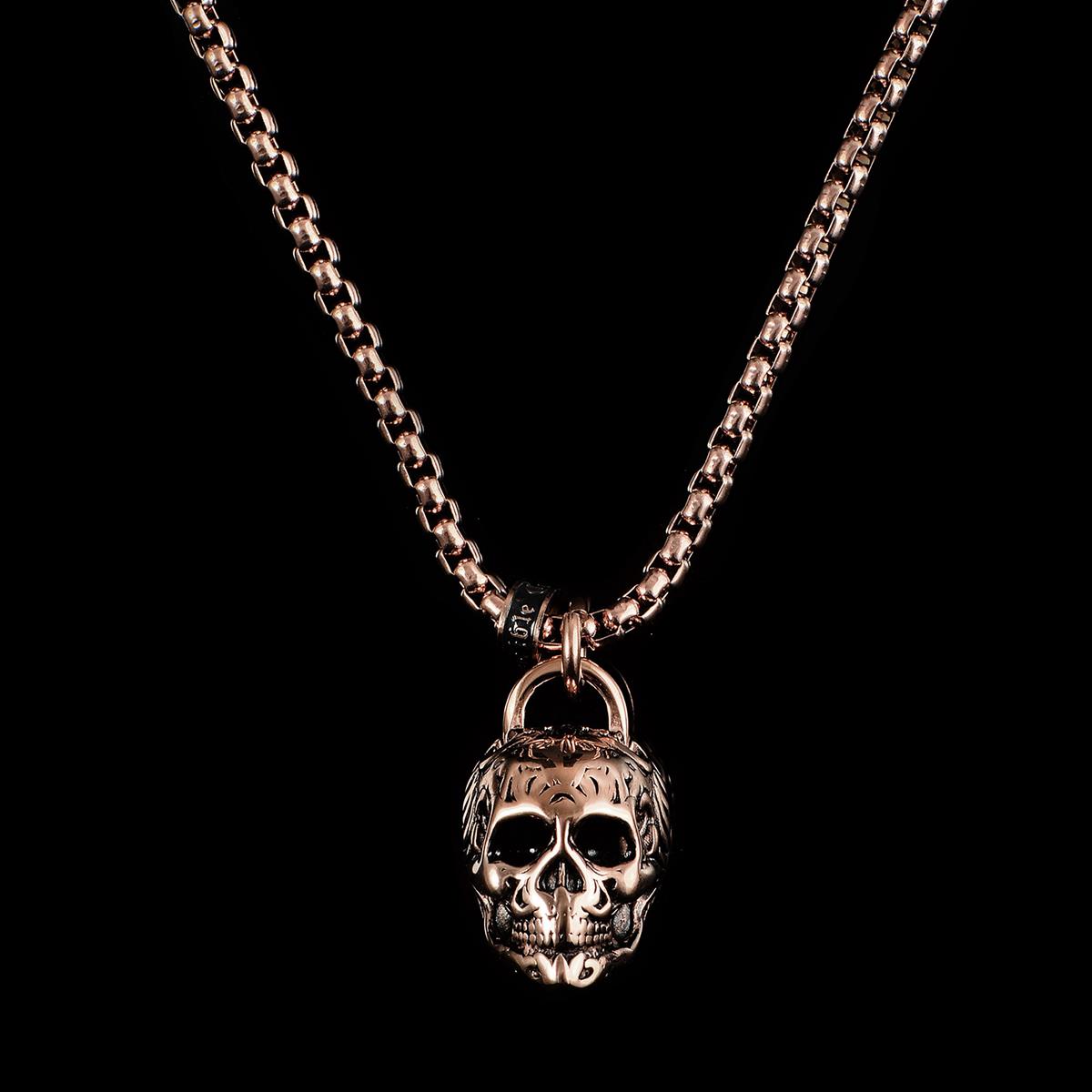 Measuring from the top of the jump ring to the bottom of the skull pendant, the length is 38mm or 1 1/2 inches. The length of the solid skull itself is 25mm or 1 inch. The width of the skull is 17mm or 11/16 inches. The pendant is paired with a 24 inch box chain that has a width of 4mm or 3/16 inches and fastens with a lobster claw clasp.