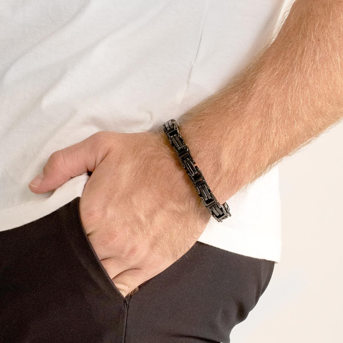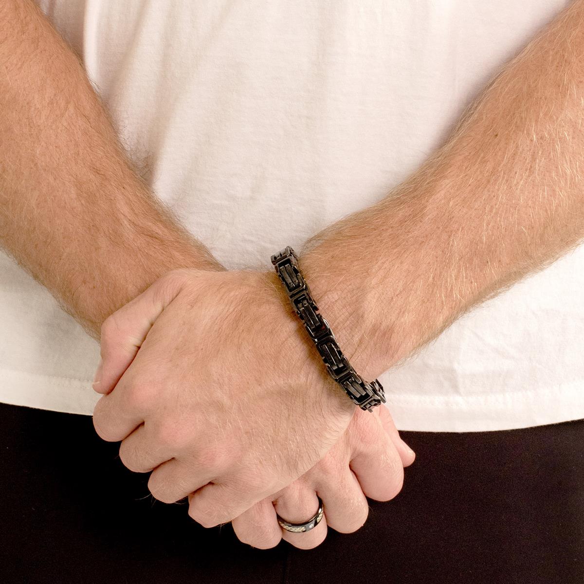 The bracelet has a width of 11 millimeters or 7/16 inches, and a thickness of 11 millimeters or 7/16 inches. The available lengths are 9 inches and 10 inches.
