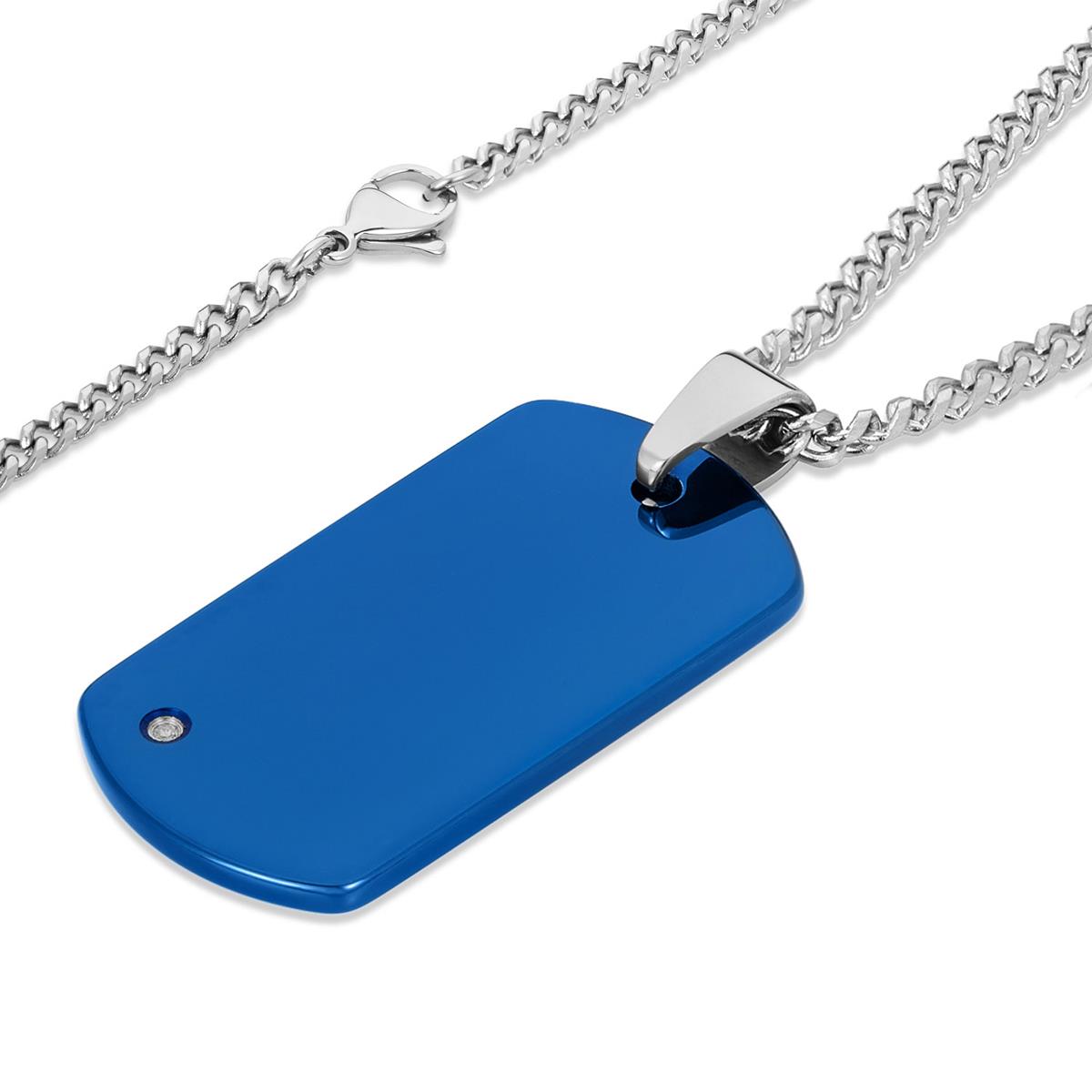Measuring from the top of the bail to the bottom of the dog tag, the length is 53mm or 2-1/16 inches. The length of the pendant is 43mm or 1-11/16 inches. The width of the dog tag is 24mm or 15/16 inches. The pendant is paired with a 24 inch chain and fastens with a lobster claw clasp.
