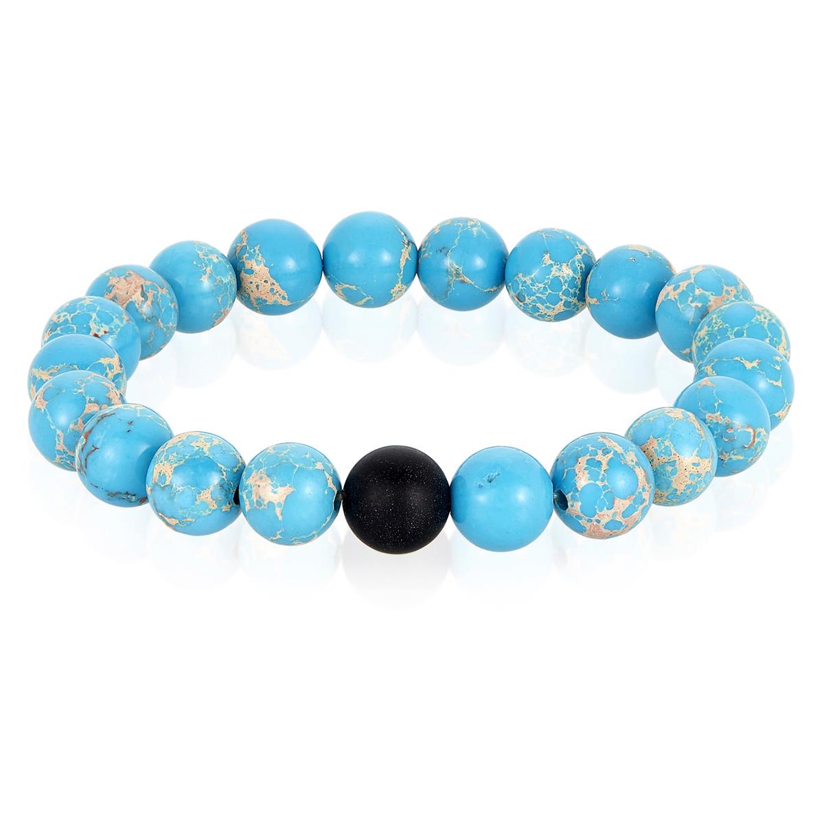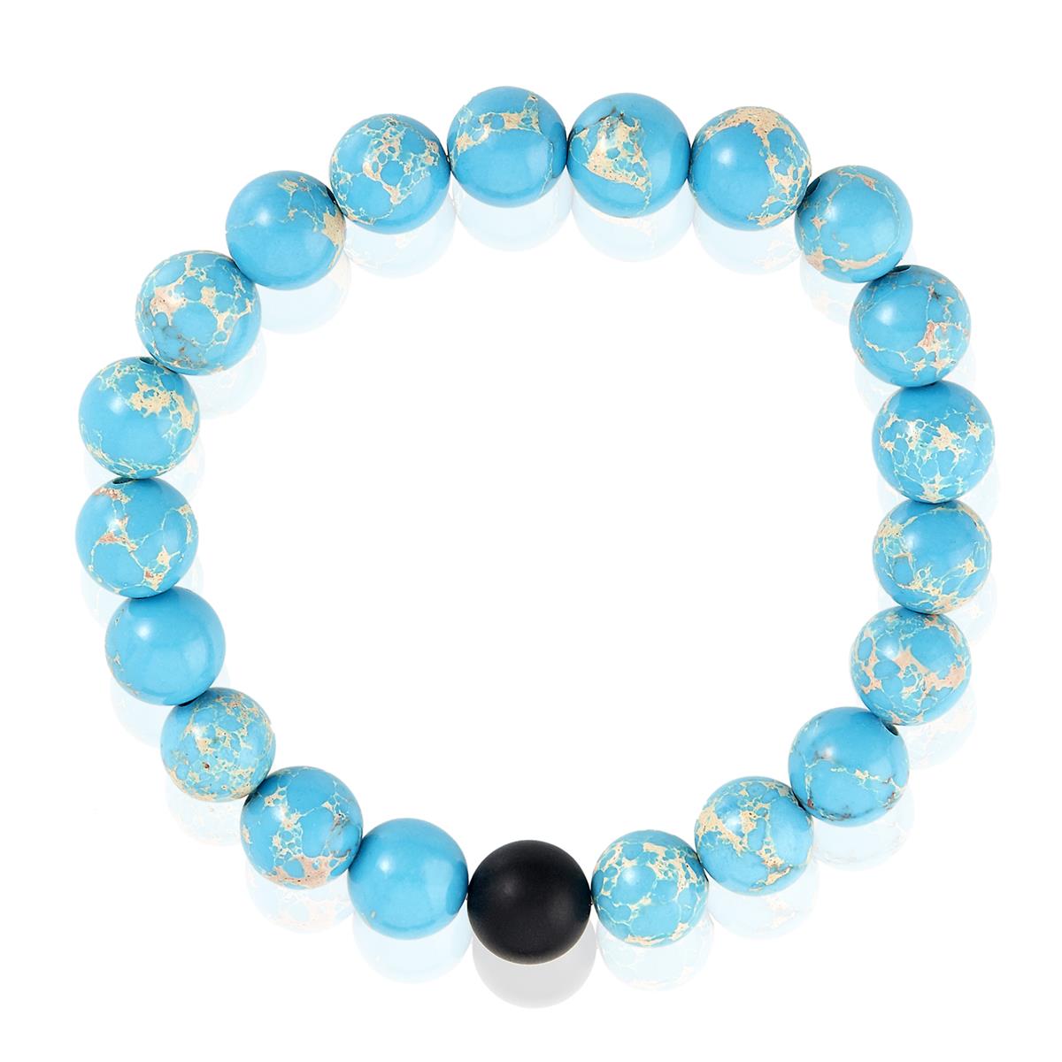 Add this stylish natural stone stretch bracelet to your choice of daily wear. The bracelet has a total of 20 polished Turquoise Imperial Jasper stones with 1 matte Onyx stone, for a total count of 21 stones in a 10mm width.